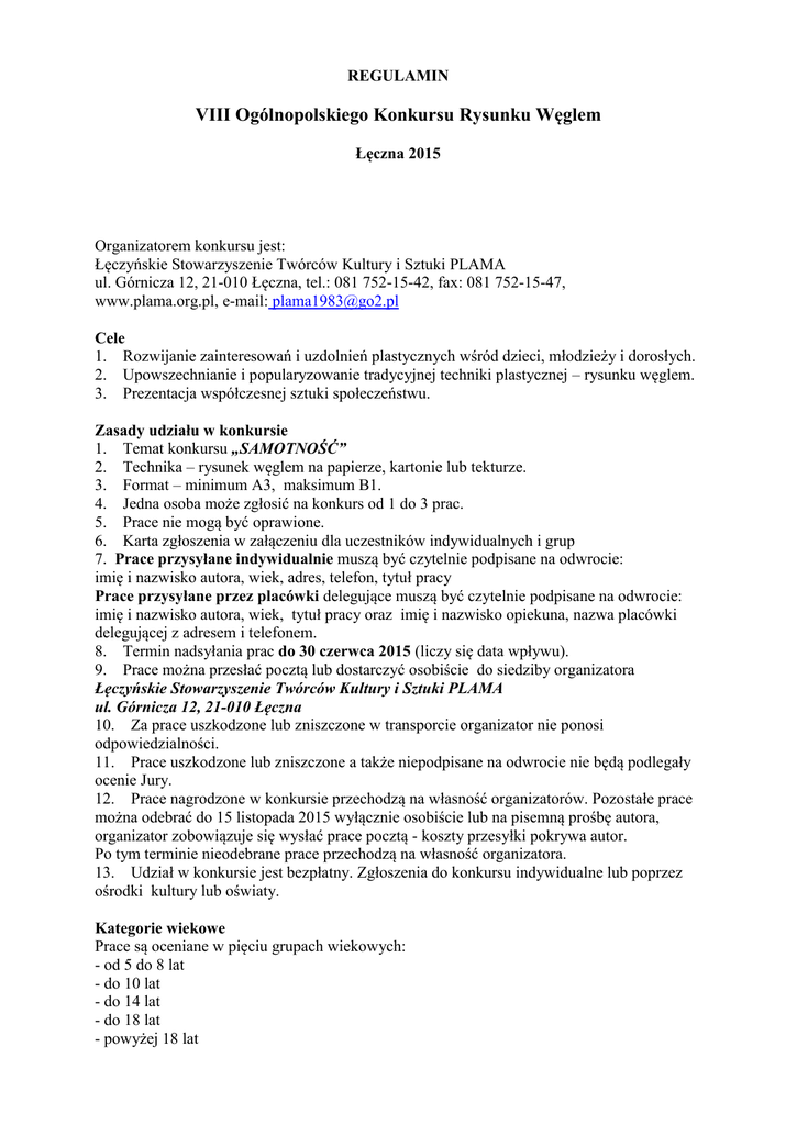 REGULAMIN VIII Ogólnopolskiego Konkursu Rysunku Węglem Łęczna 2015 Organizatorem konkursu jest: Łęczyńskie Stowarzyszenie Twórców Kultury i Sztuki PLAMA ul. Górnicza 12, 21-010 Łęczna, tel.: 081 752-15-42, fax: 081 752-15-47, www.plama.org.pl, e-mail: [email protected] Cele 1. Rozwijanie zainteresowań i uzdolnień plastycznych wśród dzieci, młodzieży i dorosłych. 2. Upowszechnianie i popularyzowanie tradycyjnej techniki plastycznej – rysunku węglem. 3. Prezentacja współczesnej sztuki społeczeństwu. Zasady udziału w konkursie 1. Temat konkursu „SAMOTNOŚĆ” 2. Technika – rysunek węglem na papierze, kartonie lub tekturze. 3. Format – minimum A3, maksimum B1. 4. Jedna osoba może zgłosić na konkurs od 1 do 3 prac. 5. Prace nie mogą być oprawione. 6. Karta zgłoszenia w załączeniu dla uczestników indywidualnych i grup 7. Prace przysyłane indywidualnie muszą być czytelnie podpisane na odwrocie: imię i nazwisko autora, wiek, adres, telefon, tytuł pracy Prace przysyłane przez placówki delegujące muszą być czytelnie podpisane na odwrocie: imię i nazwisko autora, wiek, tytuł pracy oraz imię i nazwisko opiekuna, nazwa placówki delegującej z adresem i telefonem. 8. Termin nadsyłania prac do 30 czerwca 2015 (liczy się data wpływu). 9. Prace można przesłać pocztą lub dostarczyć osobiście do siedziby organizatora Łęczyńskie Stowarzyszenie Twórców Kultury i Sztuki PLAMA ul. Górnicza 12, 21-010 Łęczna 10. Za prace uszkodzone lub zniszczone w transporcie organizator nie ponosi odpowiedzialności. 11. Prace uszkodzone lub zniszczone a także niepodpisane na odwrocie nie będą podlegały ocenie Jury. 12. Prace nagrodzone w konkursie przechodzą na własność organizatorów. Pozostałe prace można odebrać do 15 listopada 2015 wyłącznie osobiście lub na pisemną prośbę autora, organizator zobowiązuje się wysłać prace pocztą - koszty przesyłki pokrywa autor. Po tym terminie nieodebrane prace przechodzą na własność organizatora. 13. Udział w konkursie jest bezpłatny. Zgłoszenia do konkursu indywidualne lub poprzez ośrodki kultury lub oświaty. Kategorie wiekowe Prace są oceniane w pięciu grupach wiekowych: - od 5 do 8 lat - do 10 lat - do 14 lat - do 18 lat - powyżej 18 lat Jury 1. Prace zostaną ocenione przez Jury według następujących kryteriów: - zgodność z tematem konkursu i techniką /rysunek węglem/, - indywidualny i twórczy sposób wypowiedzi, 2. Obrady Jury odbędą się w terminie 1-9 lipca 2015 w skład Jury wejdą artyści z zagranicy biorący udział w XI Międzynarodowym Plenerze Artystycznym- Łęczna 2015 3. Jury zakwalifikuje prace do publikacji w formie pocztówki. 4. Wyniki oceny Jury są ostateczne. Nagrody 1. Jury przyznaje nagrody i wyróżnienia oraz kwalifikuje prace do wystawy pokonkursowej. W przypadku nagrodzenia więcej niż jednej pracy tego samego autora, otrzymuje on nagrodę za zestaw prac. 2. Jury zastrzega sobie inny podział nagród. 3. Pula nagród wynosi min. 3000 zł, z zastrzeżeniem, że jedna osoba nie może otrzymać nagrody powyżej 750 zł. 4. Nagrody zostaną przyznane w formie rzeczowej. 5. Wręczenie nagród nastąpi podczas otwarcia wystawy pokonkursowej w dniu 6 października 2015 r. W razie nieobecności podczas wręczenia nagród, zostaną one przesłane pocztą. Wystawa pokonkursowa 1. Nagrodzone i wyróżnione prace zostaną zaprezentowane podczas wystawy pokonkursowej w dniu 6 października 2015 r. o godz. 13:00 w Osiedlowym Domu Kultury ul. Górnicza 12 w Łęcznej. 2. Podczas wernisażu nastąpi wręczenie nagród oraz prezentacja pocztówek z reprodukcjami prac zakwalifikowanymi przez Jury. 3. Wyniki konkursu i zdjęcia nagrodzonych prac oraz z relacji z wystawy pokonkursowej będą opublikowane na stronie internetowej: organizatora www.plama.org.pl , Centrum Kultury www.ck.leczna.pl oraz Urzędu Miasta www.leczna.pl, Postanowienia końcowe 1. Zgłoszenie pracy na konkurs jest równoznaczne z akceptacją niniejszego regulaminu i wyrażeniem zgody na umieszczenie danych osobowych autora w bazie danych organizatora i przetwarzanie ich do celów związanych z konkursem oraz oświadczeniem o posiadaniu praw autorskich do zgłoszonych prac. 2. Organizatorzy zastrzegają sobie prawo do bezpłatnej reprodukcji nadesłanych prac na potrzeby wydania pokonkursowych pocztówek, oraz w celach reklamowych w prasie, telewizji i internecie oraz innych publikacjach bez żadnych ograniczeń terytorialnych. 3. Ostateczna interpretacja regulaminu należy do organizatora konkursu. 4. Niniejszy regulamin jest dostępny w siedzibie organizatora i na stronach internetowych: www.ck.leczna.pl , szczegółowe informacje o konkursie można uzyskać pod nr telefonu: 81 752-15-42 lub e-mail: [email protected] Konkurs realizowany przy wsparciu finansowym: Gminy Łęczna i Powiatu Łęczyńskiego.