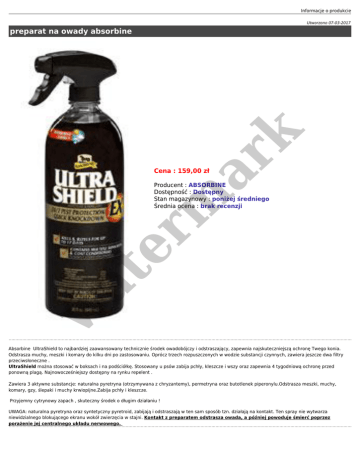 Informacje o produkcie Utworzono 07-03-2017 er m ar k preparat na owady absorbine Cena : 159,00 zł w at Producent : ABSORBINE Dostępność : Dostępny Stan magazynowy : poniżej średniego Średnia ocena : brak recenzji Absorbine UltraShield to najbardziej zaawansowany technicznie środek owadobójczy i odstraszający, zapewnia najskuteczniejszą ochronę Twego konia. Odstrasza muchy, meszki i komary do kilku dni po zastosowaniu. Oprócz trzech rozpuszczonych w wodzie substancji czynnych, zawiera jeszcze dwa filtry przeciwsłoneczne . UltraShield można stosować w boksach i na podściółkę. Stosowany u psów zabija pchły, kleszcze i wszy oraz zapewnia 4 tygodniową ochronę przed ponowną plagą. Najnowocześniejszy dostępny na rynku repelent . Zawiera 3 aktywne substancje: naturalna pyretryna (otrzymywana z chryzantemy), permetryna oraz butotlenek piperonylu.Odstrasza meszki, muchy, komary, gzy, ślepaki i muchy krwiopijne.Zabija pchły i kleszcze. Przyjemny cytrynowy zapach , skuteczny środek o długim działaniu ! UWAGA: naturalna pyretryna oraz syntetyczny pyretroid, zabijają i odstraszają w ten sam sposób tzn. działają na kontakt. Ten spray nie wytwarza niewidzialnego blokującego ekranu wokół zwierzęcia w stajni. Kontakt z preparatem odstrasza owada, a później powoduje śmierć poprzez porażenie jej centralnego układu nerwowego. Dostępne opcje preparat na owady absorbine w at er m ar k pojemność: 940 ml.