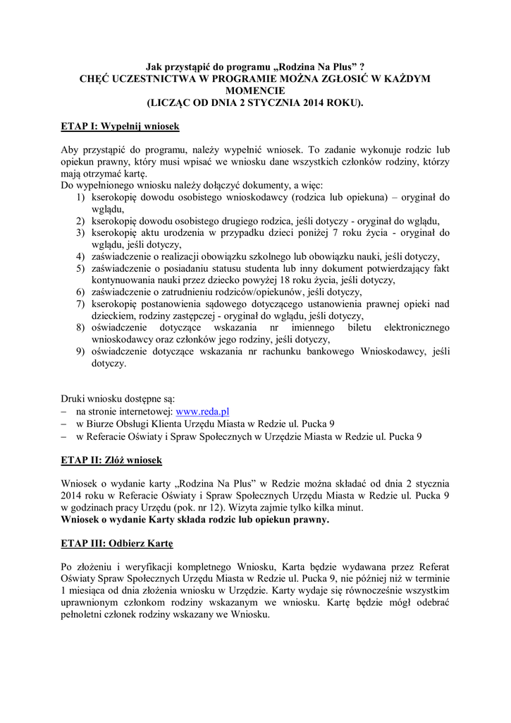 Jak przystąpić do programu „Rodzina Na Plus” ? CHĘĆ UCZESTNICTWA W PROGRAMIE MOŻNA ZGŁOSIĆ W KAŻDYM MOMENCIE (LICZĄC OD DNIA 2 STYCZNIA 2014 ROKU). ETAP I: Wypełnij wniosek Aby przystąpić do programu, należy wypełnić wniosek. To zadanie wykonuje rodzic lub opiekun prawny, który musi wpisać we wniosku dane wszystkich członków rodziny, którzy mają otrzymać kartę. Do wypełnionego wniosku należy dołączyć dokumenty, a więc: 1) kserokopię dowodu osobistego wnioskodawcy (rodzica lub opiekuna) – oryginał do wglądu, 2) kserokopię dowodu osobistego drugiego rodzica, jeśli dotyczy - oryginał do wglądu, 3) kserokopię aktu urodzenia w przypadku dzieci poniżej 7 roku życia - oryginał do wglądu, jeśli dotyczy, 4) zaświadczenie o realizacji obowiązku szkolnego lub obowiązku nauki, jeśli dotyczy, 5) zaświadczenie o posiadaniu statusu studenta lub inny dokument potwierdzający fakt kontynuowania nauki przez dziecko powyżej 18 roku życia, jeśli dotyczy, 6) zaświadczenie o zatrudnieniu rodziców/opiekunów, jeśli dotyczy, 7) kserokopię postanowienia sądowego dotyczącego ustanowienia prawnej opieki nad dzieckiem, rodziny zastępczej - oryginał do wglądu, jeśli dotyczy, 8) oświadczenie dotyczące wskazania nr imiennego biletu elektronicznego wnioskodawcy oraz członków jego rodziny, jeśli dotyczy, 9) oświadczenie dotyczące wskazania nr rachunku bankowego Wnioskodawcy, jeśli dotyczy. Druki wniosku dostępne są: na stronie internetowej: www.reda.pl w Biurze Obsługi Klienta Urzędu Miasta w Redzie ul. Pucka 9 w Referacie Oświaty i Spraw Społecznych w Urzędzie Miasta w Redzie ul. Pucka 9 ETAP II: Złóż wniosek Wniosek o wydanie karty „Rodzina Na Plus” w Redzie można składać od dnia 2 stycznia 2014 roku w Referacie Oświaty i Spraw Społecznych Urzędu Miasta w Redzie ul. Pucka 9 w godzinach pracy Urzędu (pok. nr 12). Wizyta zajmie tylko kilka minut. Wniosek o wydanie Karty składa rodzic lub opiekun prawny. ETAP III: Odbierz Kartę Po złożeniu i weryfikacji kompletnego Wniosku, Karta będzie wydawana przez Referat Oświaty Spraw Społecznych Urzędu Miasta w Redzie ul. Pucka 9, nie później niż w terminie 1 miesiąca od dnia złożenia wniosku w Urzędzie. Karty wydaje się równocześnie wszystkim uprawnionym członkom rodziny wskazanym we wniosku. Kartę będzie mógł odebrać pełnoletni członek rodziny wskazany we Wniosku. Masz już Kartę? Zobacz co dalej: 1) jeśli rodzice/opiekunowie są zatrudnieni i korzystają z biletu miesięcznego na pociąg lub autobus – otrzymają zwrot 50% kosztu biletu miesięcznego, 2) uczniowie/studenci dojeżdżający do miejsca nauki i korzystający z biletu miesięcznego na pociąg lub autobus – otrzymują zwrot 50% kosztu biletu miesięcznego, 3) aby otrzymać zwrot 50% kosztów biletów miesięcznych rodzic/opiekun prawny powinien każdego miesiąca złożyć wniosek o zwrot kosztów i załączyć kserokopię zakupionych imiennych biletów miesięcznych lub fakturę za doładowanie okresowego biletu w formie elektronicznej, 4) zwroty dokonywane będą w formie bezgotówkowej, dlatego należy dostarczyć do Referatu Oświaty i Spraw Społecznych numer rachunku bankowego, na który zostanie wysłana kwota zwrotu, 5) Karta „Rodzina Na Plus” w Redzie jest ważna z dowodem osobistym lub innym dokumentem potwierdzającym tożsamość (dla dzieci uczących się takim dokumentem może być legitymacja szkolna, dzieci do 7 roku życia, nie objęte obowiązkiem szkolnym, mogą korzystać ze zniżek na podstawie własnej Karty wyłącznie w obecności rodzica/opiekuna lub innego uprawnionego do korzystania ze zniżek członka rodziny, który posiada przy sobie dokument tożsamości i własną Kartę), 6) korzystasz bez opłat z lodowiska na terenie MOSiR w Redzie, 7) 50% dla korzystających z odpłatnych zajęć organizowanych w MDK-u i MOSiR-ze w Redzie - wszystkie instytucje lub firmy, które oferują zniżki dla posiadaczy Kart, są specjalnie oznaczone, w witrynie widnieje informacja o udziale w programie więc w tym miejscu oferowana jest zniżka, 8) oglądaj zakładkę „Partnerzy Programu Rodzina Na Plus” – tutaj znajduje się aktualna lista Partnerów programu, 9) pamiętaj o dacie ważności Karty, jeśli chcesz dalej korzystać ze zniżek, a do końca okresu ważności został miesiąc to złóż w Urzędzie Miasta w Redzie wniosek o wydanie nowej Karty. Karta wydawana jest na okres do końca 2014 roku