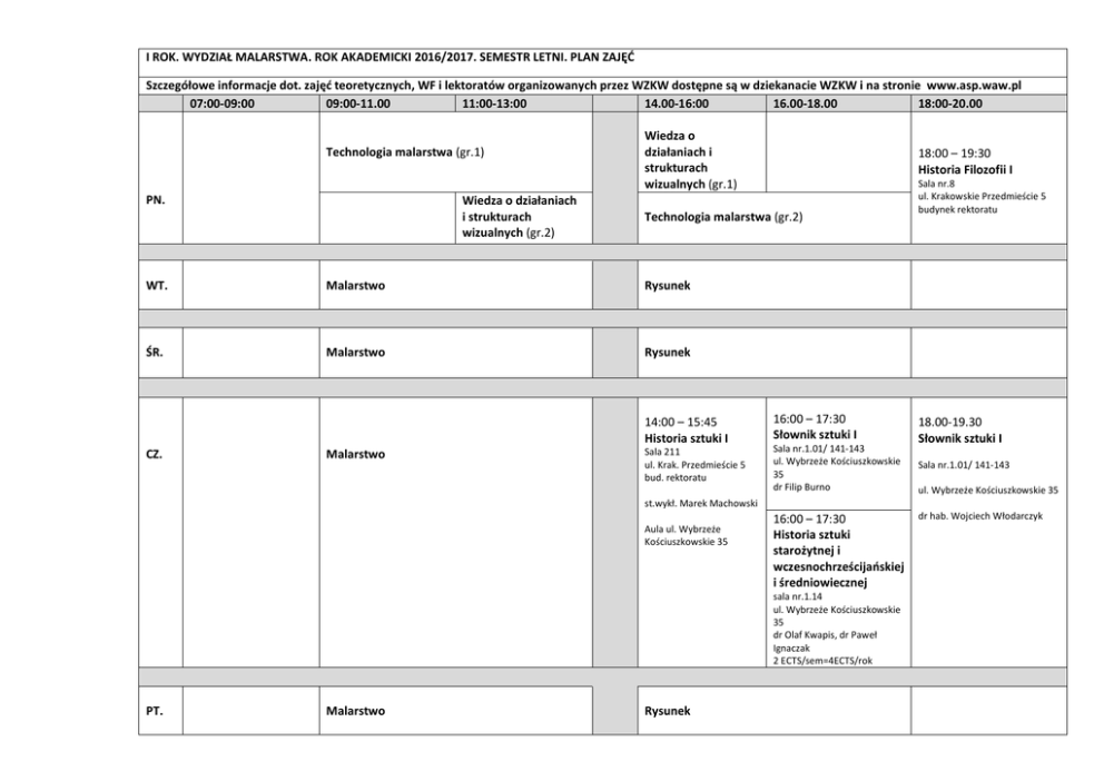 I ROK. WYDZIAŁ MALARSTWA. ROK AKADEMICKI 2016/2017. SEMESTR LETNI. PLAN ZAJĘĆ Szczegółowe informacje dot. zajęć teoretycznych, WF i lektoratów organizowanych przez WZKW dostępne są w dziekanacie WZKW i na stronie www.asp.waw.pl 07:00-09:00 09:00-11.00 11:00-13:00 14.00-16:00 16.00-18.00 18:00-20.00 Technologia malarstwa (gr.1) PN. Wiedza o działaniach i strukturach wizualnych (gr.2) Wiedza o działaniach i strukturach wizualnych (gr.1) Technologia malarstwa (gr.2) WT. Malarstwo Rysunek ŚR. Malarstwo Rysunek 14:00 – 15:45 Historia sztuki I CZ. Malarstwo 18:00 – 19:30 Historia Filozofii I Sala 211 ul. Krak. Przedmieście 5 bud. rektoratu 16:00 – 17:30 Słownik sztuki I Sala nr.1.01/ 141-143 ul. Wybrzeże Kościuszkowskie 35 dr Filip Burno Sala nr.8 ul. Krakowskie Przedmieście 5 budynek rektoratu 18.00-19.30 Słownik sztuki I Sala nr.1.01/ 141-143 ul. Wybrzeże Kościuszkowskie 35 st.wykł. Marek Machowski Aula ul. Wybrzeże Kościuszkowskie 35 16:00 – 17:30 Historia sztuki starożytnej i wczesnochrześcijańskiej i średniowiecznej sala nr.1.14 ul. Wybrzeże Kościuszkowskie 35 dr Olaf Kwapis, dr Paweł Ignaczak 2 ECTS/sem=4ECTS/rok PT. Malarstwo Rysunek dr hab. Wojciech Włodarczyk Student I Roku ma możliwość wyboru prowadzącego zajęcia ze Słownika sztuki i Historia sztuki I w czwartki w godz. 14.00-19.30 Więcej informacji na stronie: https://wzkw.asp.waw.pl/plan-zajec-katedry-historii-sztuki-i-teorii-kultury-2016-2017/ Student I Roku ma obowiązek zaliczyć: Historię Filozofii I, Historię Sztuki I, Słownik Sztuki, lektorat języka obcego (2 godz/tydz), zajęcia w Studium Wychowania Fizycznego(2 godz/tydz) Plan WF dla ASP, I Rok.: https://wzkw.asp.waw.pl/sport-na-asp/ Szczegółowy plan lektoratów języka obcego zawiera plan przedmiotów teoretycznych, lektoraty odbywają się w godz. 7.30-9.00 od wt. do pt.: https://wzkw.asp.waw.pl/plan-zajec-katedry-historii-sztuki-i-teorii-kultury-2016-2017/ II ROK. WYDZIAŁ MALARSTWA. ROK AKADEMICKI 2016/2017. SEMESTR ZIMOWY. PLAN ZAJĘĆ Szczegółowe informacje dot. zajęć teoretycznych i lektoratów organizowanych przez WZKW dostępne są w dziekanacie WZKW i na stronie www.asp.waw.pl 07:00-09:00 09:00-11.00 11:00-13:00 14.00-16:00 PN. Malarstwo Specjalizacja dodatkowa WT. Malarstwo Rysunek ŚR. Malarstwo Rysunek 16.00-18.00 16:00 – 17:30 Historia filozofii II Sala 1.01/ 141-143 ul. Krakowskie Przedmieście 5 budynek rektoratu dr. Piotr Teodorczuk 18:00-20.00 Specjalizacja dodatkowa cd. Historia sztuki II CZ. Malarstwo Rysunek Sala nr. 211 ul Krakowskie Przedmieście 5 budynek rektoratu dr Marcin Zgliński 18:00 – 21:00 Propedeutyka projektowania graficznego Sala nr.31 Wydział Grafiki zaj. w grupach, raz na 2 tyg. PT. Technologia malarstwa (gr. 1) Technologia malarstwa (gr. 2) Wiedza o działaniach i strukturach wizualnych (gr. 2) Wiedza o działaniach i strukturach wizualnych (gr. 1) III ROK. WYDZIAŁ MALARSTWA. ROK AKADEMICKI 2016/2017. SEMESTR ZIMOWY. PLAN ZAJĘĆ Szczegółowe informacje dot. zajęć teoretycznych i lektoratów organizowanych przez WZKW dostępne są w dziekanacie WZKW i na stronie www.asp.waw.pl 07:00-09:00 09:00-11.00 11:00-13:00 14.00-16:00 16.00-18.00 16:30 – 18:00 Historia sztuki III 18:00-20.00 18:15 – 19:45 Teoria mediów Sala nr. 211 ul. Krakowskie Przedmieście 5 budynek rektoratu dr Paweł Ignaczak Sala nr. 211 ul. Krakowskie Przedmieście 5 budynek rektoratu dr Aleksander Zbrzezny PN. Malarstwo Rysunek WT. Malarstwo Rysunek ŚR. Malarstwo Rysunek CZ. Malarstwo Specjalizacja dodatkowa PT. Specjalizacja dodatkowa Elementy budowy obrazu (Struktury)