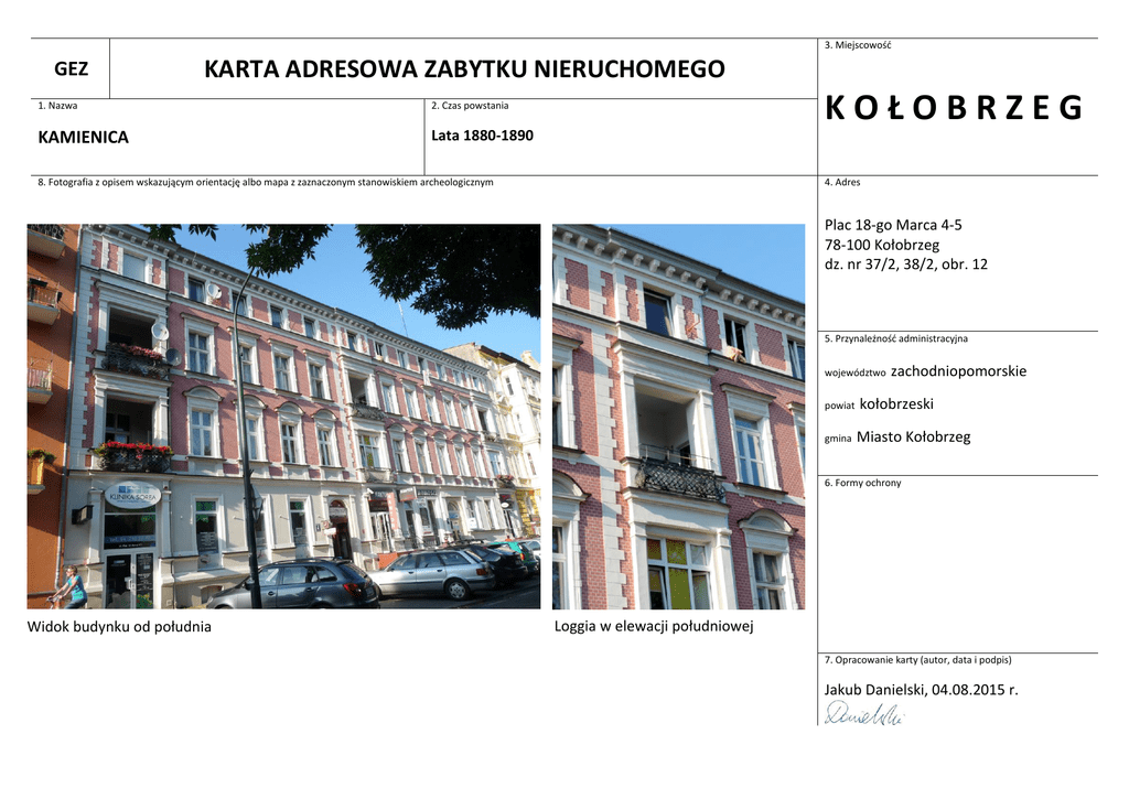 3. Miejscowośd GEZ KARTA ADRESOWA ZABYTKU NIERUCHOMEGO 1. Nazwa 2. Czas powstania KAMIENICA Lata 1880-1890 KOŁOBRZEG 8. Fotografia z opisem wskazującym orientację albo mapa z zaznaczonym stanowiskiem archeologicznym 4. Adres Plac 18-go Marca 4-5 78-100 Kołobrzeg dz. nr 37/2, 38/2, obr. 12 5. Przynależnośd administracyjna województwo zachodniopomorskie powiat kołobrzeski gmina Miasto Kołobrzeg 6. Formy ochrony Widok budynku od południa Loggia w elewacji południowej 7. Opracowanie karty (autor, data i podpis) Jakub Danielski, 04.08.2015 r. 9. Opis Budynek w ciągu zwartej zabudowy pierzei ulicy, w układzie kalenicowym, złożony z dwóch budynków nakrytych płytkimi, dwuspadowymi dachami, posiadających ujednoliconą fasadę. Ściany murowane, tynkowane i licowane cegłą, detal architektoniczny wypracowany w tynku. Budynek podpiwniczony, trójkondygnacyjny z kondygnacją mieszkalnego poddasza. Fasada 12 - osiowa, zryzalitowana szerokimi, płytkimi ryzalitami pozornymi - w osiach skrajnych i w 6 osi od zach. W przyziemiu ryzalitów umieszczone współczesne drzwi sklepowe z wysokimi nadświetlami ujęte parą pilastrów, zwieoczone prostym nadprożem; w dwóch kolejnych kondygnacjach - podobnie obramione prostokątne otwory loggii, z kutymi, metalowymi balustradami; w kondygnacji poddasza - okno między odcinkami ceglanej ściany ujętej w bonie. Drzwi wejściowe do budynku umieszczone po zach. stronie środkowego ryzalitu: arkadowy otwór z prostym nadprożem dźwiganym przez parę pilastrów. Otwory parteru - w profilowanych opaskach. Podziały gzymsowe wspólne: gzyms cokołowy, parapetowy okien parteru, parapetowy taśmowy - okien pięter, wyładowany profilowany gzyms parapetowy okien poddasza i gzyms wieoczący na wolutowych konsolach. Parter gładko tynkowany, pietra licowane cegła, detal biały. Okna ramowane opaskami z przewiązkami, zwieoczone są prostokątnymi płycinami i odcinkami gzymsu - 2 piętro lub segmentowymi naczółkami - 1 piętro; na 1 piętrze poniżej okien - płyciny podokienne. Krawędzie ścian pięter budynku zach. ujęte boniowaniem. 10. Wnioski konserwatorskie Budynek w dobrym stanie technicznym i estetycznym, po remoncie: wymiana tynków, czyszczenie i spoinowanie cegły, odnowienie detali, wymiana części stolarki okiennej na PCV, w części - z zachowaniem pierwotnych podziałów. Do zachowania: bryła budynku, układ i dekoracje elewacji, kształt i istniejące podziały okien. Remonty w uzgodnieniu z Konserwatorem Zabytków. 10. Lokalizacja