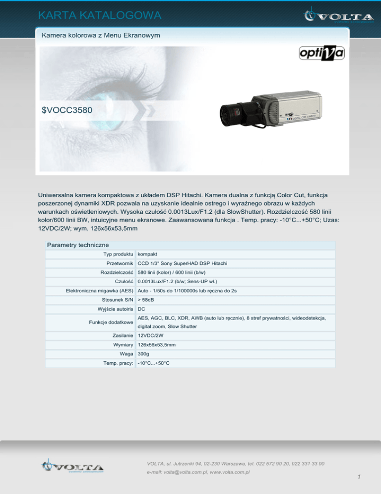 KARTA KATALOGOWA Kamera kolorowa z Menu Ekranowym $VOCC3580 Uniwersalna kamera kompaktowa z układem DSP Hitachi. Kamera dualna z funkcją Color Cut, funkcja poszerzonej dynamiki XDR pozwala na uzyskanie idealnie ostrego i wyraźnego obrazu w każdych warunkach oświetleniowych. Wysoka czułość 0.0013Lux/F1.2 (dla SlowShutter). Rozdzielczość 580 linii kolor/600 linii BW, intuicyjne menu ekranowe. Zaawansowana funkcja . Temp. pracy: -10°C...+50°C; Uzas: 12VDC/2W; wym. 126x56x53,5mm Parametry techniczne Typ produktu kompakt Przetwornik CCD 1/3" Sony SuperHAD DSP Hitachi Rozdzielczość 580 linii (kolor) / 600 linii (b/w) Czułość 0.0013Lux/F1.2 (b/w; Sens-UP wł.) Elektroniczna migawka (AES) Auto - 1/50s do 1/100000s lub ręczna do 2s Stosunek S/N > 58dB Wyjście autoiris DC Funkcje dodatkowe AES, AGC, BLC, XDR, AWB (auto lub ręcznie), 8 stref prywatności, wideodetekcja, digital zoom, Slow Shutter Zasilanie 12VDC/2W Wymiary 126x56x53,5mm Waga 300g Temp. pracy: -10°C...+50°C VOLTA, ul. Jutrzenki 94, 02-230 Warszawa, tel. 022 572 90 20, 022 331 33 00 e-mail: [email protected], www.volta.com.pl 1