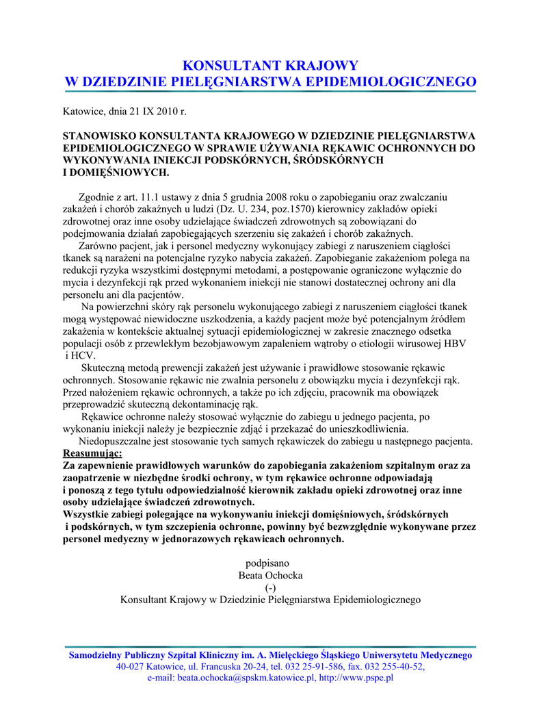 KONSULTANT KRAJOWY W DZIEDZINIE PIELĘGNIARSTWA EPIDEMIOLOGICZNEGO Katowice, dnia 21 IX 2010 r. STANOWISKO KONSULTANTA KRAJOWEGO W DZIEDZINIE PIELĘGNIARSTWA EPIDEMIOLOGICZNEGO W SPRAWIE UŻYWANIA RĘKAWIC OCHRONNYCH DO WYKONYWANIA INIEKCJI PODSKÓRNYCH, ŚRÓDSKÓRNYCH I DOMIĘŚNIOWYCH. Zgodnie z art. 11.1 ustawy z dnia 5 grudnia 2008 roku o zapobieganiu oraz zwalczaniu zakażeń i chorób zakaźnych u ludzi (Dz. U. 234, poz.1570) kierownicy zakładów opieki zdrowotnej oraz inne osoby udzielające świadczeń zdrowotnych są zobowiązani do podejmowania działań zapobiegających szerzeniu się zakażeń i chorób zakaźnych. Zarówno pacjent, jak i personel medyczny wykonujący zabiegi z naruszeniem ciągłości tkanek są narażeni na potencjalne ryzyko nabycia zakażeń. Zapobieganie zakażeniom polega na redukcji ryzyka wszystkimi dostępnymi metodami, a postępowanie ograniczone wyłącznie do mycia i dezynfekcji rąk przed wykonaniem iniekcji nie stanowi dostatecznej ochrony ani dla personelu ani dla pacjentów. Na powierzchni skóry rąk personelu wykonującego zabiegi z naruszeniem ciągłości tkanek mogą występować niewidoczne uszkodzenia, a każdy pacjent może być potencjalnym źródłem zakażenia w kontekście aktualnej sytuacji epidemiologicznej w zakresie znacznego odsetka populacji osób z przewlekłym bezobjawowym zapaleniem wątroby o etiologii wirusowej HBV i HCV. Skuteczną metodą prewencji zakażeń jest używanie i prawidłowe stosowanie rękawic ochronnych. Stosowanie rękawic nie zwalnia personelu z obowiązku mycia i dezynfekcji rąk. Przed nałożeniem rękawic ochronnych, a także po ich zdjęciu, pracownik ma obowiązek przeprowadzić skuteczną dekontaminację rąk. Rękawice ochronne należy stosować wyłącznie do zabiegu u jednego pacjenta, po wykonaniu iniekcji należy je bezpiecznie zdjąć i przekazać do unieszkodliwienia. Niedopuszczalne jest stosowanie tych samych rękawiczek do zabiegu u następnego pacjenta. Reasumując: Za zapewnienie prawidłowych warunków do zapobiegania zakażeniom szpitalnym oraz za zaopatrzenie w niezbędne środki ochrony, w tym rękawice ochronne odpowiadają i ponoszą z tego tytułu odpowiedzialność kierownik zakładu opieki zdrowotnej oraz inne osoby udzielające świadczeń zdrowotnych. Wszystkie zabiegi polegające na wykonywaniu iniekcji domięśniowych, śródskórnych i podskórnych, w tym szczepienia ochronne, powinny być bezwzględnie wykonywane przez personel medyczny w jednorazowych rękawicach ochronnych. podpisano Beata Ochocka (-) Konsultant Krajowy w Dziedzinie Pielęgniarstwa Epidemiologicznego Samodzielny Publiczny Szpital Kliniczny im. A. Mielęckiego Śląskiego Uniwersytetu Medycznego 40-027 Katowice, ul. Francuska 20-24, tel. 032 25-91-586, fax. 032 255-40-52, e-mail: [email protected], http://www.pspe.pl