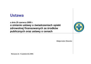 Ustawa z dnia 25 czerwca 2009 r. o zmianie ustawy o świadczeniach opieki zdrowotnej finansowanych ze środków publicznych oraz ustawy o cenach Małgorzata Stawska Warszawa dn. 14 października 2009r. Plan prezentacji • Wstęp • Definicje • Kryteria kwalifikacji świadczeń opieki zdrowotnej jako świadczeń gwarantowanych • ŚcieŜki oceny świadczeń opieki zdrowotnej • Akty wykonawcze • Zadania AOTM 2 • Przestaje obowiązywać Zarządzenie MZ z dnia 30 czerwca 2006 r. w sprawie Agencji Oceny Technologii Medycznych • Wnioski refundacyjne (zgodnie z art. 39 ust. 1) złoŜone przed 12 sierpnia 2009 rozpatrywane wg zasad sprzed nowelizacji ustawy • Wszystkie inne postępowania – wg zasad określonych w ustawie 3 Definicje Świadczenie opieki zdrowotnej – świadczenie zdrowotne, świadczenie zdrowotne rzeczowe i świadczenie towarzyszące Świadczenie gwarantowane – świadczenie opieki zdrowotnej finansowane w całości lub współfinansowane ze środków publicznych na zasadach i w zakresie określonych w ustawie Świadczenie zdrowotne – działania słuŜące profilaktyce, zachowaniu, ratowaniu, przywracaniu lub poprawie zdrowia oraz inne działanie medyczne wynikające z procesu leczenia lub przepisów odrębnych regulujących zasady ich udzielania Świadczenie zdrowotne rzeczowe – związane z procesem leczenia leki, wyroby medyczne, w tym wyroby medyczne będące przedmiotami ortopedycznymi, i środki pomocnicze Świadczenie towarzyszące – zakwaterowanie i wyŜywienie w zakładzie opieki zdrowotnej całodobowej lub całodziennej oraz usługi transportu sanitarnego 4 Świadczeniobiorcy przysługują świadczenia gwarantowane z zakresu: 1) podstawowej opieki zdrowotnej; 2) ambulatoryjnej opieki specjalistycznej; 3) leczenia szpitalnego; 4) opieki psychiatrycznej i leczenia uzaleŜnień; 5) rehabilitacji leczniczej; 6) świadczeń pielęgnacyjnych i opiekuńczych w ramach opieki długoterminowej; 13 rozporządzeń 7) leczenia stomatologicznego; 8) lecznictwa uzdrowiskowego; 9) zaopatrzenia w wyroby medyczne będące przedmiotami ortopedycznymi oraz środki pomocnicze; 10) ratownictwa medycznego; 11) opieki paliatywnej i hospicyjnej; 12) świadczeń wysokospecjalistycznych; 13) programów zdrowotnych; 14 ) leków 5 Pozostałe pojęcia Nomenklatura Ustawy Nomenklatura uŜywana w AOTM Raport w sprawie oceny świadczenia opieki zdrowotnej Raport HTA Raport w sprawie oceny leku lub wyrobu medycznego Raport w sprawie oceny raportu w sprawie oceny leku lub wyrobu medycznego Analiza Weryfikacyjna 6 Kryteria Kwalifikowania świadczeń opieki zdrowotnej jako świadczeń gwarantowanych (art. 31a ust 1.) 1) wpływ na poprawę zdrowia obywateli przy uwzględnieniu: a) priorytetów zdrowotnych określonych w przepisach b) wskaźników zapadalności, chorobowości lub śmiertelności określonych na podstawie aktualnej wiedzy medycznej; 2) skutki następstw choroby lub stanu zdrowia, w szczególności prowadzących do: a) przedwczesnego zgonu, b) niezdolności do samodzielnej egzystencji w rozumieniu przepisów o emeryturach i rentach z Funduszu Ubezpieczeń Społecznych, c) niezdolności do pracy w rozumieniu przepisów o emeryturach i rentach z Funduszu Ubezpieczeń Społecznych, d) przewlekłego cierpienia lub przewlekłej choroby, e) obniŜenia jakości Ŝycia; 3) znaczenie dla zdrowia obywateli, przy uwzględnieniu konieczności: a) ratowania Ŝycia i uzyskania pełnego wyzdrowienia, b) ratowania Ŝycia i uzyskania poprawy stanu zdrowia, c) zapobiegania przedwczesnemu zgonowi, d) poprawiania jakości Ŝycia bez istotnego wpływu na jego długość; 4) skuteczność kliniczną i bezpieczeństwo; 5) stosunek uzyskiwanych korzyści zdrowotnych do ryzyka zdrowotnego; 6) stosunek kosztów do uzyskiwanych efektów zdrowotnych; 7) skutki finansowe dla systemu ochrony zdrowia, w tym dla podmiotów zobowiązanych do finansowania świadczeń opieki zdrowotnej ze środków publicznych. 7 Priorytety Zdrowotne (Rozporządzenie Ministra Zdrowia z dnia 21 sierpnia 2009r. w sprawie priorytetów zdrowotnych) Ustala się następujące priorytety zdrowotne: 1) zmniejszenie zachorowalności i przedwczesnej umieralności z powodu: a) chorób naczyniowo-sercowych, w tym zawałów serca i udarów mózgu, b) nowotworów złośliwych c) przewlekłych chorób układu oddechowego; 2) ograniczenie skutków urazów powstałych w wyniku wypadków, w szczególności poprzez skuteczną rehabilitację osób poszkodowanych; 3) zapobieganie, leczenie i rehabilitacja zaburzeń psychicznych; 4) zmniejszenie przedwczesnej zachorowalności i ograniczenie negatywnych skutków przewlekłych schorzeń układu kostno-stawowego; 5) zwiększenie skuteczności zapobiegania chorobom zakaźnym i zakaŜeniom; 6) ograniczanie szkód zdrowotnych spowodowanych: a) spoŜywaniem alkoholu, b) uŜywaniem substancji psychoaktywnych, c) paleniem tytoniu; 7) przeciwdziałanie występowaniu otyłości i cukrzycy; 8) ograniczanie skutków zdrowotnych spowodowanych czynnikami szkodliwymi w środowisku pracy i zamieszkania; 9) poprawa jakości i skuteczności opieki zdrowotnej nad matką, noworodkiem i dzieckiem do lat 3; 10) zapobieganie najczęstszym problemom zdrowotnym i zaburzeniom rozwoju fizycznego i psychospołecznego dzieci i młodzieŜy objętych obowiązkiem szkolnym i obowiązkiem nauki oraz kształcących się w szkołach ponadgimnazjalnych do ich ukończenia; 11) rozwój opieki długoterminowej, ze szczególnym uwzględnieniem kompensowania utraconej sprawności; 12) poprawa jakości i skuteczności opieki geriatrycznej nad pacjentem w wieku podeszłym. 8 Cztery ścieŜki oceny: 1. Kwalifikacja świadczenia opieki zdrowotnej jako świadczenia gwarantowanego 2. Usuwanie świadczenia opieki zdrowotnej z wykazu świadczeń gwarantowanych albo dokonanie zmiany poziomu lub sposobu finansowania, lub warunków realizacji świadczenia gwarantowanego 3. Umieszczenie leków lub wyrobów medycznych w wykazach (wykaz leków pod