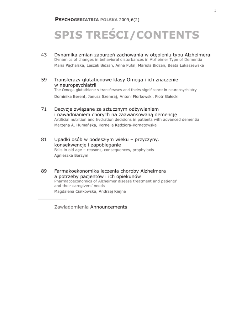 I PSYCHOGERIATRIA POLSKA 2009;6(2) SPIS TREŚCI/CONTENTS 43 Dynamika zmian zaburzeń zachowania w otępieniu typu Alzheimera Dynamics of changes in behavioral disturbances in Alzheimer Type of Dementia Maria Pąchalska, Leszek Bidzan, Anna Pufal, Mariola Bidzan, Beata Łukaszewska 59 Transferazy glutationowe klasy Omega i ich znaczenie w neuropsychiatrii The Omega glutathione s-transferases and theirs significance in neuropsychiatry Dominika Berent, Janusz Szemraj, Antoni Florkowski, Piotr Gałecki 71 Decyzje związane ze sztucznym odżywianiem i nawadnianiem chorych na zaawansowaną demencję Artificial nutrition and hydration decisions in patients with advanced dementia Marzena A. Humańska, Kornelia Kędziora-Kornatowska 81 Upadki osób w podeszłym wieku – przyczyny, konsekwencje i zapobieganie Falls in old age – reasons, consequences, prophylaxis Agnieszka Borzym 89 Farmakoekonomika leczenia choroby Alzheimera a potrzeby pacjentów i ich opiekunów Pharmacoeconomics of Alzheimer disease treatment and patients’ and their caregivers’ needs Magdalena Ciałkowska, Andrzej Kiejna Zawiadomienia Announcements II Redaktor Naczelny/Editor-in-Chief Andrzej Kiejna (Wrocław, Poland) Redaktor Międzynarodowy/International Editor Ralf Ihl (Düsseldorf, Germany) Rada Naukowa/Editorial Board Aleksander Araszkiewicz (Bydgoszcz, Poland) Stavros Baloyannis (Thessaloniki, Greece) Leszek Bidzan (Gdańsk, Poland) Jason Brown (New York, USA) Pasquale Calabrese (Bochum, Germany) Salvatore DiMauro (New York, USA) Knut Engedal (Oslo, Norway) Tomasz Gabryelewicz (Warszawa, Poland) Andrzej Górski (Wrocław, Poland) George T. Grossberg (Saint Louis, USA) Lars Gustafson (Lund, Sweden) Khalid Iqbal (New York, USA) Marek Jarema (Warszawa, Poland) Marek Jutel (Wrocław, Poland) Thomas Kallert (Dresden, Germany) Siegfried Kanowski (Berlin, Germany) Cornelius Katona (London, Great Britain) Iwona Kłoszewska (Łódź, Poland) Amos Korczyn (Tel-Aviv, Israel) Raimundo Mateos (Santiago de Compostela, Spain) Konrad Maurer (Frankfurt/Main, Germany) Carlos Augusto de Mendonça Lima (Rio de Janeiro, Brasil) Bruce Duncan MacQueen (Bydgoszcz, Poland) Janusz Moryś (Gdańsk, Poland) Grzegorz Opala (Katowice, Poland) Tadeusz Parnowski (Warszawa, Poland) Maria Pąchalska (Kraków, Poland) Michael Philpot (London, Great Britain) Ryszard Podemski (Wrocław, Poland) Martin Prince (London, Great Britain) Stanisław Pużyński (Warszawa, Poland) Jiři Raboch (Prague, Czech Republic) Barry Reisberg (New York, USA) Jarl Risberg (Lund, Sweden) Joanna Rymaszewska (Wrocław, Poland) Johannes Schröder (Heidelberg, Germany) Andrzej Szczudlik (Kraków, Poland) Nicoleta Tataru (Oradea, Romania) Jerzy Vetulani (Kraków, Poland) Kolegium Redakcyjne/Executive Board Andrzej Kiejna, Jerzy Leszek, Ralf Ihl, Joanna Rymaszewska, Aleksandra Zawadzka, Tomasz Adamowski, Patryk Piotrowski Sekretarz Redakcyjny/Editorial Secretary Aleksandra Zawadzka, Patryk Piotrowski e-mail: [email protected] Adres Korespondencyjny Redakcji/Correspondence Address PSYCHOGERIATRIA POLSKA 50-119 Wrocław, ul. Nożownicza 4/8, Poland tel. (+48) (71) 343 21 52; faks (+48) (71) 343 21 55 Dział Reklamy i Marketingu/Advertising and Marketing Section Tomasz Adamowski e-mail: [email protected] Redakcja nie odpowiada za treść zamieszczonych reklam Projekt graficzny/design: Paweł Jaszczuk Skład i druk/press: Mediacom sp. z o.o., www.mediacom.com.pl Wydawca/Publisher FUNDACJA OCHRONY ZDROWIA PSYCHICZNEGO FOUNDATION OF MENTAL HEALTH 50-119 Wrocław, ul. Nożownicza 4/8, Poland http://www.fozp.org.pl nakład 500 egz. Copyright ©2004 Fundacja Ochrony Zdrowia Psychicznego III PSYCHOGERIATRIA POLSKA 2009;6(2) Od Redakcji Drodzy Koleżanki i Koledzy, Czytelnicy „Psychogeriatrii Polskiej” Składam na Państwa ręce kolejny numer naszego czasopisma. Zgodnie z dotychczasową polityką wydawniczą periodyku Kolegium redakcyjne starało się wybrać prace zróżnicowane pod względem tematycznym. Poruszane zagadnienia skupiają się wokół obszaru psychiatrii wieku podeszłego, omawiając je z szerszej perspektywy. Mam nadzieję, że interdyscyplinarność materiału uatrakcyjnia ofertę naszego czasopisma. Korzystając z okazji, serdecznie zapraszam do uczestnictwa w organizowanym w dniach 3-4 grudnia 2009 VI Kongresie Polskiego Towarzystwa Psychogeriatrycznego, którego tematem wiodącym będzie w tym roku: Psychotyzm i zaburzenia psychiczne wieku podeszłego. Zachęcam do zgłaszania propozycji tematów prezentacji ustnych oraz plakatowych. Streszczenia przyjętych wystąpień zamieszczone będą na łamach grudniowego numeru czasopisma. Życzę Państwu, aby podczas zbliżającego się okresu wakacyjnego znaleźli Państwo czas na wszystko to, na co brakuje Państwu czasu w okresie całorocznej intensywnej pracy. Natomiast kolegium redakcyjne dołoży w tym czasie wszelkich starań, aby jesienny numer Psychogeriatrii Polskiej spełnił Państwa oczekiwania. Redaktor Naczelny Prof. dr hab. Andrzej Kiejna IV PSYCHOGERIATRIA POLSKA 2009;6(2) From the Editor Dear Friends, Readers of Polish Journal of Geriatric Psychiatry, I am pleased to offer you the following issue of our journal. According to current editorial policy of the periodic, editorial board tried to choose diversified scope of papers to be included in the journal. The broached issues concentrate around issues of geriatric psychiatry discussed from a wider perspective. I hope that interdisciplinary content will make our journal even more attractive to you. Taking the opportunity I would like to invite you to participate in the VIth Congress of Polish Association of Geriatric Psychiatry taking place on 3-4th December 2009, with the leading subject: „Psychotism and mental disorders of old age”. I encourage you to submit the subject for oral and poster presentations. The abstract of accepted presentations will be printed in the December issue of our journal. I wish you to find some spare time during the holiday 
