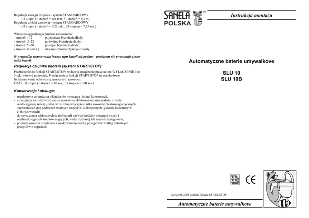 Regulacja zasięgu czujnika - system STANDARDOWY - 31 stopni (1 stopień = cca 0 m, 31 stopień = 0,3 m) Regulacja zwłoki czasowej - system STANDARDOWY - 31 stopni (1 stopień = 0,25 sek. , 31 stopień = 7,75 sek.) Instrukcja montażu POLSKA Wizualna sygnalizacja podczas nastawiania: - stopień 1-12 pojedyńcze błyśnięcie diody, - stopień 13-22 podwójne błyśnięcie diody, - stopień 23-30 potrójne błyśnięcie diody, - stopień 31 (max.) dziesięciokrotne błyśnięcie diody. W przypadku zastosowania innego typu baterii niż podane - producent nie gwarantuje żywotności baterii. Regulacja czujnika pilotem (system START/STOP): Przełączenie do funkcji START/STOP: wyłączyć urządzenie przyciskiem WYŁĄCZENIE i do 5 sek. włączyć ponownie. Przełączenie z funkcji START/STOP na standardowe funkcjonowanie odbywa się tym samym sposobem. CZAS: 31 stupni (1.stopień = 10 sek., 31.stopień = 320 sek.) Automatyczne baterie umywalkove SLU 10 SLU 10B Konserwacja i obsluga: - regulatory z ceramiczną wkładką nie wymagają żadnej konserwacji, - ze względu na możliwość zanieczyszczenia elektrozaworu nieczystości z wody wodociągowej należy jeden raz w roku przeczyścić sitka zaworów elektromagnetycznych, skontrolować stan podłączeń wodnych (wężyki) i elektrycznych (głównie konektory w elektrozaworach) - do czyszczenia widocznych części baterii używać środków nieagresywnych i ogólniedostępnych środków myjących, wody mydlanej lub rozcieńczonego octu, - po rozpakowaniu urządzenia z opakowaniem należy postępować według aktualnych przepisów o odpadach. Wersja 08/2004 posiada funkcję START/STOP Automatyczne baterie umywalkove Właściwości: - reakcja na obecność rąk w strefie oddziaływania czujnika (0-30 cm) natychmiastowym wypływem wody - bateria wyposażona w obrotową wylewkę oraz czujniki skierowane w dwóch kierunkach (do zlewów dwukomorowych) - zamknięcie wypływu wody po wyciągnięciu rąk z umywalki (tzw. zwłoka czasowa) po upłynięciu nastawionego czasu (0,25 do 7,75 sek) - funkcja START/STOP - zbliżenie rąk do czujniak na odległość 5-10 cm powoduje uruchomienie wypływu wody, do zamknięcia wypływu dochodzi po ponownym zbliżeniu dłoni. Kiedy ponowne zbliżenie nie powoduje wyłączenia wówczas wypływ wody zostanie automatycznie wyłączony. Funkcja ta jest przydatna w wielu przypadkach np. w zlewozmywakach podczas napełniania naczyń. Zasięg czujnika w reżimie START/STOP jest w zakresie 5-10 cm a czas wypływu można nastawić od 10 do 320 sek. - reakcja strefy oddziaływania czujnika oraz zwłoki czasowej przy pomocy pilota SLD 03 Parametry techniczne: Zasilanie: Pobór mocy: - SLU 10 - SLU 10B - przy zasilaniu 24 V DC - przy zasilaniu 9 VC Zasięg Ciśnienie robocze: Przepływ Specyfikacja dostawy SLU: 24 DC 9 DC 0,8 W (spoczynek), 10 W (otwarcie elektrozaworu) 0,5 mW (spoczynek), 2 W (otwarcie elektrozaworu) 0 - 0,3 m 0,1 - 0,8 MPa 12 l/min. 10 10B wylewka z ręcznym regulatorem długa 1 1 elektronika 1 1 bateria U9VL - zawór elektromagnetyczny podłączyć do elektroniki, podłączyć kabel zasilający z elektroniką, walec z układem elektronicznym wsunąć pod uchwyt - podłączyć zasilanie, sprawdzić poprawność funkcjonowania czujnika, Uwaga: podczas podłączenia kabli zasilających, sterujących polaryzacja biegunów jest obojętna. Montaż czujnika (urządzenie zasilane z baterii): Czynności montażowe SLU 10B są identyczne jak w przypadku urządzeń sieciowych tj. SLU 10. Jednakże odpada konieczność wykonywania instalacji zasilającej 24V. Podczas podłączania kabli ważne jest zachowanie polaryzacji biegunów. Postępowanie po montażu (urządzenie zasilane z baterii): Do walca z elektroniką włożyć baterię 9V. Wnęka na baterię jest dostępna po wyjęciu zatyczki na końcu walca. Uwaga: podczas podłączenia przewodów sterujących do zaworu elektromagnetycznego należy to robić ściśle z oznaczoną polaryzacją biegunów. Brązowy przewód podłączyć do "+" a czarny do "-" zaworu elektromagnetycznego. Przygotowanie do eksploatacji: Po zainstalowaniu wszystkich urządzeń podłączamy je do zasilacza. Załączy się elektrozawór i zacznie świecić dioda LED. W tym momencie urządzenie się ustawia, po 3 sekundach dojdzie do wyłączenia elektrozaworu. Po następnych 3 sekundach zabłyśnie na krótko dioda LED i zgaśnie. Fakt ten oznacza, że urządzenie jest już gotowe do działania. Przypominamy, aby podczas nastawiania urządzenia woda była włączona i nikt nie znajdował się w zasięgu działania fotokomórki. Automatyczne nastawienie czułości urządzenia kontrolowane jest co 24 godziny w przypadku nie używania w tym czasie urządzenia. Polega ono na tym, że dochodzi do kontroli zasięgu działania i włączeniu na chwilę elektrozaworu. Istnieje możliwość przełączenie elektroniki na system działania Start/Stop za pomocą pilota regulacyjnego. Dokonuje się to w następujący sposób w ciągu 5 sekund musimy wyłączyć i załączyć urządzenie. Możemy także każdorazowo zmienić czułość urządzenia co będzie potwierdzone zabłyśnięciem diody LED. 1 Regulacja czujnika: 2 zawór kątowy z zaworem zwrotnym 2 2 Fabrycznie urządzenie nastawione jest na zasięg cca 0,2 m. W większości przypadków nastawa fabryczna jest wystarczająca jednakże można ją zmienić stosownie do konkretnych warunków. Zmiana parametrów czujnika jest możliwa przy pomocy pilota SLD 03. Sposób regulacji opisany jest w instrukcji obsługi pilota. wężyk 3/8xM10 l = 120 mm 2 2 Regulacja czujnika pilotem: wężyk 3/8x3/8 l = 300 mm 2 2 uszczelka 3/8 z sitkiem 2 2 uszczelka 3/8 4 4 klej silikonowy 1 1 Po naciśnięciu jednego z przycisków w pilocie parametr zmieniany jest w stopniach. Zmiana o 1 stopień sygnalizowana jest błyśnięciem diody LED w czujniku. Po osiągnięciu maksimum wartość nastawianego parametru spada na minimum - którą stopniowo można zwiększyć tak d