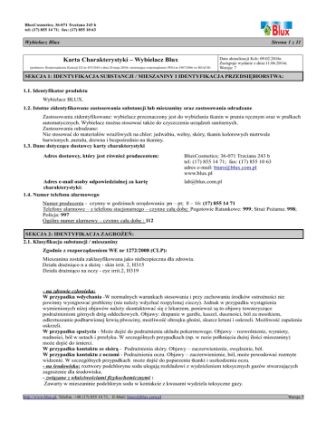 BluxCosmetics; 36-071 Trzciana 243 b tel: (17) 855 14 71; fax: (17) 855 10 63 Wybielacz Blux Strona 1 z 11 Karta Charakterystyki – Wybielacz Blux (podstawa: Rozporządzenie Komisji UE nr 453/2010 z dnia 20 maja 2010r. zmieniające rozporządzenie (WE) nr 1907/2006 ws REACH) Data aktualizacji Kch: 09.02.2016r. Zastępuje wydanie z dnia:11.06.2014r. Wersja: 7 SEKCJA 1: IDENTYFIKACJA SUBSTANCJI / MIESZANINY I IDENTYFIKACJA PRZEDSIĘBIORSTWA: 1.1. Identyfikator produktu Wybielacz BLUX. 1.2. Istotne zidentyfikowane zastosowania substancji lub mieszaniny oraz zastosowania odradzane Zastosowania zidentyfikowane: wybielacz przeznaczony jest do wybielania tkanin w praniu ręcznym oraz w pralkach automatycznych. Wybielacz można stosować także do czyszczenia urządzeń sanitarnych. Zastosowania odradzane: Nie stosować do materiałów wrażliwych na chlor: jedwabiu, wełny, skóry, tkanin kolorowych nietrwale barwionych ,metalu, drewna i bezpośrednio na tkaniny. 1.3. Dane dotyczące dostawcy karty charakterystyki Adres dostawcy, który jest również producentem: Adres e-mail osoby odpowiedzialnej za kartę charakterystyki: 1.4. Numer telefonu alarmowego BluxCosmetics; 36-071 Trzciana 243 b tel: (17) 855 14 71; fax: (17) 855 10 63 adres e-mail: [email protected] www.blux.pl [email protected] Numer producenta - czynny w godzinach urzędowania: pn – pt; 8 – 16: (17) 855 14 71 Telefony alarmowe – z telefonu stacjonarnego – czynne całą dobę: Pogotowie Ratunkowe: 999; Straż Pożarna: 998; Policja: 997 Ogólny numer alarmowy – czynny całą dobę : 112 SEKCJA 2: IDENTYFIKACJA ZAGROŻEŃ: 2.1. Klasyfikacja substancji / mieszaniny Zgodnie z rozporządzeniem WE nr 1272/2008 (CLP): Mieszanina została zaklasyfikowana jako niebezpieczna dla zdrowia. Działa drażniąco n a skórę - skin irrit. 2, H315 Działa drażniąco na oczy - eye irrit.2, H319 - na zdrowie człowieka: W przypadku wdychania -W normalnych warunkach stosowania i przy zachowaniu środków ostrożności nie powinny występować problemy (nie należy wdychać rozpylonej cieczy). Jednak w przypadku wystąpienia wymienionych niżej objawów należy skontaktować się z lekarzem, ponieważ są to objawy towarzyszące podrażnieniom górnych dróg oddechowych. Objawy: drapanie w gardle, kaszel, duszności, ból za mostkiem, odkrztuszanie podbarwionej krwią plwociny, możliwość obrzęku głośni, skurcz krtani i oskrzeli. Możliwość zapalenia oskrzeli. W przypadku spożycia - Może dojść do podrażnienia układu pokarmowego. Objawy – rozwolnienie, wymioty, nudności, ból w ustach i przełyku. W szczególnych przypadkach (np. w razie połknięcia dużej ilości mieszaniny) może dojść do śmierci. W przypadku kontaktu ze skórą - Podrażnienia skóry. Objawy – zaczerwienienie, swędzenie, ból. W przypadku kontaktu z oczami - Podrażnienia oczu. Objawy – zaczerwienienie, ból, może powodować rozmyte widzenie. W szczególnych przypadkach może dojść do poparzenia tkanki i uszkodzenia oczu. - na środowisko: roztwory podchlorynu sodu ulegają rozkładowi z wydzieleniem toksycznych gazów stwarzających zagrożenie dla środowiska. - związane z właściwościami fizykochemicznymi : Zawarty w mieszaninie podchloryn sodu w kontakcie z kwasami wydziela toksyczne gazy. http://www.blux.pl, Telefon +48 (17) 855 14 71, E-Mail: [email protected] Wersja 7 BluxCosmetics; 36-071 Trzciana 243 b tel: (17) 855 14 71; fax: (17) 855 10 63 Wybielacz Blux Strona 2 z 11 2.2. Elementy oznakowania ZNAK OSTRZEGAWCZY: GHS 07 – wykrzyknik HASŁO OSTRZEGAWCZE: UWAGA ZWROTY WSKAZUJĄCE RODZAJ ZAGROŻENIA: Działa drażniąco na skórę - H315 Działa drażniąco na oczy - H319 ZWROTY OKREŚLAJĄCE WARUNKI BEZPIECZNEGO STOSOWANIA: Ogólne: P102 Chronić przed dziećmi. Zapobieganie: P260 - Nie wdychać rozpylonej cieczy. P280 - Stosować rekawice ochronne, odzież ochronna, ochrone oczu, ochrone twarzy. Reagowanie: P332+P313 - W przypadku wystapienia podrażnienia skory: Zasiegnać porady lekarza P305 + P351 + P338 W PRZYPADKU DOSTANIA SIĘ DO OCZU: Ostrożnie płukać woda przez kilka minut. Wyjać soczewki kontaktowe, jeżeli sa i można je łatwo usunać. Nadal płukać. P337 + P313 - W przypadku utrzymywania się działania drażniącego na oczy: Zasięgnąć porady lekarza. Uwaga! Nie stosować razem z innymi produktami. Może uwalniać niebezpieczne gazy (chlor). 2.3. Inne zagrożenia Inne zagrożenia – mieszaniny nie poddano ocenie, w celu sprawdzenia, czy spełnia kryteria PBT lub vPvB. Odnośnie składników – nie zostały zaklasyfikowane jako PBT lub vPvB. SEKCJA 3: SKŁAD / INFORMACJA O SKŁADNIKACH: 3.1. Substancje nie dotyczy. 3.2. Mieszaniny Niżej wymieniono substancje, ze względu na ich klasyfikację i zawartość > 1% PODCHLORYN SODU ZAWIERAJĄCY OK. 16 % AKTYWNEGO CHLORU (HYPOCHLORITE SODIUM) CAS: 7681-52-9 WE: 231-668-3 Nr indeksowy: 017-011-00-1 Nr rejestracji: 01-2119488154-34-XXXX Zawartość w mieszaninie: < 2% aktywnego chloru Klasyfikacja wg 1272/2008/WE: Działa żrąco na skórę kat. 1B (Skin Corr. 1B) H314, stwarza zagrożenie dla środowiska wodnego kat. ostra 1 (Aquatic Acute 1) H400,Poważne uszkodzenie oczu kat.1 H318, Działa toksycznie na narządy docelowe kat.3 H335,Substancja lub mieszanina powodują korozję metali kat.1 H290 http://www.blux.pl, Telefon +48 (17) 855 14 71, E-Mail: [email protected] Wersja 7 BluxCosmetics; 36-071 Trzciana 243 b tel: (17) 855 14 71; fax: (17) 855 10 63 Wybielacz Blux Strona 3 z 11 Oznakowanie: GHS 05: GHS07: GHS09: niebezpieczeństwo; H400, H314, H400, H335, H290. ; hasło ostrzegawcze: Wodorotlenek sodu CAS: 1310-73-2 WE: 215-185-5 Nr indeksowy: 011-002-00-6 Nr rejestracji: 01-2119457892-27-XXXX Zawartość w mieszaninie: < 1 % Klasyfikacja wg 1272/2008/WE: Działa żrąco na skórę kat. 1A (Skin Corr. 1A) H314, powoduje korozję metali kat. 1 (Met. Corr. 1) H290 Oznakowanie: GHS 05: ; hasło ostrzegawcze: niebezpieczeństwo, H314, H290. SEKCJA 4: ŚRODKI PIE