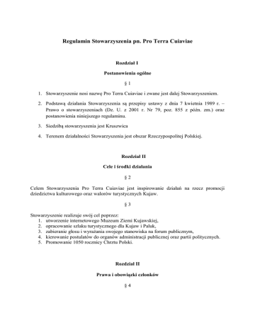 Regulamin Stowarzyszenia pn. Pro Terra Cuiaviae Rozdział I Postanowienia ogólne §1 1. Stowarzyszenie nosi nazwę Pro Terra Cuiaviae i zwane jest dalej Stowarzyszeniem. 2. Podstawą działania Stowarzyszenia są przepisy ustawy z dnia 7 kwietnia 1989 r. – Prawo o stowarzyszeniach (Dz. U. z 2001 r. Nr 79, poz. 855 z późn. zm.) oraz postanowienia niniejszego regulaminu. 3. Siedzibą stowarzyszenia jest Kruszwica 4. Terenem działalności Stowarzyszenia jest obszar Rzeczypospolitej Polskiej. Rozdział II Cele i środki działania §2 Celem Stowarzyszenia Pro Terra Cuiaviae jest inspirowanie działań na rzecz promocji dziedzictwa kulturowego oraz walorów turystycznych Kujaw. §3 Stowarzyszenie realizuje swój cel poprzez: 1. utworzenie internetowego Muzeum Ziemi Kujawskiej, 2. opracowanie szlaku turystycznego dla Kujaw i Paluk, 3. zabieranie głosu i wyrażania swojego stanowiska na forum publicznym, 4. kierowanie postulatów do organów administracji publicznej oraz partii politycznych. 5. Promowanie 1050 rocznicy Chrztu Polski. Rozdział II Prawa i obowiązki członków §4 1. Członkiem Stowarzyszenia może być każda osoba fizyczna, posiadająca obywatelstwo polskie, mająca pełną zdolność do czynności prawnych, niepozbawiona praw publicznych. 2. Wniosek o przyjęcie w poczet członków Stowarzyszenia składa się na piśmie wyrażając jednocześnie wolę akceptacji celów i regulaminu Stowarzyszenia. Wnioski takie rozpatrywane są przez Przedstawiciela Stowarzyszenia. Decyzję o przyjęciu w poczet Przedstawiciel podejmuje do 14 dni od daty złożenia wniosku. 3. Członkowie Stowarzyszenia mają prawo: a) biernego i czynnego uczestnictwa w wyborach Przedstawiciela Stowarzyszenia. b) udziału zebraniach i wydarzeniach organizowanych przez Stowarzyszenie, c) zgłaszania wniosków, co do działalności Stowarzyszenia. 4. Obowiązkiem członków Stowarzyszenia jest: a) branie udziału w działalności Stowarzyszenia, b) realizowanie jego celów, c) przestrzeganie regulaminu i uchwał władz Stowarzyszenia, d) płacenie składek członkowski. 5. Utrata członkostwa następuje na skutek: a) pisemnej rezygnacji złożonej na ręce prezesa, b) złamania regulaminu i nieprzestrzegania uchwał władz Stowarzyszenia, c) notorycznego nieuczestniczenia w pracach Stowarzyszenia, d) utraty praw obywatelskich na mocy prawomocnego wyroku sądu, e) notorycznego niepłacenia składek, f) śmierci członka. 6. Od uchwały Rady Przedstawicieli w sprawie pozbawienia członkowstwa, przysługuje zainteresowanemu odwołanie się do Walnego Zgromadzenia Członków w terminie 14 dni od uchwały Rady Przedstawicieli. Rozdział IV Władze Stowarzyszenia §5 1. Władzami Stowarzyszenia są: a) Walne Zgromadzenie Członków. b) Przedstawiciel Stowarzyszenia 2. Kadencja władz Stowarzyszenia trwa rok, a ich wybór odbywa się w głosowaniu jawnym. 3. Walne Zgromadzenie Członków jest najwyższą władzą Stowarzyszenia. 4. W obradach Walnego Zgromadzenia Członków uczestniczą wszyscy członkowie Stowarzyszenia. 5. Walne Zgromadzenie Członków powinno zostać zwołane przynajmniej raz w roku przez Zarząd Stowarzyszenia. Termin i miejsce obrad Zarząd Stowarzyszenia podaje do wiadomości wszystkich członków, co najmniej na 7 dni przed terminem zebrania. 6. Walne Zgromadzenie Członków nadzwyczajne może się odbyć w każdym czasie, jest zwoływane przez Przedstawiciela Stowarzyszenia z jego inicjatywy lub na pisemny wniosek, co najmniej 1/2 ogólnej liczby członków Stowarzyszenia. 7. Jeżeli Walne Zgromadzenie Członków w oznaczonym terminie nie zgromadziło wymaganej liczby Członków, Przedstawiciel zwołuje w terminie do dwóch tygodni Walne Zgromadzenie Członków, które jest władne podejmować uchwały niezależnie od liczby przybyłych Członków, zwykłą większością głosów. 8. Uchwały Walnego Zgromadzenia Stowarzyszenia zapadają zwykłą większością głosów. Głosowanie jest jawne. 9. Do kompetencji Walnego Zgromadzenia Członków należy: a) określanie głównych kierunków i form działania Stowarzyszenia, b) wybór Przedstawiciela Stowarzyszenia, c) podejmuje uchwał w sprawach istotnych dla Stowarzyszenia, d) rozpatrywanie odwołań od decyzji Przedstawiciela Stowarzyszenia, e) decydowanie o zawieszeniu działalności lub rozwiązaniu się Stowarzyszenia, f) dokonywanie oceny działalności Przedstawiciela Stowarzyszenia, g) dokonywanie zmian w Regulaminie Stowarzyszenia, h) podejmowanie uchwał o wysokości składek płaconych przez członków, i) podejmowanie uchwały o rozwiązaniu stowarzyszenia. 10. Prawo zgłaszania Stowarzyszenia. wniosków pod obrady przysługuje każdemu członkowi 11. Przedstawiciel Stowarzyszenia jest organem wykonawczym Stowarzyszenia. 12. Na wniosek Przedstawiciela Stowarzyszenie może reprezentować na zewnątrz także inny członek. 13. Przedstawiciel Stowarzyszenia odpowiada za wykonanie Uchwał i wytycznych Walnego Zgromadzenia Członków oraz kieruje działalnością Stowarzyszenia w okresach między sesjami Walnego Zgromadzenia Członków.