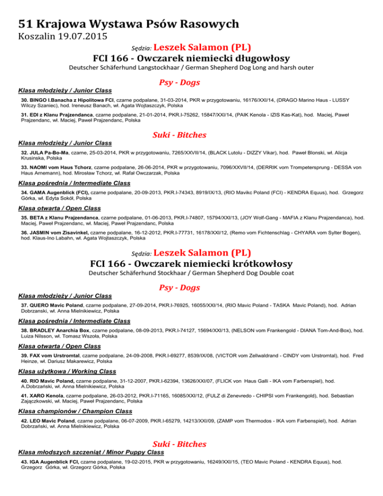 51 Krajowa Wystawa Psów Rasowych Koszalin 19.07.2015 Sędzia: Leszek Salamon (PL) FCI 166 - Owczarek niemiecki długowłosy Deutscher Schäferhund Langstockhaar / German Shepherd Dog Long and harsh outer Psy - Dogs Klasa młodzieży / Junior Class 30. BINGO I.Banacha z Hipolitowa FCI, czarne podpalane, 31-03-2014, PKR w przygotowaniu, 16176/XXI/14, (DRAGO Marino Haus - LUSSY Wilczy Szaniec), hod. Ireneusz Banach, wł. Agata Wojtaszczyk, Polska 31. EDI z Klanu Prajzendanca, czarne podpalane, 21-01-2014, PKR.I-75262, 15847/XXI/14, (PAIK Kenola - IZIS Kas-Kat), hod. Maciej, Paweł Prajzendanc, wł. Maciej, Paweł Prajzendanc, Polska Suki - Bitches Klasa młodzieży / Junior Class 32. JULA Pa-Bo-Ma, czarne, 25-03-2014, PKR w przygotowaniu, 7265/XXVII/14, (BLACK Lutolu - DIZZY Vikar), hod. Paweł Blonski, wł. Alicja Krusinska, Polska 33. NAOMI vom Haus Tchorz, czarne podpalane, 26-06-2014, PKR w przygotowaniu, 7096/XXVII/14, (DERRIK vom Trompetersprung - DESSA von Haus Arnemann), hod. Mirosław Tchorz, wł. Rafał Owczarzak, Polska Klasa pośrednia / Intermediate Class 34. GAMA Augenblick (FCI), czarne podpalane, 20-09-2013, PKR.I-74343, 8919/IX/13, (RIO Mavikc Poland (FCI) - KENDRA Equus), hod. Grzegorz Górka, wł. Edyta Sokół, Polska Klasa otwarta / Open Class 35. BETA z Klanu Prajzendanca, czarne podpalane, 01-06-2013, PKR.I-74807, 15794/XXI/13, (JOY Wolf-Gang - MAFIA z Klanu Prajzendanca), hod. Maciej, Paweł Prajzendanc, wł. Maciej, Paweł Prajzendanc, Polska 36. JASMIN vom Zisavinkel, czarne podpalane, 16-12-2012, PKR.I-77731, 16178/XXI/12, (Remo vom Fichtenschlag - CHYARA vom Sylter Bogen), hod. Klaus-Ino Labahn, wł. Agata Wojtaszczyk, Polska Sędzia: Leszek Salamon (PL) FCI 166 - Owczarek niemiecki krótkowłosy Deutscher Schäferhund Stockhaar / German Shepherd Dog Double coat Psy - Dogs Klasa młodzieży / Junior Class 37. QUERO Mavic Poland, czarne podpalane, 27-09-2014, PKR.I-76925, 16055/XXI/14, (RIO Mavic Poland - TASKA Mavic Poland), hod. Adrian Dobrzanski, wł. Anna Mielnikiewicz, Polska Klasa pośrednia / Intermediate Class 38. BRADLEY Anarchia Box, czarne podpalane, 08-09-2013, PKR.I-74127, 15694/XXI/13, (NELSON vom Frankengold - DIANA Tom-And-Box), hod. Luiza Nilsson, wł. Tomasz Wszoła, Polska Klasa otwarta / Open Class 39. FAX vom Urstromtal, czarne podpalane, 24-09-2008, PKR.I-69277, 8539/IX/08, (VICTOR vom Zellwaldrand - CINDY vom Urstromtal), hod. Fred Heinze, wł. Dariusz Makarewicz, Polska Klasa użytkowa / Working Class 40. RIO Mavic Poland, czarne podpalane, 31-12-2007, PKR.I-62394, 13626/XXI/07, (FLICK von Haus Galli - IKA vom Farbenspiel), hod. A.Dobrzański, wł. Anna Mielnikiewicz, Polska 41. XARO Kenola, czarne podpalane, 26-03-2012, PKR.I-71165, 16085/XXI/12, (FULZ di Zenevredo - CHIPSI vom Frankengold), hod. Sebastian Zajączkowski, wł. Maciej, Paweł Prajzendanc, Polska Klasa championów / Champion Class 42. LEO Mavic Poland, czarne podpalane, 06-07-2009, PKR.I-65279, 14213/XXI/09, (ZAMP vom Thermodos - IKA vom Farbenspiel), hod. Adrian Dobrzański, wł. Anna Mielnikiewicz, Polska Suki - Bitches Klasa młodszych szczeniąt / Minor Puppy Class 43. IGA Augenblick FCI, czarne podpalane, 19-02-2015, PKR w przygotowaniu, 16249/XXI/15, (TEO Mavic Poland - KENDRA Equus), hod. Grzegorz Górka, wł. Grzegorz Górka, Polska Klasa szczeniąt / Puppy Class 44. GINA Bałtycka Bryza, czarne podpalane, 10-01-2015, PKR w przygotowaniu, 9174/IX/15, (LEO Mavic Poland - JOLLY vom Urstromtal), hod. Dariusz Lorenc, wł. Danuta Makowska, Polska Klasa młodzieży / Junior Class 45. HALLE Arkona Park, czarne podpalane, 31-01-2014, PKR.I-75307, 8981/IX/14, (LEO Mavic Poland - JONA vom Urstromtal), hod. Dariusz Makarewicz, wł. Dariusz Makarewicz, Polska Klasa pośrednia / Intermediate Class 46. FINA vom Waldfurter-Wald, czarne podpalane, 25-08-2013, PKR.I-73636, 15637/XXI/13, (BOUNANOTTE de Domus Didacus - LUNA vom Frankengold), hod. Patryk Giele, wł. Tomasz Wszoła, Polska Klasa otwarta / Open Class 47. CETA z Klanu Prajzendanca, czarne podpalane, 24-06-2013, PKR.I-74806, 15795/XXI/13, (PAIK Kenola - BETTY z Bezrzecza), hod. Maciej, Paweł Prajzendanc, wł. Maciej, Paweł Prajzendanc, Polska Klasa użytkowa / Working Class 48. JOLLY vom Urstromtal, czarne podpalane, 15-11-2009, PKR.I-65950, 8306/IX/09, (JIMMY vom Baruther Land - CINDY vom Urstromtal), hod. Fred Heinze, wł. Dariusz Lorenc, Polska Klasa championów / Champion Class 49. BALBINKA Anarchia Box FCI, czarne podpalane, 08-09-2013, PKR.I-73628, 15636/XXI/13, (NELSON vom Frankengold - DIANA Tom-And-FCI), hod. Luiza Nilsson, wł. Luiza Nilsson,, Polska