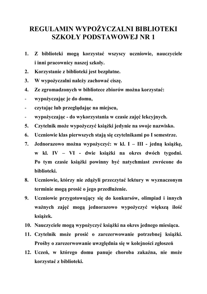REGULAMIN WYPOŻYCZALNI BIBLIOTEKI SZKOŁY PODSTAWOWEJ NR 1 1. Z biblioteki mogą korzystać wszyscy uczniowie, nauczyciele i inni pracownicy naszej szkoły. 2. Korzystanie z biblioteki jest bezpłatne. 3. W wypożyczalni należy zachować ciszę. 4. Ze zgromadzonych w bibliotece zbiorów można korzystać: - wypożyczając je do domu, - czytając lub przeglądając na miejscu, - wypożyczając - do wykorzystania w czasie zajęć lekcyjnych. 5. Czytelnik może wypożyczyć książki jedynie na swoje nazwisko. 6. Uczniowie klas pierwszych stają się czytelnikami po I semestrze. 7. Jednorazowo można wypożyczyć: w kl. I – III - jedną książkę, w kl. IV – VI - dwie książki na okres dwóch tygodni. Po tym czasie książki powinny być natychmiast zwrócone do biblioteki. 8. Uczniowie, którzy nie zdążyli przeczytać lektury w wyznaczonym terminie mogą prosić o jego przedłużenie. 9. Uczniowie przygotowujący się do konkursów, olimpiad i innych ważnych zajęć mogą jednorazowo wypożyczyć większą ilość książek. 10. Nauczyciele mogą wypożyczyć książki na okres jednego miesiąca. 11. Czytelnik może prosić o zarezerwowanie potrzebnej książki. Prośby o zarezerwowanie uwzględnia się w kolejności zgłoszeń 12. Uczeń, w którego domu panuje choroba zakaźna, nie może korzystać z biblioteki. 13. Wypożyczone materiały należy chronić przed zniszczeniem i zagubieniem. 14. Czytelnik przed wypożyczeniem powinien zwrócić uwagę na stan wypożyczonych materiałów i zauważone uszkodzenia zgłosić nauczycielowi bibliotekarzowi. 15. Okładka z folii ma chronić książkę przed zniszczeniem - nie należy jej zdejmować. 16. Czytelnik odpowiada materialnie za zniszczenie, uszkodzenie lub zagubienie wypożyczonych książek 17. W przypadku zniszczenia lub zagubienia książki czytelnik zobowiązany jest do odkupienia takiej samej lub innej pozycji wskazanej przez bibliotekarza. 18. Wszystkie wypożyczone przez uczniów i nauczycieli książki i inne materiały powinny być zwrócone do biblioteki na dwa tygodnie przed zakończeniem roku szkolnego. 19. W przypadku zmiany szkoły czytelnik zobowiązany jest przed odejściem rozliczyć się z biblioteką. 20. Każdy uczeń zobowiązany jest zapoznać się z Regulaminem wypożyczalni i zapamiętać godziny otwarcia biblioteki. BIBLIOTEKA SZKOLNA DYREKTOR SZKOŁY GLIWICE, 01.09.2006 r.