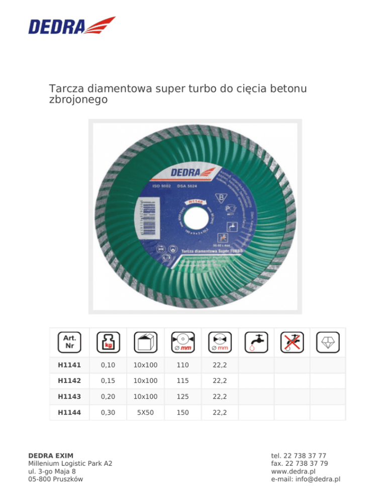 Tarcza diamentowa super turbo do cięcia betonu zbrojonego H1141 0,10 10x100 110 22,2 H1142 0,15 10x100 115 22,2 H1143 0,20 10x100 125 22,2 H1144 0,30 5X50 150 22,2 DEDRA EXIM Millenium Logistic Park A2 ul. 3-go Maja 8 05-800 Pruszków tel. 22 738 37 77 fax. 22 738 37 79 www.dedra.pl e-mail: [email protected] H1145 0,45 5X50 180 22,2 H1145E 0,45 5/50 180 25,4 H1147 0,63 5X50 230 22,2 DEDRA EXIM Millenium Logistic Park A2 ul. 3-go Maja 8 05-800 Pruszków tel. 22 738 37 77 fax. 22 738 37 79 www.dedra.pl e-mail: [email protected]