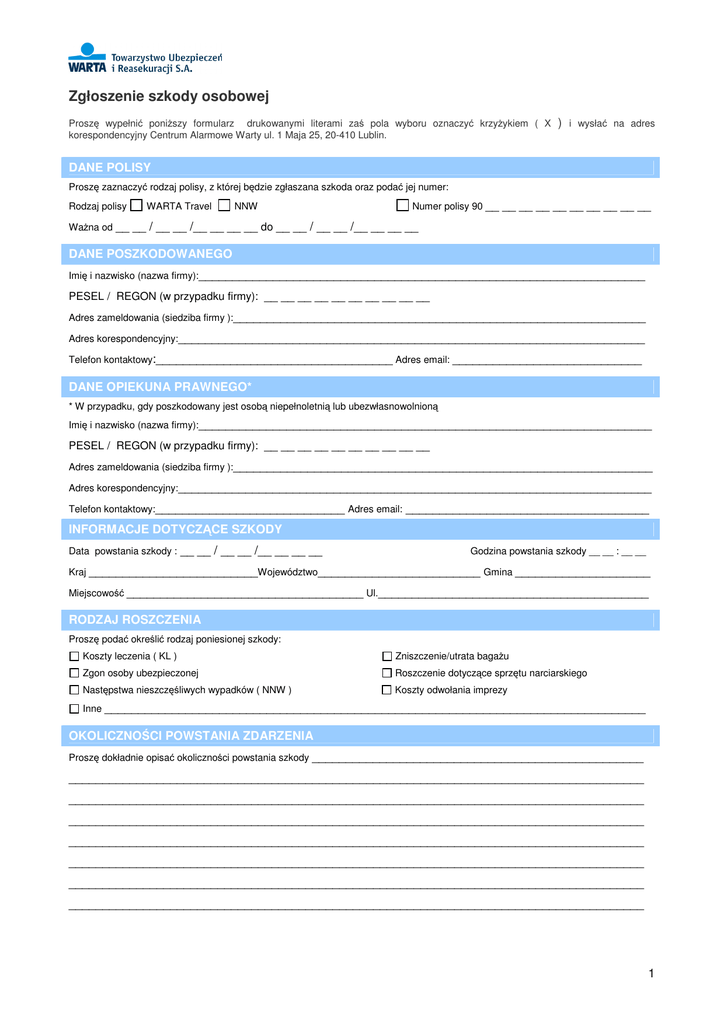 Zgłoszenie szkody osobowej Proszę wypełnić poniŜszy formularz drukowanymi literami zaś pola wyboru oznaczyć krzyŜykiem ( X korespondencyjny Centrum Alarmowe Warty ul. 1 Maja 25, 20-410 Lublin. ) i wysłać na adres DANE POLISY Proszę zaznaczyć rodzaj polisy, z której będzie zgłaszana szkoda oraz podać jej numer: Rodzaj polisy WaŜna od WARTA Travel Numer polisy 90 __ NNW __ __ __ __ __ __ __ __ __ __ __ / __ __ /__ __ __ __ do __ __ / __ __ /__ __ __ __ DANE POSZKODOWANEGO Imię i nazwisko (nazwa firmy):__________________________________________________________________ PESEL / REGON (w przypadku firmy): __ __ __ __ __ __ __ __ __ __ Adres zameldowania (siedziba firmy ):_____________________________________________________________ Adres korespondencyjny:_____________________________________________________________________ Telefon kontaktowy:___________________________________ Adres email: ____________________________ DANE OPIEKUNA PRAWNEGO* * W przypadku, gdy poszkodowany jest osobą niepełnoletnią lub ubezwłasnowolnioną Imię i nazwisko (nazwa firmy):___________________________________________________________________ PESEL / REGON (w przypadku firmy): __ __ __ __ __ __ __ __ __ __ Adres zameldowania (siedziba firmy ):______________________________________________________________ Adres korespondencyjny:______________________________________________________________________ Telefon kontaktowy:____________________________ Adres email: ____________________________________ INFORMACJE DOTYCZĄCE SZKODY Data powstania szkody : __ __ / __ __ /__ __ __ __ Godzina powstania szkody __ __ : __ __ Kraj _________________________Województwo________________________ Gmina ____________________ Miejscowość ___________________________________ Ul.________________________________________ RODZAJ ROSZCZENIA Proszę podać określić rodzaj poniesionej szkody: Koszty leczenia ( KL ) Zniszczenie/utrata bagaŜu Zgon osoby ubezpieczonej Roszczenie dotyczące sprzętu narciarskiego Następstwa nieszczęśliwych wypadków ( NNW ) Koszty odwołania imprezy Inne ________________________________________________________________________________ OKOLICZNOŚCI POWSTANIA ZDARZENIA Proszę dokładnie opisać okoliczności powstania szkody _________________________________________________ _____________________________________________________________________________________ _____________________________________________________________________________________ _____________________________________________________________________________________ _____________________________________________________________________________________ _____________________________________________________________________________________ _____________________________________________________________________________________ _____________________________________________________________________________________ 1 RODZAJ I ZAKRES SZKODY Proszę opisać dokładne obraŜenia ciała (z diagnozy lekarskiej), koszty leczenia itp.: _______________________________ _____________________________________________________________________________________ _____________________________________________________________________________________ _____________________________________________________________________________________ _____________________________________________________________________________________ _____________________________________________________________________________________ _____________________________________________________________________________________ _____________________________________________________________________________________ praworęczny leworęczny KOSZT LECZENIA I KWOTA ROSZCZENIA Czy zostały poniesione koszty leczenia? TAK NIE Proszę podać dokładne koszty leczenia ___________________________________________________________ Czy rachunki zostały opłacone? TAK NIE Kwota roszczenia_________________________________________________________________________ OKOLICZNOŚCI ZDARZENIA Czy została powiadomiona policja TAK* NIE * Nazwa i adres jednostki:___________________________________________________________________ Czy została udzielona pierwsza pomoc? TAK* NIE Dane osoby/jednostki udzielającej pierwszą pomoc:________________________________________________________________________________ _____________________________________________________________________________________ ADRESY PLACÓWEK MEDYCZNYCH, W KTÓRYCH UDZIELONO POMOCY Proszę podać dokładne miejsca i adresy placówek medycznych w których udzielno Pani/Panu pomocy: Nazwa placówki:__________________________________________________________________________ Adres: ________________________________________________________________________________ Nazwa placówki:__________________________________________________________________________ Adres: ________________________________________________________________________________ Nazwa placówki:__________________________________________________________________________ Adres: ________________________________________________________________________________ PROWADZONE LECZENIE Czy nastąpiło leczenie szpitalne? TAK NIE Czy nastąpiło leczenie ambulatoryjne? TAK NIE Czy konieczna była rehabilitacja? TAK NIE Czy leczenie zostało zakończone? TAK NIE Jak długo trwało leczenie? ____________________________________________________________________ INFORMACJE DODATKOWE Czy poszkodowany był niezdolny do pracy/nauki w następstwie powstałej szkody? TAK* NIE *Przez jak długi okres? ______________________________________________________________________ Czy poszkodowany w chwili wypadku był trzeźwy? TAK NIE Czy poszkodowany w chwili wypadku prowadził pojazd mechaniczny? TAK NIE 2 PoniŜsze punkty naleŜy wypełnić jedynie w przypadku gdy poszkodowany w chwili wypadku prowadził pojazd mechaniczny: Numer prawa jazdy _____________________________________ Kategoria ____________________________ Czy w chwili zdarzenia po