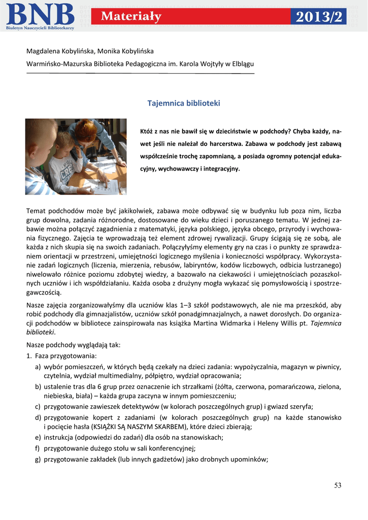 Magdalena Kobylińska, Monika Kobylińska Warmińsko-Mazurska Biblioteka Pedagogiczna im. Karola Wojtyły w Elblągu Tajemnica biblioteki Któż z nas nie bawił się w dzieciństwie w podchody? Chyba każdy, nawet jeśli nie należał do harcerstwa. Zabawa w podchody jest zabawą współcześnie trochę zapomnianą, a posiada ogromny potencjał edukacyjny, wychowawczy i integracyjny. Temat podchodów może być jakikolwiek, zabawa może odbywać się w budynku lub poza nim, liczba grup dowolna, zadania różnorodne, dostosowane do wieku dzieci i poruszanego tematu. W jednej zabawie można połączyć zagadnienia z matematyki, języka polskiego, języka obcego, przyrody i wychowania fizycznego. Zajęcia te wprowadzają też element zdrowej rywalizacji. Grupy ścigają się ze sobą, ale każda z nich skupia się na swoich zadaniach. Połączyłyśmy elementy gry na czas i o punkty ze sprawdzaniem orientacji w przestrzeni, umiejętności logicznego myślenia i konieczności współpracy. Wykorzystanie zadań logicznych (liczenia, mierzenia, rebusów, labiryntów, kodów liczbowych, odbicia lustrzanego) niwelowało różnice poziomu zdobytej wiedzy, a bazowało na ciekawości i umiejętnościach pozaszkolnych uczniów i ich współdziałaniu. Każda osoba z drużyny mogła wykazać się pomysłowością i spostrzegawczością. Nasze zajęcia zorganizowałyśmy dla uczniów klas 1–3 szkół podstawowych, ale nie ma przeszkód, aby robić podchody dla gimnazjalistów, uczniów szkół ponadgimnazjalnych, a nawet dorosłych. Do organizacji podchodów w bibliotece zainspirowała nas książka Martina Widmarka i Heleny Willis pt. Tajemnica biblioteki. Nasze podchody wyglądają tak: 1. Faza przygotowania: a) wybór pomieszczeń, w których będą czekały na dzieci zadania: wypożyczalnia, magazyn w piwnicy, czytelnia, wydział multimedialny, półpiętro, wydział opracowania; b) ustalenie tras dla 6 grup przez oznaczenie ich strzałkami (żółta, czerwona, pomarańczowa, zielona, niebieska, biała) – każda grupa zaczyna w innym pomieszczeniu; c) przygotowanie zawieszek detektywów (w kolorach poszczególnych grup) i gwiazd szeryfa; d) przygotowanie kopert z zadaniami (w kolorach poszczególnych grup) na każde stanowisko i pocięcie hasła (KSIĄŻKI SĄ NASZYM SKARBEM), które dzieci zbierają; e) instrukcja (odpowiedzi do zadań) dla osób na stanowiskach; f) przygotowanie dużego stołu w sali konferencyjnej; g) przygotowanie zakładek (lub innych gadżetów) jako drobnych upominków; 53 h) podchody wymagają zaangażowania co najmniej 8 pracowników (6 osób na stanowiskach z zadaniami oraz 2 osoby prowadzące i ogarniające całe zamieszanie). 2. Faza realizacji: a) przywitanie dzieci, krótka opowieść o zaginionym haśle biblioteki; b) podzielenie dzieci na 6 grup (grupa powinna liczyć przynajmniej 2 osoby); c) grupa wybiera między sobą szeryfa, który dostaje gwiazdę i ma za zadanie pilnować porządku i kolejności wykonywanych zadań; d) przydzielenie pozostałym członkom każdej z grup – koloru (rozdanie zawieszek detektywa w odpowiednim kolorze); e) omówienie zasad: każda grupa poszukuje na strzałkach swojego koloru, każda grupa zaczyna podchody od wyszukania stanowiska z jedynką (w swoim kolorze), np. grupa żółta szuka pomieszczenia oznaczonego żółtą jedynką, potem żółtą dwójką itd., można poruszać się po całej bibliotece, bez wychodzenia na zewnątrz i korzystania z windy, w każdym punkcie grupa wykonuje zadanie, dostaje kawałek hasła, obie rzeczy zabiera ze sobą, po zakończeniu szóstego zadania wszyscy spotykają się w sali konferencyjnej, szeryfowie wspólnie układają zaginione hasło: KSIĄŻKI SĄ NASZYM SKARBEM, pytamy dzieci czy lubią czytać, czy wiedzą, jak należy obchodzić się z książkami, dziękujemy za zajęcia i rozdajemy zakładki (gadżety). Zajęcia przeprowadzałyśmy już kilka razy dla elbląskich dzieci z klas 1–3. Nie miały problemu ze zrozumieniem instrukcji, orientacją w przestrzeni biblioteki (w której wcześniej nie były) i z zadaniami. Zarówno uczniowie, jak i nauczyciele byli pod wrażeniem naszych zajęć. Chwalili pomysł, możliwość samodzielnego poruszania się po nowym, ale bezpiecznym terenie, integrację dzieci oraz dobrą zabawę. Nasza biblioteka uczestniczyła też w polsko-brytyjskim projekcie „Blue and Green – edukacja poza klasą”. Projekt umożliwiał wizyty uczniów w krajach biorących udział w projekcie. Podczas ostatniej wizyty uczniowie i nauczyciele wzięli udział w podchodach w bibliotece. Uczniowie, w grupach polskoangielskich, szukali skarbu biblioteki. Mimo grup mieszanych językowo nie było problemów z zadaniami (polskie dzieci odczytywały polecenie i tłumaczyły je dzieciom angielskim, które wykonywały zadanie). Przymus komunikowania się w grupie niwelował bariery językowe, gdyż język stawał się elementem zwykłego działania i uczniowie skupiali się tylko na szybkim i poprawnym wykonaniu poleceń. Nie stresowali się poziomem znajomości języka obcego. Chciałyśmy pokazać naszą bibliotekę w sposób atrakcyjny i niecodzienny. Jako miejsce, w którym można przemieszczać się bez pomocy bibliotekarza, gdzie można wszędzie wejść, wszystko zobaczyć i głośno rozmawiać. Przygotowanie całych podchodów zajęło sporo czasu, ale efekt przeszedł nasze najśmielsze oczekiwania. Bibliografia: 1. Widmark, Martin, Willis, Helena. Brązowa księga : detektywistyczne łamigłówki Lassego i Mai. [Tł. i oprac. Barbara Gawryluk, Katarzyna Skalska]. Poznań. 2008. 2. Widmark, Martin, Willis, Helena. Srebrna księga : detektywistyczne łamigłówki Lassego i Mai. [Tł. i oprac. Katarzyna Skalska, Barbara Gawryluk]. Poznań. 2009. 3. Widmark, Martin, Willis, Helena. Tajemnica biblioteki. Przeł. ze szw. Barbara Gawryluk. Poznań. 2011. 54
