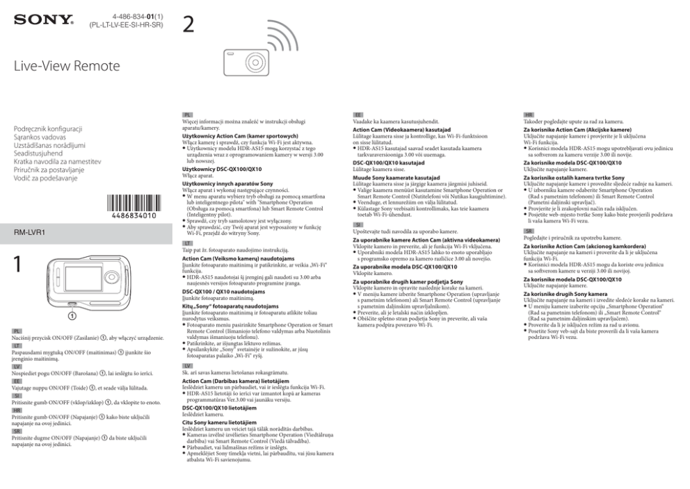 4-486-834-01(1) (PL-LT-LV-EE-SI-HR-SR) 2 Live-View Remote PL Podręcznik konfiguracji Sąrankos vadovas Uzstādīšanas norādījumi Seadistusjuhend Kratka navodila za namestitev Priručnik za postavljanje Vodič za podešavanje RM-LVR1 Więcej informacji można znaleźć w instrukcji obsługi aparatu/kamery. Użytkownicy Action Cam (kamer sportowych) Włącz kamerę i sprawdź, czy funkcja Wi-Fi jest aktywna. Użytkownicy modelu HDR-AS15 mogą korzystać z tego urządzenia wraz z oprogramowaniem kamery w wersji 3.00 lub nowszej. Użytkownicy DSC-QX100/QX10 Włącz aparat. Użytkownicy innych aparatów Sony Włącz aparat i wykonaj następujące czynności. W menu aparatu wybierz tryb obsługi za pomocą smartfona lub inteligentnego pilota" with "Smartphone Operation (Obsługa za pomocą smartfona) lub Smart Remote Control (Inteligentny pilot). Sprawdź, czy tryb samolotowy jest wyłączony. Aby sprawdzić, czy Twój aparat jest wyposażony w funkcję Wi-Fi, przejdź do witryny Sony. LT 1 PL Naciśnij przycisk ON/OFF (Zasilanie) , aby włączyć urządzenie. LT Paspausdami mygtuką ON/OFF (maitinimas) įjunkite šio įrenginio maitinimą. LV Nospiediet pogu ON/OFF (Barošana) , lai ieslēgtu šo ierīci. EE Vajutage nuppu ON/OFF (Toide) , et seade välja lülitada. SI Pritisnite gumb ON/OFF (vklop/izklop) , da vklopite to enoto. HR Pritisnite gumb ON/OFF (Napajanje) kako biste uključili napajanje na ovoj jedinici. SR Pritisnite dugme ON/OFF (Napajanje) da biste uključili napajanje na ovoj jedinici. Taip pat žr. fotoaparato naudojimo instrukciją. Action Cam (Veiksmo kamerų) naudotojams Įjunkite fotoaparato maitinimą ir patikrinkite, ar veikia „Wi-Fi“ funkcija. HDR-AS15 naudotojai šį įrenginį gali naudoti su 3.00 arba naujesnės versijos fotoaparato programine įranga. DSC-QX100 / QX10 naudotojams Įjunkite fotoaparato maitinimą. Kitų „Sony“ fotoaparatų naudotojams Įjunkite fotoaparato maitinimą ir fotoaparatu atlikite toliau nurodytus veiksmus. Fotoaparato meniu pasirinkite Smartphone Operation or Smart Remote Control (Išmaniojo telefono valdymas arba Nuotolinis valdymas išmaniuoju telefonu). Patikrinkite, ar išjungtas lėktuvo režimas. Apsilankykite „Sony“ svetainėje ir sužinokite, ar jūsų fotoaparatas palaiko „Wi-Fi“ ryšį. LV Sk. arī savas kameras lietošanas rokasgrāmatu. Action Cam (Darbības kamera) lietotājiem Ieslēdziet kameru un pārbaudiet, vai ir ieslēgta funkcija Wi-Fi. HDR-AS15 lietotāji šo ierīci var izmantot kopā ar kameras programmatūras Ver.3.00 vai jaunāku versiju. DSC-QX100/QX10 lietotājiem Ieslēdziet kameru. Citu Sony kameru lietotājiem Ieslēdziet kameru un veiciet tajā tālāk norādītās darbības. Kameras izvēlnē izvēlieties Smartphone Operation (Viedtālruņa darbība) vai Smart Remote Control (Viedā tālvadība). Pārbaudiet, vai lidmašīnas režīms ir izslēgts. Apmeklējiet Sony tīmekļa vietni, lai pārbaudītu, vai jūsu kamera atbalsta Wi-Fi savienojumu. EE Vaadake ka kaamera kasutusjuhendit. Action Cam (Videokaamera) kasutajad Lülitage kaamera sisse ja kontrollige, kas Wi-Fi-funktsioon on sisse lülitatud. HDR-AS15 kasutajad saavad seadet kasutada kaamera tarkvaraversiooniga 3.00 või uuemaga. DSC-QX100/QX10 kasutajad Lülitage kaamera sisse. Muude Sony kaamerate kasutajad Lülitage kaamera sisse ja järgige kaamera järgmisi juhiseid. Valige kaamera menüüst kasutamine Smartphone Operation or Smart Remote Control (Nutitelefoni või Nutikas kaugjuhtimine). Veenduge, et lennurežiim on välja lülitatud. Külastage Sony veebisaiti kontrollimaks, kas teie kaamera toetab Wi-Fi-ühendust. SI Upoštevajte tudi navodila za uporabo kamere. Za uporabnike kamere Action Cam (aktivna videokamera) Vklopite kamero in preverite, ali je funkcija Wi-Fi vključena. Uporabniki modela HDR-AS15 lahko to enoto uporabljajo s programsko opremo za kamero različice 3.00 ali novejšo. Za uporabnike modela DSC-QX100/QX10 Vklopite kamero. Za uporabnike drugih kamer podjetja Sony Vklopite kamero in opravite naslednje korake na kameri. V meniju kamere izberite Smartphone Operation (upravljanje s pametnim telefonom) ali Smart Remote Control (upravljanje s pametnim daljinskim upravljalnikom). Preverite, ali je letalski način izklopljen. Obiščite spletno stran podjetja Sony in preverite, ali vaša kamera podpira povezavo Wi-Fi. HR Također pogledajte upute za rad za kameru. Za korisnike Action Cam (Akcijske kamere) Uključite napajanje kamere i provjerite je li uključena Wi-Fi funkcija. Korisnici modela HDR-AS15 mogu upotrebljavati ovu jedinicu sa softverom za kameru verzije 3.00 ili novije. Za korisnike modela DSC-QX100/QX10 Uključite napajanje kamere. Za korisnike ostalih kamera tvrtke Sony Uključite napajanje kamere i provedite sljedeće radnje na kameri. U izborniku kamere odaberite Smartphone Operation (Rad s pametnim telefonom) ili Smart Remote Control (Pametni daljinski upravljač). Provjerite je li zrakoplovni način rada isključen. Posjetite web-mjesto tvrtke Sony kako biste provjerili podržava li vaša kamera Wi-Fi vezu. SR Pogledajte i priručnik za upotrebu kamere. Za korisnike Action Cam (akcionog kamkordera) Uključite napajanje na kameri i proverite da li je uključena funkcija Wi-Fi. Korisnici modela HDR-AS15 mogu da koriste ovu jedinicu sa softverom kamere u verziji 3.00 ili novijoj. Za korisnike modela DSC-QX100/QX10 Uključite napajanje kamere. Za korisnike drugih Sony kamera Uključite napajanje na kameri i izvedite sledeće korake na kameri. U meniju kamere izaberite opciju „Smartphone Operation“ (Rad sa pametnim telefonom) ili „Smart Remote Control“ (Rad sa pametnim daljinskim upravljačem). Proverite da li je isključen režim za rad u avionu. Posetite Sony veb-sajt da biste proverili da li vaša kamera podržava Wi-Fi vezu. 3 4A B 5 C XXXXXXXXXXX Allow connection from the device? Xxxxxx_123 HTHO:HDR-xxx... 00C1:HDR-xxx... 00W9:HDR-xxx... PL Sprawdź, czy powyższy ekran jest widoczny 