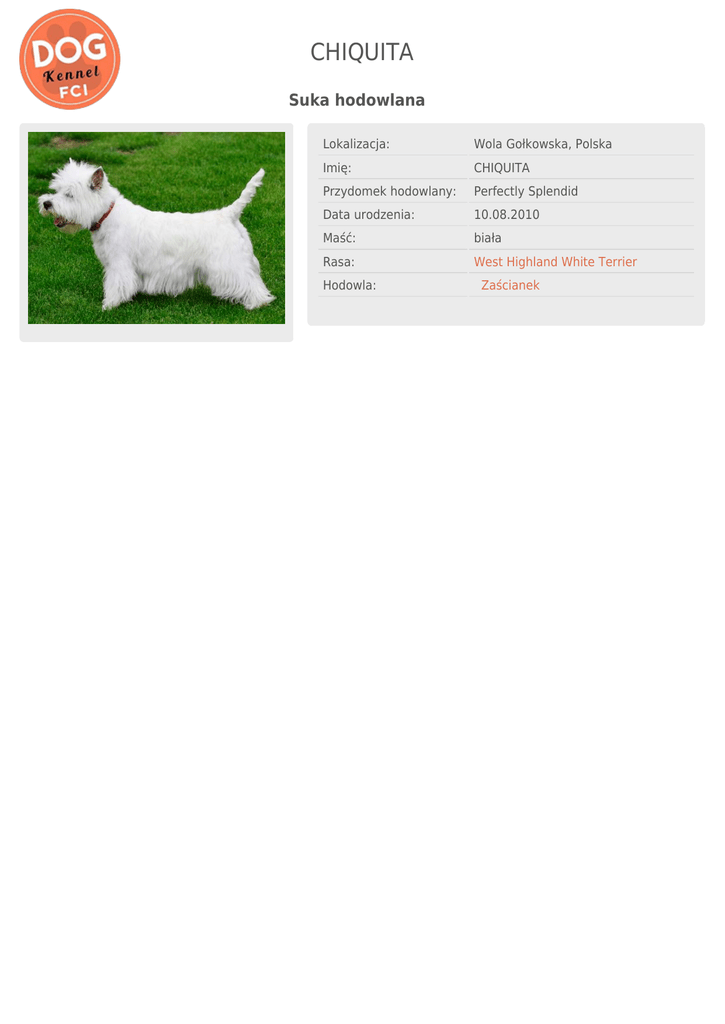 CHIQUITA Suka hodowlana Lokalizacja: Wola Gołkowska, Polska Imię: CHIQUITA Przydomek hodowlany: Perfectly Splendid Data urodzenia: 10.08.2010 Maść: biała Rasa: West Highland White Terrier Hodowla: Zaścianek