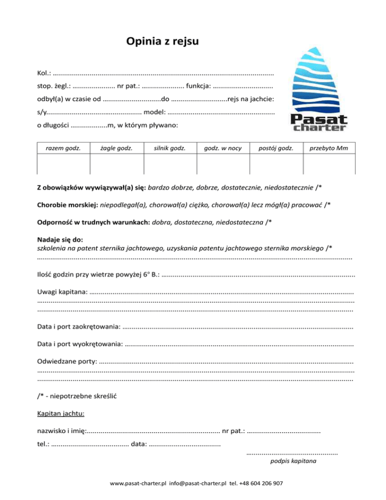 Opinia z rejsu Kol.: ….............................................................................................................. stop. żegl.: …................... nr pat.: …................... funkcja: …............................ odbył(a) w czasie od …...........................do …..........................rejs na jachcie: s/y..............................…................ model: ….................................................... o długości …................m, w którym pływano: razem godz. żagle godz. silnik godz. godz. w nocy postój godz. przebyto Mm Z obowiązków wywiązywał(a) się: bardzo dobrze, dobrze, dostatecznie, niedostatecznie /* Chorobie morskiej: niepodlegał(a), chorował(a) ciężko, chorował(a) lecz mógł(a) pracować /* Odporność w trudnych warunkach: dobra, dostateczna, niedostateczna /* Nadaje się do: szkolenia na patent sternika jachtowego, uzyskania patentu jachtowego sternika morskiego /* ….............................................................................................................................................................. Ilość godzin przy wietrze powyżej 6o B.: …................................................................................................ Uwagi kapitana: ….................................................................................................................................... …............................................................................................................................................................... ................................................................................................................................................................. Data i port zaokrętowania: …................................................................................................................... Data i port wyokrętowania: ….................................................................................................................. Odwiedzane porty: …............................................................................................................................... …............................................................................................................................................................... ................................................................................................................................................................. /* - niepotrzebne skreślić Kapitan jachtu: nazwisko i imię:.................................................................... nr pat.: …................................... tel.: …..................................... data: ….................................. …............................................ podpis kapitana www.pasat-charter.pl [email protected] tel. +48 604 206 907