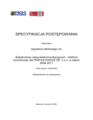 SPECYFIKACJA POSTĘPOWANIA dotycząca zapytania ofertowego na: Świadczenie usług telekomunikacyjnych - telefonii komórkowej dla PKM KATOWICE SP. z o.o. w latach 2009-2011 Znak sprawy: zo/08/2009 Zatwierdzono do stosowania Katowice, czerwiec 2009r. PKM Katowice sp. z o. o. zo/08/2009 SPECYFIKACJA POSTĘPOWANIA Dotycząca zapytania ofertowego na świadczenie usług telekomunikacyjnych – telefonii komórkowej dla PKM Katowice sp. z o.o. w latach 2009-2011 I. INFORMACJE O ZAMAWIAJĄCYM Przedsiębiorstwo Komunikacji Miejskiej Katowice sp. z o. o. z siedzibą w Katowicach ul. Mickiewicza 59, 40-085 Katowice, nr telefonu: 032 258 80 71 do 74, fax: 032 258 80 75, strona internetowa: www.pkm.katowice.pl, e-mail: [email protected]. II. POSTANOWIENIA OGÓLNE 1. Postępowanie o udzielenie zamówienia prowadzone jest w ramach zamówienia sektorowego podprogowego, jego wartość jest niższa od równowartości 412.000 euro. Przedmiotowe postępowanie prowadzone jest wyłącznie na zasadach niniejszej specyfikacji postępowania. Niniejsza specyfikacja postępowania ze wszystkimi do niej załącznikami oraz ewentualnymi późniejszymi uzupełnieniami stanowi komplet materiałów niezbędnych do przygotowania oferty. 2. Specyfikacja ze wszystkimi załącznikami została udostępniona na stronie internetowej PKM Katowice sp. z o. o.: www.pkm.katowice.pl/ogloszenia.php i pobierana jest samodzielnie przez Wykonawców. Wszelkie ewentualne modyfikacje, uzupełnienia i wyjaśnienia treści specyfikacji w toku postępowania będą umieszczone wyłącznie na wyżej podanej stronie internetowej. 3. Przed terminem składania ofert Wykonawcy winni sprawdzić ponownie zawartość folderu ogłoszenia na stronie www.pkm.katowice.pl w celu zapoznania się z treścią ewentualnych odpowiedzi lub wyjaśnień albo innymi wprowadzonymi zmianami. Za zapoznanie się z całością udostępnionych dokumentów odpowiada Wykonawca. 4. O udzielenie zamówienia mogą ubiegać się Wykonawcy posiadający uprawnienia do wykonania działalności objętej przedmiotem zamówienia, posiadający niezbędną wiedzą oraz doświadczenie a także dysponujący potencjałem technicznym oraz osobami zdolnymi do wykonania zamówienia, znajdujący się w sytuacji ekonomicznej i finansowej zapewniającej wykonanie zamówienia. 5. Ilekroć w treści jest mowa o SP, rozumie się przez to Specyfikacje Postępowania. 6. Zamawiający nie przewiduje zwrotu kosztów udziału w postępowaniu. III. OKREŚLENIE I OPIS PRZEDMIOTU ZAMÓWIENIA Przedmiotem zamówienia jest świadczenie usług telekomunikacyjnych – telefonii komórkowej dla PKM Katowice sp. z o.o. w latach 2009-2011. Zamawiający podzielił zapytanie na trzy części, gdzie część nr 1 zawiera specyfikację dla telefonów dla kierowców, część nr 2 dla telefonów dla pozostałych pracowników, a część nr 3 dla bezprzewodowej transmisji danych. Części nr 1 Poz. 1 Dla 519 aktywacji (nowe numery telefonów): telefony są zablokowane dla połączeń wychodzących (z wyjątkiem 5 numerów podanych przez Zamawiającego); zablokowana jest możliwość wysyłania wiadomości SMS oraz MMS; numery przeznaczone dla kierowców nie mogą generować innych kosztów dla firmy niż opłata abonamentowa. Poz. 2 Dla 1 aktywacji (nowy numer): Strona 2 z 15 PKM Katowice sp. z o.o. zo/08/2009 telefon czynny tylko w ramach tzw. korporacji (sieci firmowej) – bez dodatkowych opłat; zablokowana jest możliwość wysyłania wiadomości SMS oraz MMS; numery przeznaczone dla kierowców nie mogą generować innych kosztów dla firmy niż opłata abonamentowa; szacunkowa miesięczna liczba minut: do 36 minut do wszystkich sieci. Poz. 3 Dla 10 abonamentów (numery dotychczasowe pozostają): telefony są czynne tylko w ramach tzw. korporacji (sieci firmowej) – bez dodatkowych opłat; zablokowana jest możliwość wysyłania wiadomości SMS oraz MMS; numery przeznaczone dla kierowców nie mogą generować innych kosztów dla firmy niż opłata abonamentowa; szacunkowa miesięczna liczba minut: do 36 minut do wszystkich sieci. Poz. 4 Dla 2 abonamentów (telefony dyspozytorów) – zachowanie dotychczasowych numerów + dodatkowe dwa aparaty telefoniczne; telefony są czynne w ramach tzw. korporacji (sieci firmowej) - bez dodatkowych opłat; telefony nie mają blokad ; szacunkowa liczba dostępnych minut powyżej 790 – bez względu na sieć; telefony wyposażone w bluetooth, który umożliwi kontakt głosowy dyspozytora z kierowcami – możliwość zbiorczego wybierania numerów i wysłania sms oraz umożliwi pracę z telefonem bez potrzeby trzymania aparatu w ręce i umożliwi przemieszczanie się po pokoju. Część nr 2 (35 abonamentów – numery dotychczasowe pozostają oraz 2 aktywacje dodatkowe) abonamenty wg taryf (patrz tabelka) nie będą miały żadnych blokad, ich użytkownicy będą mogli korzystać z wszystkich oferowanych przez Państwa usług (pod warunkiem, że nie będzie to generowało dodatkowych opłat); bezpłatne rozmowy w ramach tzw. korporacji (sieci firmowej) - bez dodatkowych opłat bezpłatne minuty do wszystkich sieci wymienne na sms z wyjątkiem poz. 5 zachowanie dotychczasowych numerów plus 1 aktywacja dla poz. 1 oraz 1 aktywacja dla poz. 4 . oceniane będą wszystkie stałe miesięczne opłaty. lp 1 2 3 4 5 Szacunkowa liczba minut Powyżej 440 do wszystkich sieci Powyżej 220 do wszystkich sieci Powyżej 130 do wszystkich sieci Powyżej 72 do wszystkich sieci Powyżej do 36 wszystkich sieci Strona 3 z 15 Liczba abonamentów 3+1 7 13 7+1 5 PKM Katowice sp. z o.o. zo/08/2009 Warunki dla części 1 i 2: cena telefonu – dla części 1 i 2: 1 zł netto (wykaz modeli telefonów dostępnych w zaproponowanej ofercie dla części 1 i 2). Zamawiający dopuszcza możliwość zaoferowania kilku modeli telefonów dla danej taryfy. gwarancja na telefon minimum 12 miesięcy szybki serwis (odbiór zepsutego telefonu w ciągu 12 godz. – w dni robocze od momentu zgłoszenia usterki oraz