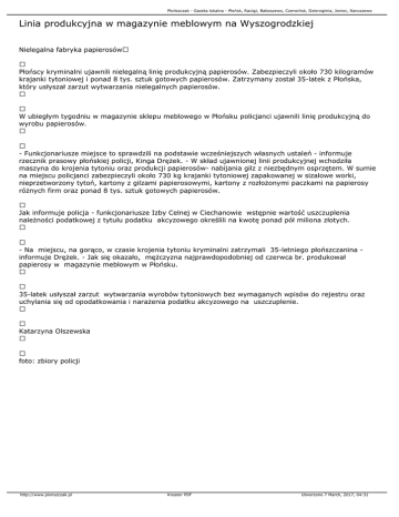 Płońszczak - Gazeta lokalna - Płońsk, Raciąż, Baboszewo, Czerwińsk, Dzierzążnia, Joniec, Naruszewo Linia produkcyjna w magazynie meblowym na Wyszogrodzkiej Nielegalna fabryka papierosów Płońscy kryminalni ujawnili nielegalną linię produkcyjną papierosów. Zabezpieczyli około 730 kilogramów krajanki tytoniowej i ponad 8 tys. sztuk gotowych papierosów. Zatrzymany został 35-latek z Płońska, który usłyszał zarzut wytwarzania nielegalnych papierosów. W ubiegłym tygodniu w magazynie sklepu meblowego w Płońsku policjanci ujawnili linię produkcyjną do wyrobu papierosów. - Funkcjonariusze miejsce to sprawdzili na podstawie wcześniejszych własnych ustaleń - informuje rzecznik prasowy płońskiej policji, Kinga Drężek. - W skład ujawnionej linii produkcyjnej wchodziła maszyna do krojenia tytoniu oraz produkcji papierosów- nabijania gilz z niezbędnym osprzętem. W sumie na miejscu policjanci zabezpieczyli około 730 kg krajanki tytoniowej zapakowanej w sizalowe worki, nieprzetworzony tytoń, kartony z gilzami papierosowymi, kartony z rozłożonymi paczkami na papierosy różnych firm oraz ponad 8 tys. sztuk gotowych papierosów. Jak informuje policja - funkcjonariusze Izby Celnej w Ciechanowie wstępnie wartość uszczuplenia należności podatkowej z tytułu podatku akcyzowego określili na kwotę ponad pół miliona złotych. - Na miejscu, na gorąco, w czasie krojenia tytoniu kryminalni zatrzymali 35-letniego płońszczanina informuje Drężek. - Jak się okazało, mężczyzna najprawdopodobniej od czerwca br. produkował papierosy w magazynie meblowym w Płońsku. 35-latek usłyszał zarzut wytwarzania wyrobów tytoniowych bez wymaganych wpisów do rejestru oraz uchylania się od opodatkowania i narażenia podatku akcyzowego na uszczuplenie. Katarzyna Olszewska foto: zbiory policji http://www.plonszczak.pl Kreator PDF Utworzono 7 March, 2017, 04:31