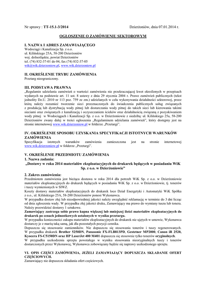 Nr sprawy : TT-15.1-3/2014 Dzierżoniów, dnia 07.01.2014 r. OGŁOSZENIE O ZAMÓWIENIU SEKTOROWYM I. NAZWA I ADRES ZAMAWIAJĄCEGO Wodociągi i Kanalizacja Sp. z o.o. ul. Kilińskiego 25A, 58-200 Dzierżoniów woj. dolnośląskie, powiat Dzierżoniów tel. (74) 832-37-01 do 04, fax (74) 832-37-05 [email protected], www.wik.dzierzoniow.pl II. OKREŚLENIE TRYBU ZAMÓWIENIA Przetarg nieograniczony. III. PODSTAWA PRAWNA „Regulamin udzielania zamówień o wartości zamówienia nie przekraczającej kwot określonych w przepisach wydanych na podstawie art. 11 ust. 8 ustawy z dnia 29 stycznia 2004 r. Prawo zamówień publicznych (tekst jednolity Dz.U. 2010 nr 113 poz. 759 ze zm.) udzielanych w celu wykonywania działalności sektorowej, przez którą należy rozumieć tworzenie sieci przeznaczonych do świadczenia publicznych usług związanych z produkcją lub dystrybucją wody pitnej lub dostarczania wody pitnej do takich sieci lub kierowania takimi sieciami oraz związanych z kanalizacją i oczyszczaniem ścieków oraz działalnością związaną z pozyskiwaniem wody pitnej w Wodociągach i Kanalizacji Sp. z o.o. w Dzierżoniowie z siedzibą: ul. Kilińskiego 25a, 58-200 Dzierżoniów zwany dalej w treści ogłoszenia „Regulaminem udzielania zamówień”, który dostępny jest na stronie internetowej www.wik.dzierzoniow.pl w folderze „Przetargi”. IV. OKREŚLENIE SPOSOBU UZYSKANIA SPECYFIKACJI ISTOTNYCH WARUNKÓW ZAMÓWIENIA Specyfikacja istotnych warunków zamówienia www.wik.dzierzoniow.pl w folderze „Przetargi”. zamieszczona jest na stronie internetowej V. OKREŚLENIE PRZEDMIOTU ZAMÓWIENIA 1. Nazwa zadania: „Dostawy w roku 2014 materiałów eksploatacyjnych do drukarek będących w posiadaniu WiK Sp. z o.o. w Dzierżoniowie” 2. Zakres zamówienia: Przedmiotem zamówienia jest bieżąca dostawa w roku 2014 dla potrzeb WiK Sp. z o.o. w Dzierżoniowie materiałów eksploatacyjnych do drukarek będących w posiadaniu WiK Sp. z o.o. w Dzierżoniowie, tj. tonerów i tuszy wymienionych w SIWZ. Koszty dostawy materiałów eksploatacyjnych do drukarek loco Dział Energetyki i Automatyki WiK Spółka z o.o., ul. Kilińskiego 25A, 58-200 Dzierżoniów ponosi Wykonawca. W przypadku dostaw złej lub nieodpowiedniej jakości należy uwzględnić reklamację w terminie do 3 dni licząc od dnia zgłoszenia wady. W przypadku złej jakości druku, Zamawiający ma prawo do wymiany tuszu lub tonera. Należy przewidzieć dostawy 1 sztukowe. Zamawiający zastrzega sobie prawo kupna większej lub mniejszej ilości materiałów eksploatacyjnych do drukarek po cenach jednostkowych ustalonych w wyniku przetargu. W przypadku konieczności zakupu materiałów eksploatacyjnych do drukarek nie ujętych w umowie, Wykonawca dostarczy je z marżą taką samą, jak dla pozostałych pozycji cennika. Dopuszcza się stosowanie zamienników. Nie dopuszcza się stosowania tonerów i tuszy regenerowanych. W przypadku drukarek Brother 5250DN, Panasonic FX-FLB813PD, Gestetner MP2000, Canon iR 2520, Kyocera FS-C5150DN oraz HP LaserJet 400 M401 dopuszcza się stosownie tylko tonerów oryginalnych. W przypadku uszkodzenia sprzętu powstałego w wyniku stosowania nieoryginalnych tuszy i tonerów dostarczonych przez Wykonawcę, Wykonawca zobowiązany będzie się naprawy uszkodzonego sprzętu. VI. OPIS CZĘŚCI ZAMÓWIENIA, JEŻELI ZAMAWIAJĄCY DOPUSZCZA SKŁADANIE OFERT CZĘŚCIOWYCH. Zamawiający nie dopuszcza składania ofert częściowych. VII. INFORMACJA O MOŻLIWOŚCI ZŁOŻENIA OFERTY WARIANTOWEJ Zamawiający nie dopuszcza składania ofert wariantowych. Oferta alternatywna (wariantowa) nie będzie brana pod uwagę i zostanie odrzucona wraz z ofertą podstawową. VIII. TERMIN WYKONANIA ZAMÓWIENIA Wymagany termin realizacji całości zamówienia: od dnia podpisania umowy do dnia 31.12.2014 r. Wymagany termin dostawy zamówionej partii materiałów: 1 dzień licząc od dnia zgłoszenia zapotrzebowania przez Zamawiającego. IX. OPIS WARUNKÓW UDZIAŁU W POSTĘPOWANIU DOKONYWANIA OCENY SPEŁNIANIA TYCH WARUNKÓW ORAZ SPOSOBU W przetargu mogą wziąć udział Wykonawcy uprawnieni do występowania w obrocie prawnym, spełniający warunki zawarte w rozdziale IV ust. 4.1 „Regulaminu udzielania zamówień” oraz inne warunki określone w Specyfikacji istotnych warunków zamówienia. X. WYMAGANIA DOTYCZĄCE WADIUM Wadium nie wymagane. XI. KRYTERIA OCENY OFERT I ICH ZNACZENIE • Cena – 100%. XII. MIEJSCE I TERMIN SKŁADANIA I OTWARCIA OFERT Oferty w zamkniętej kopercie z napisem: „Wodociągi i Kanalizacja Spółka z o.o., ul. Kilińskiego 25A, 58-200 Dzierżoniów. Oferta przetargowa – „Dostawy w roku 2014 materiałów eksploatacyjnych do drukarek będących w posiadaniu WiK Sp. z o.o. w Dzierżoniowie”. Nie otwierać przed dniem 20.01.2014 r. godz. 1100 należy składać w Sekretariacie WiK Spółki z o.o. przy ul. Kilińskiego 25A w Dzierżoniowie w terminie do dnia 20.01.2014 r. do godz. 1030. Otwarcie ofert nastąpi w dniu 20.01.2014 r. o godz. 1100 w siedzibie WiK Sp. z o.o. przy ul. Kilińskiego 25A w Dzierżoniowie (sala posiedzeń na I piętrze). XIII. TERMIN ZWIĄZANIA OFERTĄ 30 dni od upływu terminu składania ofert. XIV. OSOBY UPRAWNIONE DO KONTAKTÓW Z WYKONAWCAMI Osobami ze strony Zamawiającego upoważnionymi do porozumiewania się z Wykonawcami w celu udzielania wyjaśnień są: • w sprawach formalnych – Justyna Woźna – Inspektor ds. technicznych WiK Sp. z o.o. w Dzierżoniowie w godz. 800 do 1400, tel. (074) 832-20-75, • w sprawach dotyczących asortymentu – Rafał Rychlik – Informatyk WiK Sp. z o.o. w Dzierżoniowie w godz. 800 do 1400, tel. (074) 832-20-82. XV. ADRES STRONY INTERNETOWEJ, NA KTÓREJ UMIESZCZONO OGŁOSZENIE O ZAMÓWIENIU www.wik.dzierzoniow.pl Zamawiający zastrzega sobie prawo unieważnienia postępowania, na podstawie decyzji Zarządu Spółki, bez podania przyczyn. Prezes Zarządu WiK Sp. z o.o. w Dzierżoniowie
