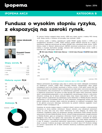 lipiec 2016 IPOPEMA AKCJI KATEGORIA B Fundusz o wysokim stopniu ryzyka, z ekspozycją na szeroki rynek. Łukasz Jakubowski CFA Krzysztof Cesarz CFA, CAIA W czerwcu fundusz osiągnął stopę zwrotu -1,85% przy stopie zwrotu z indeksu WIG równej -2,4%. Stopa zwrotu z funduszu od początku roku wyniosła -3,65%. W czerwcu spółki z indeksu największych spółek WIG20 spadły średnio o 3,18% a po uwzględnieniu dywidend o 2,39%. Indeks średnich spółek mWIG40 obsunął się o 2,25% a stosunkowo najgorzej zachowywał się indeks sWIG80, który odnotował stopę zwrotu -3,59%. Główny indeks w Stanach Zjednoczonych S&P500 zanotował symboliczny wzrost o 0,1% a indeksy w Europie Zachodniej spadały, niemiecki DAX zanotował stopę zwrotu -5,68% a francuski CAC -5,95% (patrz wykres W1). WIG Index (Polska) DAX Index (Niemcy) CAC40 Index (Francja) S&P500 Index (USA) 15% 10% 5% Stopy zwrotu % 1 miesiąc -1,85 3 miesiące -7,12 6 miesięcy -3,65 1 rok -13,30 2 lata -10,73 -5% -10% -15% 20% czerwiec 2015 Historia wycen PLN 031 120 021 110 011 100 001 90 09 30.06.2016 Alokacja % akcji Gotówka - 13,45% Makro alokacji Akcje - 86,56% czerwiec 2016 Zmiany wybranych indeksów akcji w 2016 roku W1 130 06.12.2011 31.12.2015 0% Słabsze zachowanie się polskiego rynku akcji w czerwcu tym razem odbiegało od tendencji na światowych rynkach. Indeks MSCI Emerging Markets, reprezentujący akcje krajów rozwijających się (w tym Polskę), zanotował w czerwcu wzrost o 3,3% (patrz wykres W2). Na lepsze zachowanie się indeksów krajów rozwijających się miała wpływ czerwcowa decyzja FED o pozostawieniu stóp procentowych na niezmienionym poziomie oraz poprawa koniunktury w segmencie surowcowym. Na pewno na taką decyzję FED wpływ miały czerwcowe, słabsze dane z amerykańskiej gospodarki, w tym szczególności rozczarowujący odczyt z rynku pracy. Aktualnie oczekuję się, że dalsze podwyżki będą miały miejsce najwcześniej w 2017 roku. Drugim istotnym wydarzeniem był zaskakujący wynik referendum w Wielkiej Brytanii odnośnie członkostwa w Unii Europejskiej. Rynki na wynik referendum zareagowały bardzo nerwowo, jednak ostatecznie znaczący wpływ widoczny był głównie na indeksach europejskich. Była to też główna przyczyna słabszego zachowania się polskich indeksów względem innych indeksów krajów rozwijających się. Uważamy, że wzrosty mające miejsce w ostatnich dniach czerwca wynikały z antycypowania interwencji ze strony banków centralnych. Naszym zdaniem, przy aktualnych poziomach wycen na rynku akcji oraz przy niskich rentowność na rynku obligacji, nie należy tego oczekiwać. Dodatkowo należy się spodziewać sporego zamieszania wokół samego procesu opuszczenia UE przez Wielką Brytanię. Na ten moment trwają poszukiwania nowego premiera w Wielkiej Brytanii, gdyż po przegranym referendum David Cameron podał się do dymisji. Następnie, nowy lider musi zgłosić chęć opuszczenia UE, zgodnie z artykułem 50 traktatu UE. Rozpocznie to okres negocjacji pomiędzy obiema stronami i trwać będzie maksymalnie 2 lata. W związku z powyższym generalnie rozpoczniemy zwiększania zaangażowania w akcje w sytuacji: 1) dokona się druga część korekty na rynkach akcji; 2) W. Brytania odstąpi od zamiaru opuszczenia UE; 3) banki centralne dostarczą oczekiwaną płynność na rynki finansowe. lipiec 2016 IPOPEMA AKCJI KATEGORIA B W czerwcu najlepiej zachowujące się sektory na warszawskiej giełdzie to surowce (WIG SUROWCE) +10,8%, deweloperzy (WIG DEWELOPERZY 1,63%) i paliwa (WIG PALIWA) 1,42% patrz wykres W3. Wszystkie pozostałe indeksy sektorowe zamknęły miesiąc z ujemną stopą zwrotu. Najgorzej wypadły zaś budownictwo (WIG BUDOWNICTWO) -9,83% i telekomunikacja (WIG TELEKOMUNIKACJA) -6,8% - patrz wykres W4. Waluty % USD - 0,02% EUR - 4,92% Na koniec czerwca zaangażowanie w akcje (uwzględniając instrumenty pochodne) wyniosła ok. 88%. WIG Index mWIG40 Index sWIG80 Index MSCI Emerging Markets Index 20% 15% 10% PLN - 95,06% 5% 31.12.2015 0% -5% Sektory % Banki 24,51 Przemysł paliwowy 13,36 Ubezpieczenia 8,71 Przemysł metalowy 5,84 Energetyka 5,42 Handel detaliczny 5,40 Media 5,00 Informatyka 3,95 Rynek kapitałowy 3,12 Handel hurtowy 3,04 Pozostałe 21,64 -10% -15% czerwiec 2015 czerwiec 2016 Zmiany wybranych indeksów polskich i MSCI Emerging Markets W2 WIG Index (Polska) DAX Index (Niemcy) CAC40 Index (Francja) S&P500 Index (USA) 50% 40% 30% 20% 10% Struktura geograficzna % Polska 98,00 Niemcy 1,94 Francja 0,05 31.12.2015 0% -10% -20% czerwiec 2015 Zmiany wybranych indeksów branżowych na GPW W3 WIG Index (Polska) WIG Budownictwo czerwiec 2016 WIG Telekomunikacja 30% 20% 10% 31.12.2015 0% -10% -20% czerwiec 2015 Zmiany wybranych indeksów branżowych na GPW W4 czerwiec 2016 Niniejszy dokument służy wyłącznie celom informacyjnym, nie stanowi rekomendacji czy doradztwa inwestycyjnego i nie może stanowić podstawy do podjęcia decyzji inwestycyjnej. Wszelkie informacje dotyczące planów, oczekiwań, strategii, czy polityki inwestycyjnej co do przyszłości, stanowią odzwierciedlenie wiedzy i oczekiwań zarządzającego na moment sporządzenia niniejszego dokumentu, w związku z czym mogą one ulec wielokrotnej zmianie w zależności od rozwoju sytuacji na rynkach finansowych. W skrajnym przypadku może to oznaczać, że oczekiwania te mogą ulec zmianie, także zanim niniejszy dokument dotrze do jego adresata. IPOPEMA Towarzystwo Funduszy Inwestycyjnych S.A., ul. Próżna 9, 00-107 Warszawa, Sąd Rejonowy dla m. st. Warszawy, XII Wydział Gospodarczy nr KRS 0000278264, NIP 108-000-30-69, kapitał zakładowy 10.599.441 zł w całości opłacony. IPOPEMA TFI posiada zezwolenie na prowadzenie działalności udzielone przez Komisję Nadzoru Finansowego. Organem nadzoru dla IPOPEMA TFI jest Komisja Nadzoru Finansowego.