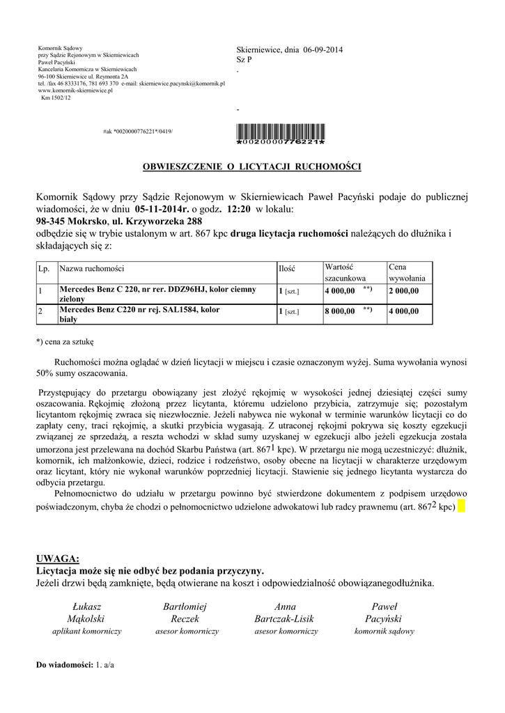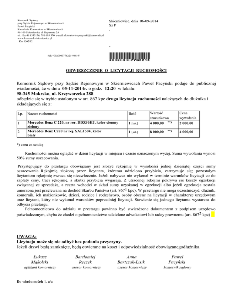 Komornik Sądowy przy Sądzie Rejonowym w Skierniewicach Paweł Pacyński Kancelaria Komornicza w Skierniewicach 96-100 Skierniewice ul. Reymonta 2A tel. /fax 46 8333176, 781 693 370 e-mail: [email protected] www.komornik-skierniewice.pl Km 1502/12 Skierniewice, dnia 06-09-2014 Sz P . #ak *0020000776221*/0419/ *0020000776221* OBWIESZCZENIE O LICYTACJI RUCHOMOŚCI Komornik Sądowy przy Sądzie Rejonowym w Skierniewicach Paweł Pacyński podaje do publicznej wiadomości, że w dniu 05-11-2014r. o godz. 12:20 w lokalu: 98-345 Mokrsko, ul. Krzyworzeka 288 odbędzie się w trybie ustalonym w art. 867 kpc druga licytacja ruchomości należących do dłużnika i składających się z: Lp. Nazwa ruchomości Ilość 1 Mercedes Benz C 220, nr rer. DDZ96HJ, kolor ciemny zielony Mercedes Benz C220 nr rej. SAL1584, kolor biały 1 [szt.] Wartość szacunkowa 4 000,00 **) 1 [szt.] 8 000,00 2 **) Cena wywołania 2 000,00 4 000,00 *) cena za sztukę Ruchomości można oglądać w dzień licytacji w miejscu i czasie oznaczonym wyżej. Suma wywołania wynosi 50% sumy oszacowania. Przystępujący do przetargu obowiązany jest złożyć rękojmię w wysokości jednej dziesiątej części sumy oszacowania. Rękojmię złożoną przez licytanta, któremu udzielono przybicia, zatrzymuje się; pozostałym licytantom rękojmię zwraca się niezwłocznie. Jeżeli nabywca nie wykonał w terminie warunków licytacji co do zapłaty ceny, traci rękojmię, a skutki przybicia wygasają. Z utraconej rękojmi pokrywa się koszty egzekucji związanej ze sprzedażą, a reszta wchodzi w skład sumy uzyskanej w egzekucji albo jeżeli egzekucja została umorzona jest przelewana na dochód Skarbu Państwa (art. 8671 kpc). W przetargu nie mogą uczestniczyć: dłużnik, komornik, ich małżonkowie, dzieci, rodzice i rodzeństwo, osoby obecne na licytacji w charakterze urzędowym oraz licytant, który nie wykonał warunków poprzedniej licytacji. Stawienie się jednego licytanta wystarcza do odbycia przetargu. Pełnomocnictwo do udziału w przetargu powinno być stwierdzone dokumentem z podpisem urzędowo poświadczonym, chyba że chodzi o pełnomocnictwo udzielone adwokatowi lub radcy prawnemu (art. 8672 kpc) UWAGA: Licytacja może się nie odbyć bez podania przyczyny. Jeżeli drzwi będą zamknięte, będą otwierane na koszt i odpowiedzialność obowiązanegodłużnika. Łukasz Mąkolski Bartłomiej Reczek Anna Bartczak-Lisik Paweł Pacyński aplikant komorniczy asesor komorniczy asesor komorniczy komornik sądowy Do wiadomości: 1. a/a