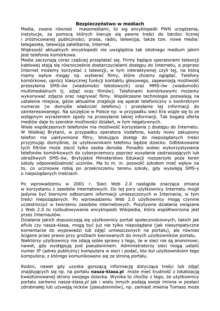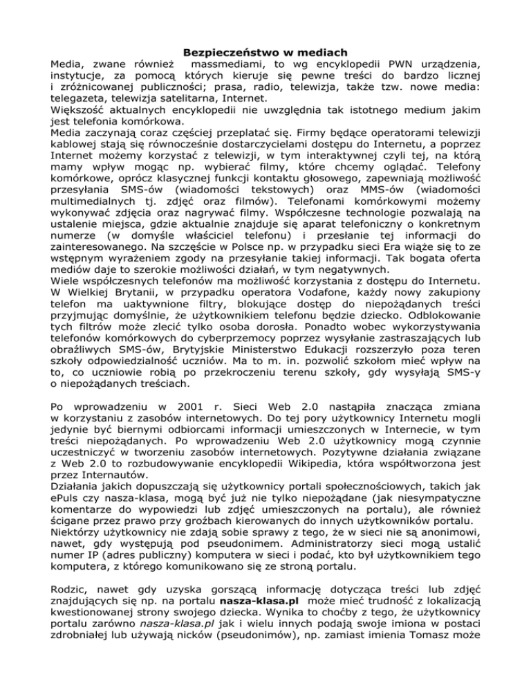 Bezpieczeństwo w mediach Media, zwane równieŜ massmediami, to wg encyklopedii PWN urządzenia, instytucje, za pomocą których kieruje się pewne treści do bardzo licznej i zróŜnicowanej publiczności; prasa, radio, telewizja, takŜe tzw. nowe media: telegazeta, telewizja satelitarna, Internet. Większość aktualnych encyklopedii nie uwzględnia tak istotnego medium jakim jest telefonia komórkowa. Media zaczynają coraz częściej przeplatać się. Firmy będące operatorami telewizji kablowej stają się równocześnie dostarczycielami dostępu do Internetu, a poprzez Internet moŜemy korzystać z telewizji, w tym interaktywnej czyli tej, na którą mamy wpływ mogąc np. wybierać filmy, które chcemy oglądać. Telefony komórkowe, oprócz klasycznej funkcji kontaktu głosowego, zapewniają moŜliwość przesyłania SMS-ów (wiadomości tekstowych) oraz MMS-ów (wiadomości multimedialnych tj. zdjęć oraz filmów). Telefonami komórkowymi moŜemy wykonywać zdjęcia oraz nagrywać filmy. Współczesne technologie pozwalają na ustalenie miejsca, gdzie aktualnie znajduje się aparat telefoniczny o konkretnym numerze (w domyśle właściciel telefonu) i przesłanie tej informacji do zainteresowanego. Na szczęście w Polsce np. w przypadku sieci Era wiąŜe się to ze wstępnym wyraŜeniem zgody na przesyłanie takiej informacji. Tak bogata oferta mediów daje to szerokie moŜliwości działań, w tym negatywnych. Wiele współczesnych telefonów ma moŜliwość korzystania z dostępu do Internetu. W Wielkiej Brytanii, w przypadku operatora Vodafone, kaŜdy nowy zakupiony telefon ma uaktywnione filtry, blokujące dostęp do niepoŜądanych treści przyjmując domyślnie, Ŝe uŜytkownikiem telefonu będzie dziecko. Odblokowanie tych filtrów moŜe zlecić tylko osoba dorosła. Ponadto wobec wykorzystywania telefonów komórkowych do cyberprzemocy poprzez wysyłanie zastraszających lub obraźliwych SMS-ów, Brytyjskie Ministerstwo Edukacji rozszerzyło poza teren szkoły odpowiedzialność uczniów. Ma to m. in. pozwolić szkołom mieć wpływ na to, co uczniowie robią po przekroczeniu terenu szkoły, gdy wysyłają SMS-y o niepoŜądanych treściach. Po wprowadzeniu w 2001 r. Sieci Web 2.0 nastąpiła znacząca zmiana w korzystaniu z zasobów internetowych. Do tej pory uŜytkownicy Internetu mogli jedynie być biernymi odbiorcami informacji umieszczonych w Internecie, w tym treści niepoŜądanych. Po wprowadzeniu Web 2.0 uŜytkownicy mogą czynnie uczestniczyć w tworzeniu zasobów internetowych. Pozytywne działania związane z Web 2.0 to rozbudowywanie encyklopedii Wikipedia, która współtworzona jest przez Internautów. Działania jakich dopuszczają się uŜytkownicy portali społecznościowych, takich jak ePuls czy nasza-klasa, mogą być juŜ nie tylko niepoŜądane (jak niesympatyczne komentarze do wypowiedzi lub zdjęć umieszczonych na portalu), ale równieŜ ścigane przez prawo przy groźbach kierowanych do innych uŜytkowników portalu. Niektórzy uŜytkownicy nie zdają sobie sprawy z tego, Ŝe w sieci nie są anonimowi, nawet, gdy występują pod pseudonimem. Administratorzy sieci mogą ustalić numer IP (adres publiczny) komputera w sieci i podać, kto był uŜytkownikiem tego komputera, z którego komunikowano się ze stroną portalu. Rodzic, nawet gdy uzyska gorszącą informację dotycząca treści lub zdjęć znajdujących się np. na portalu nasza-klasa.pl moŜe mieć trudność z lokalizacją kwestionowanej strony swojego dziecka. Wynika to choćby z tego, Ŝe uŜytkownicy portalu zarówno nasza-klasa.pl jak i wielu innych podają swoje imiona w postaci zdrobniałej lub uŜywają nicków (pseudonimów), np. zamiast imienia Tomasz moŜe być uŜyte zdrobnienie Tomek lub Tommy (bo tak mówią do niego koleŜanki i koledzy w szkole lub grupie, w której często przebywa), a ponadto zamiast "normalnej" nazwy miasta zamieszkania uŜytkownik portalu wpisuje "Gdyniolandia" lub "Arkolandia" i identyfikacja poprzez wyszukiwanie w portalu po nazwisku i mieście kończy się niepowodzeniem. Pomocne rodzicom mogą być programy naleŜące do grupy tzw. KONTROLI RODZICIELSKIEJ, których zadaniem jest m. in. filtrowanie dostępu do Internetu. Jednym z takich programów jest BENIAMIN, w ostatnich latach zalecany przez Ministerstwo Edukacji Narodowej. Podstawową zaletą programu BENIAMIN jest moŜliwość darmowego korzystania z niego. Na internetowej stronie programu www.beniamin.pl moŜna pobrać plik instalacyjny, a takŜe znaleźć instrukcję jak skonfigurować program. W razie kłopotów z pobraniem pliku instalacyjnego ze strony programu BENIAMIN moŜna go pobrać korzystając z serwisu www.dobreprogramy.pl Tam teŜ znajdują się inne programy do KONTROLI RODZICIELSKIEJ. Zwiększeniu bezpieczeństwa w sieci Internet pomaga polski serwis HOTLINE, który umoŜliwia anonimowe zgłoszenie poprzez wypełnienie formularza w Internecie, jeśli ktoś natknie się na pornografie dziecięcą lub inne nielegalne treści, takie jak rasizm czy ksenofobia. Adresy tego serwisu to: www.hotline.org.pl www.dyzurnet.pl Zgłoszenia moŜna dokonać takŜe dzwoniąc na infolinię: 0 801 615 005 Zrozumienie pojęć związanych z Internetem moŜe ułatwić słowniczek jaki został umieszczony w dziale "Profesjonaliści (pomocne informacje dla nauczycieli)" pod adresem www.dzieckowsieci.pl MoŜemy tam dowiedzieć się takŜe: co to jest czat, grooming, spam, uzaleŜnienie od komputera i Internetu, złośliwe oprogramowanie, szkodliwe treści, a takŜe wartość i wiarygodność źródeł internetowych. Podręczniki przygotowane dla dzieci i rodziców przez UPC Polska znajdują się pod adresem: www.upclive.pl/dzieci/2089/20899445.html Kary za szkolną cyberprzemoc Źródło: Dziennik 2008-09-24 Posłowie zapowiadają wprowadzenie przepisów umoŜliwiających zastosowanie ostrych kar nieletnich za nagrywanie wulgarnych filmów i udostępnianie ich w Internecie. Takie przypadki zdarzaj