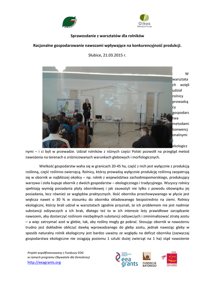 Sprawozdanie z warsztatów dla rolników Racjonalne gospodarowanie nawozami wpływające na konkurencyjność produkcji. Słubice, 21.03.2015 r. W warsztata ch wzięli udział rolnicy prowadzą cy gospodars twa metodami konwencj onalnymi i ekologicz nymi – i ci byli w przewadze. Udział rolników z różnych części Polski pozwolił na przegląd metod nawożenia na terenach o zróżnicowanych warunkach glebowych i morfologicznych. Wielkość gospodarstw waha się w granicach 20-45 ha, część z nich jest wyłącznie z produkcją roślinną, część roślinno-zwierzęcą. Rolnicy, którzy prowadzą wyłącznie produkcję roślinną zaopatrują się w obornik w najbliższej okolicy – np. rolnik z województwa zachodniopomorskiego, produkujący warzywa i zioła kupuje obornik z dwóch gospodarstw – ekologicznego i tradycyjnego. Wszyscy rolnicy spełniają wymóg posiadania płyty obornikowej i jak zauważyli nie tylko z powodu obowiązku jej posiadania, lecz również ze względów praktycznych. Ilość obornika przechowywanego w płycie jest większa nawet o 30 % w stosunku do obornika składowanego bezpośrednio na ziemi. Rolnicy ekologiczni, którzy brali udział w warsztatach zgodnie przyznali, że ich problemem nie jest nadmiar substancji odżywczych a ich brak, dlatego też to w ich interesie leży prawidłowe zarządzanie nawozem, aby dostarczyć roślinom niezbędnych substancji odżywczych i zminimalizować stratę azotu – a więc zatrzymać azot w glebie, tak, aby rośliny mogły go pobrać. Stosując obornik w nawożeniu trudno jest dokładnie obliczyć dawkę wprowadzanego do gleby azotu, jednak nawożąc gleby w sposób naturalny rolnik ekologiczny jest bardzo uważny ze względu na deficyt obornika (zazwyczaj gospodarstwa ekologiczne nie osiągają poziomu 1 sztuki dużej zwierząt na 1 ha) stąd nawożenie Projekt współfinansowany z Funduszy EOG w ramach programu Obywatele dla Demokracji http://eeagrants.org przebiega pod specjalnym nadzorem. W momencie stosowania obornika uważa się, aby nie został wypłukany z gleby. Nawozu nie stosuje się późną jesienią, gdyż w momencie, kiedy ziemia nie jest zamarznięta azot jest wypłukiwany do głębszych warstw i wzrastające wiosną rośliny nie są w stanie go pobrać. Można zastosować obornik jesienią, jednak wyłącznie pod rośliny. Na pastwiska stosuje się obornik, ale na wiosnę. Przepis mówiący o stosowaniu nawozów do listopada jest trochę nietrafiony, gdyż wszystko zależy od warunków, w których nawóz jest stosowany. Stare szkoły uprawy mówiły o tym, że obornik stosuje się na jesień, jednak gdy zostanie wypłukany to na wiosnę gleba nie będzie mieć właściwej dawki substancji odżywczych dla prawidłowego wzrostu roślin i będzie konieczne dodatkowe nawożenie – straty w tym przypadku będą podwójne. Inaczej, jeśli obornik zastosuje się we wrześniu, kiedy temperatura gleby jest wysoka, dzięki czemu korzenie roślin dobrze absorbują azot. Innym sposobem na maksymalne wykorzystanie azotu w rolnictwie jest stosowanie nawozów w sposób bardzo precyzyjny – małymi dawkami, bezpośrednio pod roślinę lub opylając liście. Obornik powinien być przekompostowany. Jeśli na płycie obornikowej jest nachylenie to podcieki mogą być stosowane do nawożenia liści. W taki sposób można nawozić zboża, jednak nie warzywa ani owoce. Aby zatrzymać substancje odżywcze w glebie konieczne jest wcześniejsze przekompostowanie obornika - ściółkowanie słomą lub sianem oraz wprowadzenie do gleby dżdżownic i efektywnych mikroorganizmów, które działają również w warunkach beztlenowych. Dzięki takiemu zabiegowi, kompostowanie trwa 6 tygodni. Innym zabiegiem do stosowania jest poplon – na polu cały czas powinno coś rosnąć, zostawianie gleby bez rośliny powoduje szybką utratę cennych składników odżywczych, a co za tym idzie zanieczyszczenie wód. Kolejnym poruszonym tematem była kwestia właściwego odczynu gleby i wapnowania gleb. Aby rośliny mogły prawidłowo wykorzystać wprowadzany do gleby azot, odczyn gleby musi być odpowiedni. Wprowadzanie wapna do gleby, czyli tzw. wapnowanie daje efekt krótkotrwałego, złudnego zwiększenia wydajności produkcji rolnej, gdyż wapno powoduje zamieranie życia glebowego, w początkowej fazie stanowi to pożywkę dla roślin, jednak w późniejszym okresie, pozbawiona mikroorganizmów gleba nie funkcjonuje właściwie. Skutecznym i bezpiecznym sposobem na zmianę odczynu gleby na bardziej korzystny jest wprowadzanie roślin, które zmieniają odczyn gleby w sposób stopniowy – a nie jak w przypadku wapna i dolomitu – gwałtowny, dzięki czemu mikroorganizmy nie wymierają. Wsparcie rolnictwa ekologicznego poprzez dotowanie zakupu wapna jest więc działaniem wbrew rolnictwu ekologicznemu. Ważną z punktu widzenia nawożenia jest też kwestia fosforu. Fosfor jest obecny w glebie, jednak w nieaktywnej formie, aby go zaktywować należy uprawiać rośliny, które go uaktywnią. Do najbardziej skutecznych zalicza się grykę, facelię i lędźwian. Z koniczyną należy być ostrożnym, gdyż Projekt współfinansowany z Funduszy EOG w ramach programu Obywatele dla Demokracji http://eeagrants.org wyciąga z gleby potas – również konieczny do prawidłowego wzrostu roślin. Wskaźnikiem dużej zawartości fosforu w glebie jest występowanie jemioły. Podsumowując – działania podejmowane przez rolników w celu maksymalnego wykorzystania substancji odżywczych wprowadzanych do gleb polegają na: 1. precyzyjnym dawkowaniu 2. odpowiednim podawaniu nawozu (bezpośrednio pod roślin rosnące lub wschodzące) 3. stosowaniu odpowiednich terminów nawożenia 4. braniu pod uwagę warunków atmosferycznych 5. wykorzystaniu skoszonej trawy pod krzaki owoców 6. stosowaniu roślin motylkowych wiążących azot w glebie (co 3-4 lata w zależności od potrzeb), jednak ważne przy tym jest, aby stosować różne gatunki roślin m