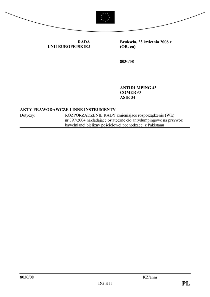 RADA UNII EUROPEJSKIEJ Bruksela, 23 kwietnia 2008 r. (OR. en) 8030/08 ANTIDUMPING 43 COMER 63 ASIE 34 AKTY PRAWODAWCZE I INNE INSTRUMENTY Dotyczy: ROZPORZĄDZENIE RADY zmieniające rozporządzenie (WE) nr 397/2004 nakładające ostateczne cło antydumpingowe na przywóz bawełnianej bielizny pościelowej pochodzącej z Pakistanu 8030/08 KZ/anm DG E II PL ROZPORZĄDZENIE RADY (WE) nr…/2008 z dnia zmieniające rozporządzenie (WE) nr 397/2004 nakładające ostateczne cło antydumpingowe na przywóz bawełnianej bielizny pościelowej pochodzącej z Pakistanu RADA UNII EUROPEJSKIEJ, uwzględniając Traktat ustanawiający Wspólnotę Europejską, uwzględniając rozporządzenie Rady (WE) nr 384/96 z dnia 22 grudnia 1995 r. w sprawie ochrony przed dumpingowym przywozem z krajów niebędących członkami Wspólnoty Europejskiej („rozporządzenie podstawowe”)1, uwzględniając art. 1 ust. 4 rozporządzenia Rady (WE) nr 397/2004 z dnia 2 marca 2004 r. nakładającego ostateczne cło antydumpingowe na przywóz bawełnianej bielizny pościelowej pochodzącej z Pakistanu2, uwzględniając wniosek przedstawiony przez Komisję po konsultacji z Komitetem Doradczym, 1 2 Dz.U. L 56 z 06.03.1996, s. 1. Rozporządzenie ostatnio zmienione rozporządzeniem Rady (WE) nr 2117/2005 (Dz.U. L 340 z 23.12.2005, s. 17). Dz.U. L 66 z 4.3.2004, s. 1. Rozporządzenie ostatnio zmienione rozporządzeniem Rady (WE) nr 925/2007 (Dz.U. L 202 z 3.8.2007, s. 1). 8030/08 KZ/anm DG E II 1 PL a także mając na uwadze, co następuje: A. (1) POPRZEDNIA PROCEDURA Rozporządzeniem (WE) nr 397/2004 Rada nałożyła ostateczne cło antydumpingowe na przywóz do Wspólnoty bawełnianej bielizny pościelowej klasyfikowanej zgodnie z kodami CN ex 6302 21 00 (kody TARIC 6302 21 00 81, 6302 21 00 89), ex 6302 22 90 (kod TARIC 6302 22 90 19), ex 6302 31 00 (kod TARIC 6302 31 00 90) i ex 6302 32 90 (kod TARIC 6302 32 90 19), pochodzącej z Pakistanu. Na wszystkie przedsiębiorstwa prowadzące wywóz produktu objętego postępowaniem do Wspólnoty nałożono obowiązujące w całym kraju cło antydumpingowe wynoszące 13,1 %. (2) W maju 2006 r. po wszczęciu z urzędu, na mocy art. 11 ust. 3 rozporządzenia podstawowego, częściowego tymczasowego przeglądu środków antydumpingowych Rada rozporządzeniem (WE) nr 695/20061 zmieniła rozporządzenie (WE) nr 397/2004 i ustaliła nowe stawki celne wynoszące od 0 % to 8,5 % w oparciu o nowy okres objęty dochodzeniem zawierający się pomiędzy dniem 1 kwietnia 2003 r. a dniem 31 marca 2004 r. Biorąc pod uwagę dużą liczbę współpracujących producentów eksportujących, ustalono odpowiednią próbę. (3) Przedsiębiorstwom objętym próbą przyznano indywidualne stawki celne ustalone podczas dochodzenia przeglądowego, natomiast innym współpracującym przedsiębiorstwom nieobjętym próbą przyznano ważoną średnią stawkę cła wynoszącą 5,8 %. Cło wynoszące 8,5 % zostało nałożone na przedsiębiorstwa, które albo nie zgłosiły się, albo nie współpracowały w dochodzeniu. 1 Dz.U. L 121 z 6.5.2006, s. 14. 8030/08 KZ/anm DG E II 2 PL (4) Art. 1 ust. 4 rozporządzenia (WE) nr 397/2004 przyznaje pakistańskim producentom eksportującym, którzy spełniają trzy kryteria wymienione w tym samym artykule, możliwość bycia traktowanym jak przedsiębiorstwa współpracujące nieobjęte próbą („status podmiotu traktowanego jako nowy producent eksportujący” lub „SNPE”). (5) W rozporządzeniu (WE) nr 925/2007 określono ustalenia dotyczące osiemnastu pakistańskich przedsiębiorstw, które wystąpiły z wnioskiem o SNPE. Czterem spośród tych przedsiębiorstw przyznano SNPE, natomiast wnioski pozostałych czternastu przedsiębiorstw odrzucono. B. (6) WNIOSKI NOWYCH PRODUCENTÓW EKSPORTUJĄCYCH Trzynaście kolejnych pakistańskich przedsiębiorstw zwróciło się z wnioskiem o przyznanie im SNPE. (7) Przeprowadzono badanie w celu ustalenia, czy każdy wnioskodawca spełnia kryteria określone w art. 1 ust. 4 rozporządzenia (WE) nr 397/2004 niezbędne do przyznania mu SNPE poprzez sprawdzenie, czy: – nie dokonywał wywozu do Wspólnoty produktu opisanego powyżej w motywie (1) w okresie od 1 kwietnia 2003 r. do 31 marca 2004 r., – nie jest powiązany z żadnym eksporterem lub producentem, na którego nałożono środki przewidziane w niniejszym rozporządzeniu, oraz – rzeczywiście dokonywał wywozu do Wspólnoty produktu objętego postępowaniem po okresie objętym dochodzeniem, na którym oparte są środki, lub stał się stroną nieodwołalnego zobowiązania umownego do wywozu do Wspólnoty znaczącej ilości wspomnianych produktów. 8030/08 KZ/anm DG E II 3 PL (8) Do wszystkich wnioskodawców wysłano kwestionariusz z prośbą o dostarczenie dowodów dla wykazania, że spełniają trzy powyższe kryteria. (9) Na mocy art. 1 ust. 4 rozporządzenia (WE) nr 397/2004 producentom eksportującym spełniającym te trzy kryteria można przyznać stawkę celną mającą zastosowanie do przedsiębiorstw współpracujących nieobjętych próbą t.j. 5,8 %. C. USTALENIA PRZEDSIĘBIORSTWA, KTÓRE UDZIELIŁY NIEPEŁNEJ ODPOWIEDZI (10) Trzy pakistańskie przedsiębiorstwa składające wniosek o SNPE nie odpowiedziały na pytania zawarte w kwestionariuszu wstępnym. Nie było zatem możliwe ustalenie, czy przedsiębiorstwa te spełniały kryteria określone w art. 1 ust. 4 rozporządzenia (WE) nr 397/2004, a więc ich wniosek musiał zostać odrzucony. Przedsiębiorstwa te zostały poinformowane, że ich wnioski nie będą już rozpatrywane i umożliwiono im przedstawienie uwag. Żadnych uwag jednak nie otrzymano. PRZEDSIĘBIORSTWA, KTÓRE UDZIELIŁY PEŁNEJ ODPOWIEDZI (11) W przypadku dwóch pakistańskich producentów eksportujących zbadanie przedłożonych informacji wykazało, że przedstawili oni wystarczające dowody, by uznać, że spełniają trzy kryteria określone w art. 1 ust. 4 rozporządzenia (WE) nr 397/2004. Zatem tym dwóm producentom można przyzna
