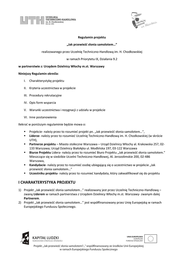 Regulamin projektu „Jak przewieźć słonia samolotem…” realizowanego przez Uczelnię Techniczno-Handlową im. H. Chodkowskiej w ramach Priorytetu IX, Działania 9.2 w partnerstwie z: Urzędem Dzielnicy Włochy m.st. Warszawy Niniejszy Regulamin określa: I. Charakterystykę projektu II. Kryteria uczestnictwa w projekcie III. Procedury rekrutacyjne IV. Opis form wsparcia V. Warunki uczestnictwa i rezygnacji z udziału w projekcie VI. Inne postanowienia Ilekroć w poniższym regulaminie będzie mowa o: Projekcie- należy przez to rozumieć projekt pn. „Jak przewieźć słonia samolotem…”, Liderze- należy przez to rozumieć Uczelnię Techniczno-Handlową im. H. Chodkowskiej (w skrócie UTH), Partnerze projektu – Miasto stołeczne Warszawa – Urząd Dzielnicy Włochy al. Krakowska 257, 02133 Warszawa; Urząd Dzielnicy Białołęka ul. Modlińska 197, 03-122 Warszawa Biurze Projektu Lidera- należy przez to rozumieć Biuro Projektu „Jak przewieźć słonia samolotem.” Mieszczące się w siedzibie Uczelni Techniczno-Handlowej, Al. Jerozolimskie 200, 02-486 Warszawa, Kandydacie- należy przez to rozumieć osobę ubiegającą się o uczestnictwo w projekcie „Jak przewieźć słonia samolotem…” Uczestniku projektu- należy przez to rozumieć kandydata, który zakwalifikował się do projektu I CHARAKTERYSTYKA PROJEKTU 1) Projekt „Jak przewieźć słonia samolotem…” realizowany jest przez Uczelnię Techniczno-Handlową – zwaną Liderem w ramach partnerstwa z Urzędem Dzielnicy Włochy m.st. Warszawy- zwanym dalej Partnerem. 2) Projekt „Jak przewieźć słonia samolotem…” jest współfinansowany przez Unię Europejską w ramach Europejskiego Funduszu Społecznego. 3) Okres realizacji projektu: 01.01.2014r. do 01.03.2015r. 4) W ramach projektu zaplanowana jest realizacja następujących form wsparcia: a) zajęcia pozalekcyjne z zakresu: towarowego transportu lotniczego i frazeologii lotniczej w języku angielskim b) doradztwo edukacyjno-zawodowe c) praktyki zawodowe II KRYTERIA UCZESTNICTWA W PROJEKCIE 1) Do projektu może przystąpić osoba spełniająca na dzień rekrutacji następujące kryteria: a) osoba, która ukończyła gimnazjum, b) osoba posiadająca status ucznia szkoły technikum nr 9 w Warszawie, c) samodzielnie, z własnej inicjatywy zainteresowana udziałem w wymienionych formach wsparcia. 2) Warunkiem udziału w szkoleniu jest złożenie podpisanych dokumentów wymienionych poniżej: a) formularz zgłoszeniowy; b) deklaracji udziału w projekcie wraz ze zgodą na przetwarzanie danych osobowych Powyższe dokumenty muszą zostać podpisane przez uczestnika projektu oraz w przypadku, kiedy nie jest to osoba pełnoletnia przez jej prawnego opiekuna 3) Pierwszeństwo udziału w projekcie będą mieli/miały uczniowie/uczennice, którzy wykazują się motywacją do wzięcia udziału w zajęciach oraz uzyskali dobre wyniki w nauce – kryterium będzie mierzone na podstawie opinii wychowawcy i średniej za ostatni semestr nauki przed przystąpieniem do projektu. 4) Warunki szczegółowe udziału w projekcie: a) nabór będzie prowadzony przez Koordynatora projektu z pomocą Specjalisty ds. rekrutacji i obsługi uczestników b) wypełnione dokumenty można składać w sekretariacie Technikum nr 9 w Warszawie, ul. Gładka 16 w godzinach pracy sekretariatu tj. 8.00-16.00 od poniedziałku do piątku w terminie od 1.02.14 do 30.04.14 i 1.06.14 do 31.08.14 c) osoby, które będą zgłaszać się do udziału w projekcie będą kwalifikowane przez dyrektora szkoły, koordynatora projektu i specjalistę ds. rekrutacji i obsługi uczestników d) szczegółowe kryteria kwalifikacyjne obejmują średnią z ocen 5) Na podstawie przeprowadzonej procedury rekrutacji będą tworzone listy podstawowe, a w przypadku większej liczby chętnych listy rezerwowe. 6) Osoba z listy rezerwowej może zostać zakwalifikowana na listę podstawową w przypadku rezygnacji uczestnika z listy podstawowej. 7) Udział uczestników w projekcie jest bezpłatny, koszty jego organizacji pokrywane są ze środków Unii Europejskiej w ramach Europejskiego Funduszu Społecznego i budżetu państwa. III PROCEDURY REKRUTACYJNE 1) Przyjęcie zgłoszenia nie jest równoznaczne z zakwalifikowaniem kandydata do udziału w projekcie. 2) W przypadku większej liczby chętnych osób dla każdej formy wsparcia powstanie dodatkowa lista rezerwowa uczestników. W przypadku rezygnacji lub niedopełnienia wymogów formalnych przez osoby zakwalifikowane na ich miejsce wprowadzone zostaną osoby z listy rezerwowej (dotyczy zmian przez rozpoczęciem szkolenia). 3) Osoby, które zostaną zakwalifikowane do udziału w projekcie zostaną powiadomione przez Dyrektora Szkoły. 4) Uczestnik potwierdza, że dane osobowe podane przez niego w formularzu zgłoszeniowym są prawdziwe i zobowiązuje się do bezzwłocznego informowania Partnera o każdej ich zmianie. 5) Niezłożenie i niewypełnienie powyższych dokumentów w wyznaczonym terminie jest równoznaczne z brakiem możliwości udziału we wsparciu oferowanym w ramach projektu. 6) Komisja rekrutacyjna dokona ostatecznego zatwierdzenia listy uczestników w oparciu o następujące kryteria: a) kompletne i poprawnie wypełnione wszystkie dokumenty rekrutacyjne; b) spełnienie warunków formalnych i szczegółowych wymienionych w regulaminie; c) limit miejsc. 7) Z przeprowadzenia postępowania rekrutacyjnego sporządzany jest protokół potwierdzający zakwalifikowanie ucznia do projektu. 8) Terminy składania dokumentów rekrutacyjnych będą publikowane na stronie internetowej www.narwik.vdl.pl 9) Informacje zawarte w dokumentach rekrutacyjnych wykorzystywane będą wyłącznie dla celów realizacji projektu pn. „Jak przewieźć słonia samolotem…” - na potrzeby procesu rekrutacji, monitoringu, sprawozdawczości i ewaluacji oraz na potrzeby ewidencji szkoleniowej. 10) Lider i Partner projektu zapewniają poufność otrzymanych informacji i danych osobowyc