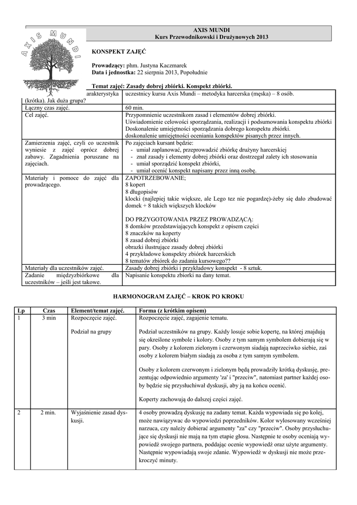 AXIS MUNDI Kurs Przewodnikowski i Drużynowych 2013 KONSPEKT ZAJĘĆ Prowadzący: phm. Justyna Kaczmarek Data i jednostka: 22 sierpnia 2013, Popołudnie Temat zajęć: Zasady dobrej zbiórki. Konspekt zbiórki. Uczestnicy zajęć – charakterystyka uczestnicy kursu Axis Mundi – metodyka harcerska (męska) – 8 osób. (krótka). Jak duża grupa? Łączny czas zajęć. 60 min. Cel zajęć. Przypomnienie uczestnikom zasad i elementów dobrej zbiórki. Uświadomienie celowości sporządzania, realizacji i podsumowania konspektu zbiórki Doskonalenie umiejętności sporządzania dobrego konspektu zbiórki. doskonalenie umiejętności oceniania konspektów pisanych przez innych. Zamierzenia zajęć, czyli co uczestnik Po zajęciach kursant będzie: wyniesie z zajęć oprócz dobrej - umiał zaplanować, przeprowadzić zbiórkę drużyny harcerskiej zabawy. Zagadnienia poruszane na - znał zasady i elementy dobrej zbiórki oraz dostrzegał zalety ich stosowania zajęciach. - umiał sporządzić konspekt zbiórki, - umiał ocenić konspekt napisany przez inną osobę. Materiały i pomoce do zajęć dla ZAPOTRZEBOWANIE; prowadzącego. 8 kopert 8 długopisów klocki (najlepiej takie większe, ale Lego tez nie pogardzę)-żeby się dało zbudować domek + 8 takich większych klocków Materiały dla uczestników zajęć. Zadanie międzyzbiórkowe uczestników – jeśli jest takowe. dla DO PRZYGOTOWANIA PRZEZ PROWADZĄCĄ: 8 domków przedstawiających konspekt z opisem części 8 znaczków na koperty 8 zasad dobrej zbiórki obrazki ilustrujące zasady dobrej zbiórki 4 przykładowe konspekty zbiórek harcerskich 8 tematów zbiórek do zadania kursowego?? Zasady dobrej zbiórki i przykładowy konspekt - 8 sztuk. Napisanie konspektu zbiorki na dany temat. HARMONOGRAM ZAJĘĆ – KROK PO KROKU Lp 1 Czas 3 min Element/temat zajęć. Rozpoczęcie zajęć. Forma (z krótkim opisem) Rozpoczęcie zajęć, zagajenie tematu. Podział na grupy Podział uczestników na grupy. Każdy losuje sobie kopertę, na której znajdują się określone symbole i kolory. Osoby z tym samym symbolem dobierają się w pary. Osoby z kolorem zielonym i czerwonym siadają naprzeciwko siebie, zaś osoby z kolorem białym siadają za osoba z tym samym symbolem. Osoby z kolorem czerwonym i zielonym będą prowadziły krótką dyskusję, prezentując odpowiednio argumenty 'za' i "przeciw", natomiast partner każdej osoby będzie się przysłuchiwał dyskusji, aby ją na końcu ocenić. Koperty zachowują do dalszej części zajęć. 2 2 min. Wyjaśnienie zasad dyskusji. 4 osoby prowadzą dyskusję na zadany temat. Każda wypowiada się po kolej, może nawiązywac do wypowiedzi poprzedników. Kolor wylosowany wcześniej narzuca, czy należy dobierać argumenty "za" czy "przeciw". Osoby przysłuchujące się dyskusji nie mają na tym etapie głosu. Następnie te osoby oceniają wypowiedź swojego partnera, poddając ocenie wypowiedź oraz użyte argumenty. Następnie wypowiadają swoje zdanie. Wypowiedź w dyskusji nie może przekroczyć minuty. Na koniec dyskusji odbywa się głosowanie. 3 10 min. Dyskusja Temat dyskusji: Czy do każdej prowadzonej formy (zbiórka, warsztaty, zajęcia itp.) należy przygotować konspekt? Dlaczego? 4 3 min. Podsumowanie dyskusji Krótkie podsumowanie, zebranie najważniejszych wniosków. 5. 2 min. Budowanie klocków 6. 5 min. Metafora – przygotowanie konspektu jest jak budowa domu. domku z Każdy ma za zadanie zbudować w ciągu minuty domek z klocków. Porównujemy domki, zapewne każdy będzie trochę inny, ale każdy będzie miał fundamenty, ściany, dach, może jakieś okna i drzwi. Każdy otwiera swoją kopertę, w której znajduje się schematyczny domek z opisem poszczególnych części. Uczestnicy czytają opis, prowadząca dopowiada i podsumowuje. Fundamenty – coś, bez czego dalsza budowa nie będzie miała sensu, bo dom bez fundamentów nie będzie trwały. Nasze fundamenty to CEL zbiórki. Zanim cokolwiek ruszymy dalej, musimy się zastanowić – po co nam ta zbiórka. Ściany – ograniczają dom, ale jednocześnie dają nam w nim przestrzenie. Nasze ściany, to nasze WARUNKI ZBIÓRKI – czas, miejsce, osoby do pomocy. Musimy się zastanowić, jak je wykorzystać, aby zrealizować CEL. Okna i drzwi – wypełniają ścianę, wpuszczają do środka światło, ludzi i wszyst ko inne. Nasze okna i drzwi to nasze formy. Muszą pasować do ścian, a więc do czasu, miejsca i okoliczności, ale nadal pozostaje nam pełna dowolność jeśli chodzi o ich wykorzystanie. Dach – dach wieńczy dom, bez niego się dom obyć nie może, choć bez niego prawie wygląda na ukończony. Nasz dach to MATERIAŁY DO PRZYGOTOWANIA. Żeby dobrze przygotować zbiórkę, na etapie konspektu musimy wiedzieć, co nam jest potrzebne. Bez tego nawet najlepszy pomysł się nie uda i praca pójdzie w błoto. Domki z klocków zachowują na później. 7. 5 min. Poszukiwanie zasad budowa domu ma swoje zasady, zatem tworzenie zbiórki i jej konspektu także. Zadaniem uczestników jest znalezienie na określonym terenie 8 klocków, do których są przymocowane karteczki z zasadą dobrej zbiórki. Każdy powinien znaleźć jeden klocek. 8. 10 min. Przypomnienie i omówienie zasad. Każdy odczytuje zasadę i dopasowuje ją do obrazka. Każdą zasadę komentujemy i omawiamy. 9. 5 min. umiejętność oceny krytycznej Uczestnicy siedzą w kręgu, przekazują swój domek o dwie osoby w prawo. Każdy ocenia domek innej osoby – jak został wykonany, czy mógłby spełnić swoją funkcję. Wypowiedź krótka, 1-2 zdania. 10 min. umiejętność oceny konspektu Każdy dostaje przykładowy konspekt, są 4 różne, więc każdy mają dwie osoby. Najpierw każdy indywidualnie analizuje otrzymany konspekt, następnie dobierają się w pary i analizują w parach, na koniec omawiają konspekt na forum. 5 min. Podsumowanie Zebranie wniosków z zajęć, wskazówki do wykonania zadania kursowego. 10. Losowanie tematu do zadania k