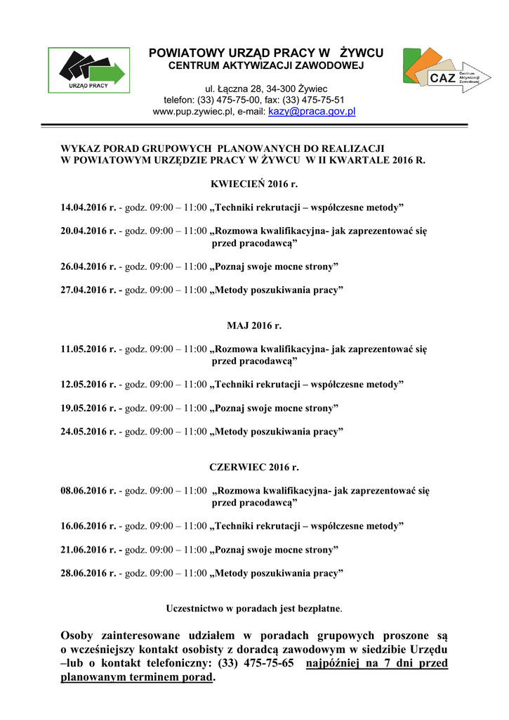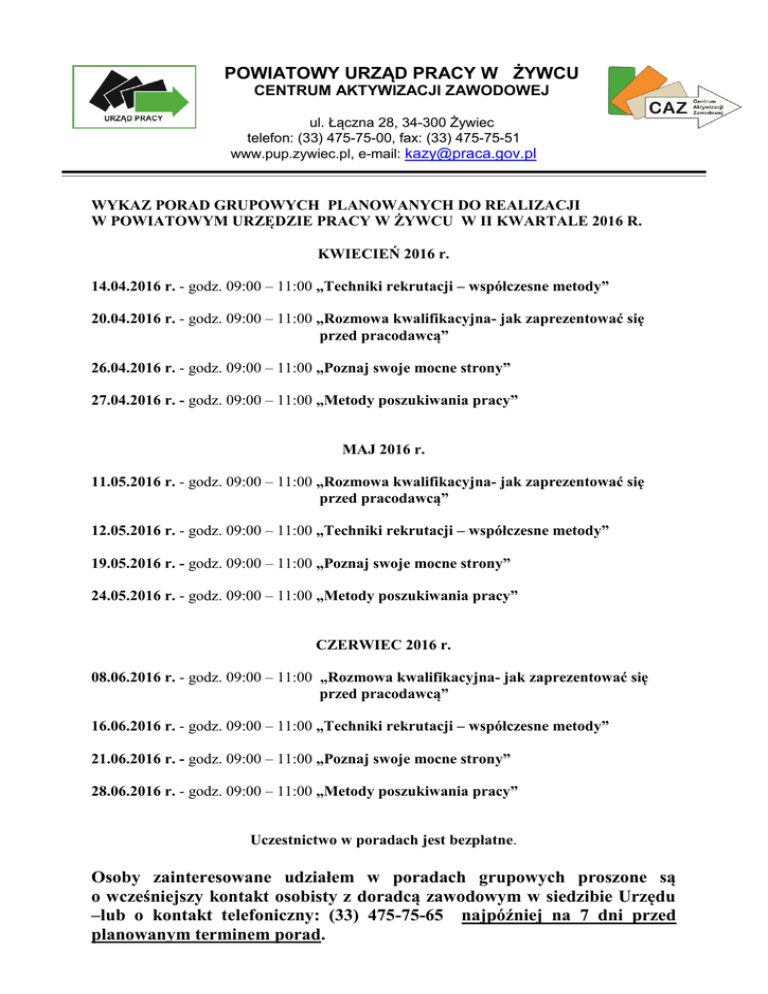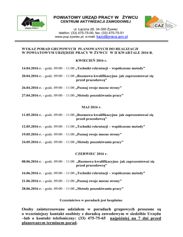 POWIATOWY URZĄD PRACY W ŻYWCU CENTRUM AKTYWIZACJI ZAWODOWEJ ul. Łączna 28, 34-300 Żywiec telefon: (33) 475-75-00, fax: (33) 475-75-51 www.pup.zywiec.pl, e-mail: [email protected] WYKAZ PORAD GRUPOWYCH PLANOWANYCH DO REALIZACJI W POWIATOWYM URZĘDZIE PRACY W ŻYWCU W II KWARTALE 2016 R. KWIECIEŃ 2016 r. 14.04.2016 r. - godz. 09:00 – 11:00 „Techniki rekrutacji – współczesne metody” 20.04.2016 r. - godz. 09:00 – 11:00 „Rozmowa kwalifikacyjna- jak zaprezentować się przed pracodawcą” 26.04.2016 r. - godz. 09:00 – 11:00 „Poznaj swoje mocne strony” 27.04.2016 r. - godz. 09:00 – 11:00 „Metody poszukiwania pracy” MAJ 2016 r. 11.05.2016 r. - godz. 09:00 – 11:00 „Rozmowa kwalifikacyjna- jak zaprezentować się przed pracodawcą” 12.05.2016 r. - godz. 09:00 – 11:00 „Techniki rekrutacji – współczesne metody” 19.05.2016 r. - godz. 09:00 – 11:00 „Poznaj swoje mocne strony” 24.05.2016 r. - godz. 09:00 – 11:00 „Metody poszukiwania pracy” CZERWIEC 2016 r. 08.06.2016 r. - godz. 09:00 – 11:00 „Rozmowa kwalifikacyjna- jak zaprezentować się przed pracodawcą” 16.06.2016 r. - godz. 09:00 – 11:00 „Techniki rekrutacji – współczesne metody” 21.06.2016 r. - godz. 09:00 – 11:00 „Poznaj swoje mocne strony” 28.06.2016 r. - godz. 09:00 – 11:00 „Metody poszukiwania pracy” Uczestnictwo w poradach jest bezpłatne. Osoby zainteresowane udziałem w poradach grupowych proszone są o wcześniejszy kontakt osobisty z doradcą zawodowym w siedzibie Urzędu –lub o kontakt telefoniczny: (33) 475-75-65 najpóźniej na 7 dni przed planowanym terminem porad.