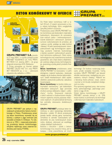 BETON KOMÓRKOWY W OFERCIE GRUPA PREFABET S.A. powstała 27 maja 2004 r. w wyniku przejęcia przez PREFABET KOZIENICE S.A. firmy PREFABET-REDA S.A. Jesienią 2004 r. do grupy dołączyła korporacja AHG Żelisławice. Z Grupą powiązane są również zakłady PREFABET DŁUGI KĄT S.A. oraz PREFABET NIEGOCIN sp. z o.o. – planowane włączenie obu zakładów w 2006 r. GRUPA PREFABET jest jednym z największych producentów betonu komórkowego w Polsce. Produkowany przez nią beton komórkowy wywodzi się ze Szwecji, a jednym z jego twórców jest szwedzki architekt A. Erikkson. To właśnie on w 1923 r. rozpoczął przemysłową produkcję betonu komórkowego, oficjalnie rejestrując nowy materiał budowlany pod nazwą YTONG. Do Polski beton komórkowy trafił w latach 50-tych. Z czasem opracowano w kraju własną technologię, która uwzględniała specyfikę polskich surowców. Produkowany przez GRUPĘ PREFABET beton komórkowy jest doskonałym materiałem budowlanym, stosowanym do wznoszenia ścian nośnych, jedno- i wielowarstwowych, ścianek działowych i osłonowych. Zarówno surowce wykorzystywane do produkcji, jak i gotowy wyrób, poddaje się stałej kontroli i atestacji. W pełni zautomatyzowane i skomputeryzowane ciągi technologiczne zapewniają uzyskanie materiału budowlanego o bardzo wysokich i jednorodnych parametrach techniczno-użytkowych. Ostre reżimy technologiczne oraz wszechstronna kontrola parametrów, tak w fazie doboru składników, jak i podczas całego procesu technologicznego, gwarantują wysoką jakość produktu finalnego. Beton komórkowy produkowany przez GRUPĘ PREFABET to nowoczesny i w pełni ekologiczny materiał budowlany, doskonale nadający się do budowy domów jednorodzinnych, osiedli mieszkaniowych, szkół, szpitali, obiektów użyteczności publicznej i zabudowy towarzyszącej. Beton komórkowy ma bardzo dobrą wytrzymałość mechaniczną i jest doskonałym materiałem izolacyjnym. Jego porowata struktura sprzyja oddawaniu wilgoci i „oddychaniu” murów. Stosowanie materiału o takich walorach w budownictwie mieszkaniowym zapewnia znaczną poprawę właściwości cieplnych i ich jednorodność termiczną bez potrzeby stosowania dodatkowych dociepleń. GRUPA PREFABET produkuje beton komórkowy w całym typoszeregu elementów (bloczków i płytek). W ofercie produkcyjnej posiada bardzo szeroką gamę rozmiarową. Umożliwia to szerokie wykorzystanie tych elementów do prac konstrukcyjnych (ściany nośne, działowe, osłonowe) we wszelkiego rodzaju obiektach budowlanych. Budowa z bloczków i płytek z betonu komórkowego trwa znacznie krócej, jest łatwiejsza i mniej pracochłonna od innych www.grupa−prefabet.pl 26 maj – czerwiec 2006 technologii. Do budowy wystarczają tradycyjne, proste narzędzia murarskie. Cechą wyrobów GRUPY PREFABET jest łatwość obróbki mechanicznej, niezbędnej przy prowadzeniu różnych instalacji. Materiał ten z łatwością można piłować, ciosać, wiercić i wycinać w nim bruzdy narzędziami dostępnymi na rynku. Przy sprawnej organizacji pracy, stan surowy domu jednorodzinnego, piętrowego powstanie w ciągu 20 dni. Wybór betonu komórkowego z GRUPY PREFABET pozwala obniżyć o ok. 20% koszty budowy w porównaniu do technologii z alternatywnych materiałów budowlanych.