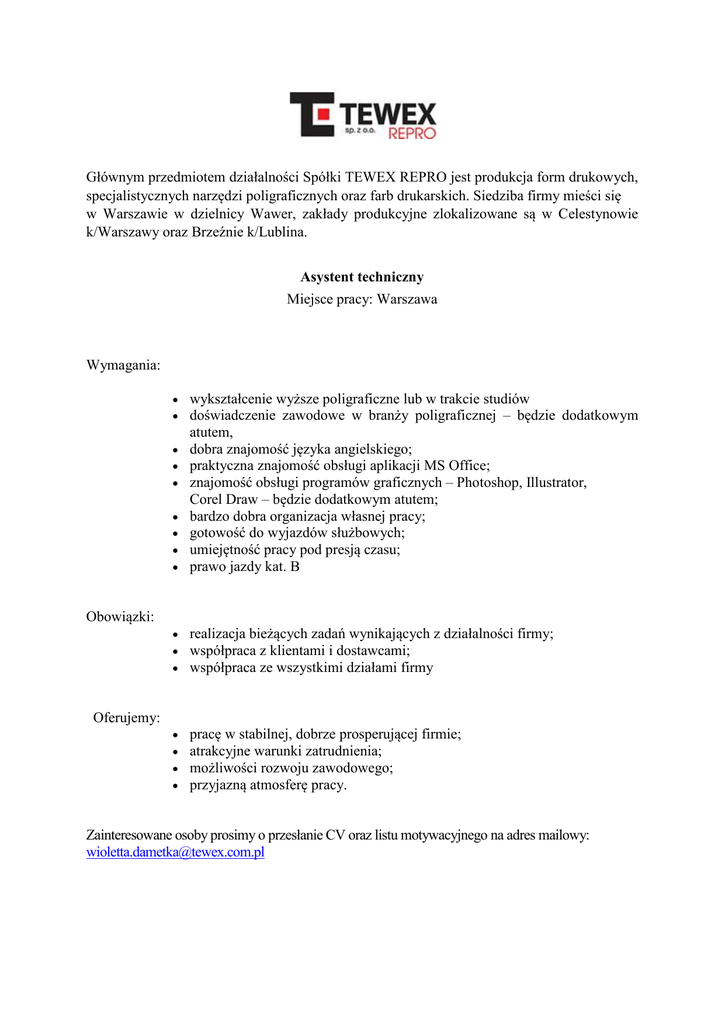 Głównym przedmiotem działalności Spółki TEWEX REPRO jest produkcja form drukowych, specjalistycznych narzędzi poligraficznych oraz farb drukarskich. Siedziba firmy mieści się w Warszawie w dzielnicy Wawer, zakłady produkcyjne zlokalizowane są w Celestynowie k/Warszawy oraz Brzeźnie k/Lublina. Asystent techniczny Miejsce pracy: Warszawa Wymagania: • • • • wykształcenie wyższe poligraficzne lub w trakcie studiów doświadczenie zawodowe w branży poligraficznej – będzie dodatkowym atutem, dobra znajomość języka angielskiego; praktyczna znajomość obsługi aplikacji MS Office; znajomość obsługi programów graficznych – Photoshop, Illustrator, Corel Draw – będzie dodatkowym atutem; bardzo dobra organizacja własnej pracy; gotowość do wyjazdów służbowych; umiejętność pracy pod presją czasu; prawo jazdy kat. B • • • realizacja bieżących zadań wynikających z działalności firmy; współpraca z klientami i dostawcami; współpraca ze wszystkimi działami firmy • • • • pracę w stabilnej, dobrze prosperującej firmie; atrakcyjne warunki zatrudnienia; możliwości rozwoju zawodowego; przyjazną atmosferę pracy. • • • • • Obowiązki: Oferujemy: Zainteresowane osoby prosimy o przesłanie CV oraz listu motywacyjnego na adres mailowy: [email protected]