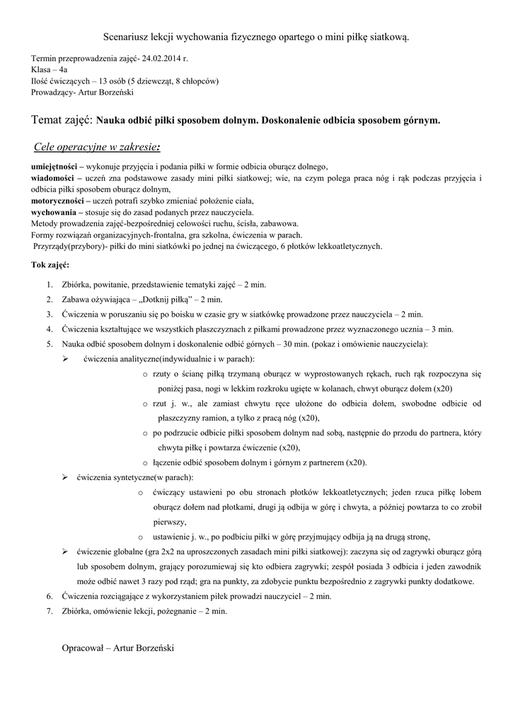 Scenariusz lekcji wychowania fizycznego opartego o mini piłkę siatkową. Termin przeprowadzenia zajęć- 24.02.2014 r. Klasa – 4a Ilość ćwiczących – 13 osób (5 dziewcząt, 8 chłopców) Prowadzący- Artur Borzeński Temat zajęć: Nauka odbić piłki sposobem dolnym. Doskonalenie odbicia sposobem górnym. Cele operacyjne w zakresie: umiejętności – wykonuje przyjęcia i podania piłki w formie odbicia oburącz dolnego, wiadomości – uczeń zna podstawowe zasady mini piłki siatkowej; wie, na czym polega praca nóg i rąk podczas przyjęcia i odbicia piłki sposobem oburącz dolnym, motoryczności – uczeń potrafi szybko zmieniać położenie ciała, wychowania – stosuje się do zasad podanych przez nauczyciela. Metody prowadzenia zajęć-bezpośredniej celowości ruchu, ścisła, zabawowa. Formy rozwiązań organizacyjnych-frontalna, gra szkolna, ćwiczenia w parach. Przyrządy(przybory)- piłki do mini siatkówki po jednej na ćwiczącego, 6 płotków lekkoatletycznych. Tok zajęć: 1. Zbiórka, powitanie, przedstawienie tematyki zajęć – 2 min. 2. Zabawa ożywiająca – „Dotknij piłką” – 2 min. 3. Ćwiczenia w poruszaniu się po boisku w czasie gry w siatkówkę prowadzone przez nauczyciela – 2 min. 4. Ćwiczenia kształtujące we wszystkich płaszczyznach z piłkami prowadzone przez wyznaczonego ucznia – 3 min. 5. Nauka odbić sposobem dolnym i doskonalenie odbić górnych – 30 min. (pokaz i omówienie nauczyciela): ćwiczenia analityczne(indywidualnie i w parach): o rzuty o ścianę piłką trzymaną oburącz w wyprostowanych rękach, ruch rąk rozpoczyna się poniżej pasa, nogi w lekkim rozkroku ugięte w kolanach, chwyt oburącz dołem (x20) o rzut j. w., ale zamiast chwytu ręce ułożone do odbicia dołem, swobodne odbicie od płaszczyzny ramion, a tylko z pracą nóg (x20), o po podrzucie odbicie piłki sposobem dolnym nad sobą, następnie do przodu do partnera, który chwyta piłkę i powtarza ćwiczenie (x20), o łączenie odbić sposobem dolnym i górnym z partnerem (x20). ćwiczenia syntetyczne(w parach): o ćwiczący ustawieni po obu stronach płotków lekkoatletycznych; jeden rzuca piłkę lobem oburącz dołem nad płotkami, drugi ją odbija w górę i chwyta, a później powtarza to co zrobił pierwszy, o ustawienie j. w., po podbiciu piłki w górę przyjmujący odbija ją na drugą stronę, ćwiczenie globalne (gra 2x2 na uproszczonych zasadach mini piłki siatkowej): zaczyna się od zagrywki oburącz górą lub sposobem dolnym, grający porozumiewaj się kto odbiera zagrywki; zespół posiada 3 odbicia i jeden zawodnik może odbić nawet 3 razy pod rząd; gra na punkty, za zdobycie punktu bezpośrednio z zagrywki punkty dodatkowe. 6. Ćwiczenia rozciągające z wykorzystaniem piłek prowadzi nauczyciel – 2 min. 7. Zbiórka, omówienie lekcji, pożegnanie – 2 min. Opracował – Artur Borzeński
