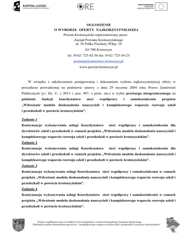 OGŁOSZENIE O WYBORZE OFERTY NAJKORZYSTNIEJSZEJ Powiat Krotoszyński Krotoszy reprezentowany przez Zarząd Powiatu Krotoszyńskiego ul. 56 Pułku Piechoty Wlkp. 10 63-700 Krotoszyn tel. /0-62/ 725-42-56 fax /0-62/ 725-34-23 [email protected] www.powiat-krotoszyn.pl W związku z zakończeniem czeniem postępowania post powania i dokonaniem wyboru najkorzystniejszej oferty w procedurze prowadzonej na podstawie ustawy z dnia 29 stycznia 2004 roku Prawo Zamówień Zamówie Publicznych (j.t. Dz. U. z 2013 r. poz. 907, z późn. pó zm.) w trybie przetargu rzetargu nieograniczonego na pełnienie ełnienie funkcji koordynatora sieci współpracy i samokształcenia projektu „WdroŜenie enie modelu doskonalenia nauczycieli i kompleksowego wsparcia rozwoju szkół i przedszkoli w powiecie krotoszyńskim”. krotoszy Zadanie 1 Kontynuacja wykonywania usługi Koordynatora sieci współpracy i samokształcenia dla dyrektorów szkół i przedszkoli w ramach projektu „WdroŜenie enie modelu doskonalenia nauczycieli i kompleksowego wsparcia rozwoju szkół i przedszkoli w powiecie krotoszyńskim”. krotoszy Zadanie 2 Kontynuacja ynuacja wykonywania usługi Koordynatora sieci współpracy i samokształcenia dla dyrektorów szkół i przedszkoli w ramach projektu „WdroŜenie enie modelu doskonalenia nauczycieli i kompleksowego wsparcia rozwoju szkół i przedszkoli w powiecie krotoszyńskim”. krotoszy Zadanie 3 Kontynuacja wykonywania usługi Koordynatora sieci współpracy i samokształcenia w ramach projektu „WdroŜenie enie modelu doskonalenia nauczycieli i kompleksowego wsparcia rozwoju szkół i przedszkoli w powiecie krotoszyńskim”. krotoszy Zadanie 4 Kontynuacja wykonywania usługi Koordynatora sieci współpracy i samokształcenia w ramach projektu „WdroŜenie enie modelu doskonalenia nauczycieli i kompleksowego wsparcia rozwoju szkół i przedszkoli w powiecie krotoszyńskim”. krotoszy Projekt współfinansowany ze środków ś Unii Europejskiej w ramach Europejskiego opejskiego Funduszu Społecznego „WdroŜenie enie modelu doskonalenia nauczycieli i kompleksowego wsparcia rozwoju szkół i przedszkoli w powiecie krotoszyńskim” krotosz Zadanie 5 Kontynuacja wykonywania usługi Koordynatora sieci współpracy i samokształcenia w ramach projektu „WdroŜenie enie modelu doskonalenia nauczycieli i kompleksowego wsparcia rozwoju szkół i przedszkoli w powiecie krotoszyńskim”. krotoszy Zadanie 6 Wykonywania usługi Koordynatora sieci współpracy i samokształcenia w ramach projektu „WdroŜenie enie modelu doskonalenia nauczycieli i kompleksowego wsparcia rozwoju szkół i przedszkoli w powiecie krotoszyńskim”. krotoszy informujemy, iŜ najkorzystniejszą najkorzystniejsz ofertę złoŜył /-a/ : Zadanie 1 Iwona Nowacka Salnia, ul. Leśna 97 63-700 Krotoszyn za cenę 1.365,00 zł (brutto) miesięcznie miesię 27.300,00 zł (brutto) za cały okres realizacji zadania Uzasadnienie wyboru: Jedyna oferta. Oferta najkorzystniejsza z punktu widzenia kryterium kryterium oceny ofert - cena 100 % Zadanie 2 Ryszard Czuszke Tomnice, ul. Łąkowa 8 63-700 Krotoszyn za cenę 1.365,00 zł (brutto) miesięcznie miesię 27.300,00 zł (brutto) za cały okres realizacji zadania Uzasadnienie wyboru: Jedyna oferta. Oferta najkorzystniejsza z punktu widzenia kryterium kryterium oceny ofert - cena 100 % Projekt współfinansowany ze środków ś Unii Europejskiej w ramach Europejskiego opejskiego Funduszu Społecznego „WdroŜenie enie modelu doskonalenia nauczycieli i kompleksowego wsparcia rozwoju szkół i przedszkoli w powiecie krotoszyńskim” krotosz Zadanie 3 Alicja Zajączkowska Ul. Łukasiewicza 3 63-700 Krotoszyn za cenę 1.365,00 zł (brutto) miesięcznie miesię 27.300,00 zł (brutto) za cały okres realizacji zadania Uzasadnienie wyboru: Jedyna oferta. Oferta najkorzystniejsza z punktu widzenia kryterium kryterium oceny ofert - cena 100 % Zadanie 4 Urszula Woźniak Ul. Chopina 7 63-700 Krotoszyn za cenę miesię 1.365,00 zł (brutto) miesięcznie 27.300,00 zł (brutto) za cały okres realizacji zadania Uzasadnienie wyboru: Jedyna oferta. Oferta najkorzystniejsza z punktu widzenia kryterium kryterium oceny ofert - cena 100 % Zadanie 5 Robert Szczotka Ul. Konstytucji 3 Maja 5/4 63-700 Krotoszyn za cenę 1.365,00 zł (brutto) miesięcznie miesię 27.300,00 zł (brutto) za cały okres realizacji zadania Uzasadnienie wyboru: kryterium oceny ofert - cena 100 % Jedyna oferta. Oferta najkorzystniejsza z punktu widzenia kryterium Projekt współfinansowany ze środków ś Unii Europejskiej w ramach Europejskiego opejskiego Funduszu Społecznego „WdroŜenie enie modelu doskonalenia nauczycieli i kompleksowego wsparcia rozwoju szkół i przedszkoli w powiecie krotoszyńskim” krotosz Zadanie 6 Mariola Kaźmierczak Ul. Sulmierzycka 16 a 63-700 Krotoszyn za cenę 1.365,00 zł (brutto) miesięcznie miesię 27.300,00 zł (brutto) za cały okres realizacji zadania Uzasadnienie wyboru: Jedyna oferta. Oferta najkorzystniejsza z punktu widzenia kryterium kryterium oceny ofert - cena 100 % Streszczenie oceny i porównania złoŜonych zło ofert: Zadanie Wykonawca Mariola Kaźmierczak Ul. Sulmierzycka 16 a 63-700 Krotoszyn - Robert Szczotka Ul. Konstytucji 3 Maja 5/4 63-700 Krotoszyn Urszula Woźniak Ul. Chopina 7 63-700 Krotoszyn Alicja Zajączkowska Ul. Łukasiewicza 3 63-700 Krotoszyn Ryszard Czuszke Tomnice Ul. Łąkowa 8 63-700 Krotoszyn Iwona Nowacka Salnia Ul. Leśna 97 63-700 Krotoszyn - Zadanie 1 Zadanie 2 Zadanie 3 Zadanie 4 Zadanie 5 Zadanie 6 Pkt. kt. Pkt. Pkt. Pkt. Pkt. Pkt. - - - - 27.300,00 100,00 - - - 27.300,00 - 100,00 - - - 27.300,00 - - 27.300,00 - - - - - - - - - - - - - 100,00 100,00 - 27.300,00 100,00 27.300,00 - 100,00 śaden Wykonawca nie podlegał wykluczeniu, Ŝadna oferta nie podlegała odrzuceniu. Jednocześnie nie informujemy, Ŝe umowa w sprawie zamówienia publicznego icznego zostanie zawarta po upływie 5 dni od dnia przesłania niniejszego zawiadomienia. SEKRE