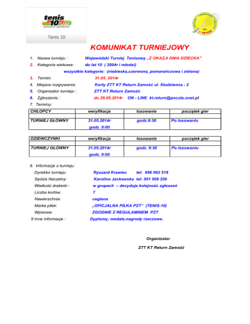 KOMUNIKAT TURNIEJOWY 1. Nazwa turnieju : Wojewódzki Turniej Tenisowy „Z OKAZJI DNIA DZIECKA” 2. Kategoria wiekowa: do lat 10 ( 2004r i młodsi) wszystkie kategorie: (niebieska,czerwona, pomarańczowa i zielona) 3. Termin: 31.05. 2014r 4. Miejsce rozgrywania: Korty ZTT KT Return Zamość ul. Studzienna - 2 5. Organizator turnieju : ZTT KT Return Zamość 6. Zgłoszenia : do 29.05.2014r ON - LINE [email protected] 7. Terminy: CHŁOPCY weryfikacja losowanie TURNIEJ GŁÓWNY 31.05.2014r godz.9:30 początek gier Po losowaniu godz. 9:00 DZIEWCZYNKI weryfikacja losowanie TURNIEJ GŁÓWNY 31.05.2014r godz. 9:30 początek gier Po losowaniu godz. 9:00 8. Informacje o turnieju: Dyrektor turnieju: Ryszard Krawiec Sędzia Naczelny: Karolina Jackowska tel: 501 508 256 Wielkość drabinki : w grupach – decyduje kolejność zgłoszeń Liczba kortów: 7 Nawierzchnia: ceglana Marka piłek: „OFICJALNA PIŁKA PZT” (TENIS-10) Wpisowe: ZGODNIE Z REGULAMINEM PZT 9 Inne informacje : tel: 696 062 518 Dyplomy, medale,nagrody rzeczowe. Organizator ZTT KT Return Zamość
