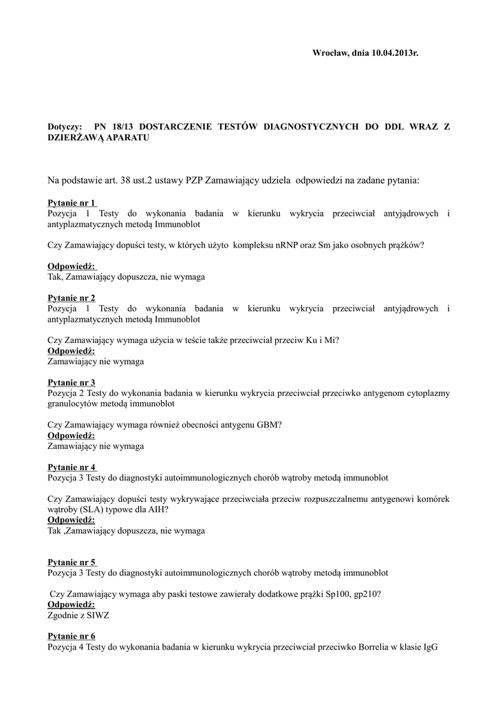 Wrocław, dnia 10.04.2013r. Dotyczy: PN 18/13 DOSTARCZENIE TESTÓW DIAGNOSTYCZNYCH DO DDL WRAZ Z DZIERŻAWĄ APARATU Na podstawie art. 38 ust.2 ustawy PZP Zamawiający udziela odpowiedzi na zadane pytania: Pytanie nr 1 Pozycja 1 Testy do wykonania badania w kierunku wykrycia przeciwciał antyjądrowych i antyplazmatycznych metodą Immunoblot Czy Zamawiający dopuści testy, w których użyto kompleksu nRNP oraz Sm jako osobnych prążków? Odpowiedź: Tak, Zamawiający dopuszcza, nie wymaga Pytanie nr 2 Pozycja 1 Testy do wykonania badania w kierunku wykrycia przeciwciał antyjądrowych i antyplazmatycznych metodą Immunoblot Czy Zamawiający wymaga użycia w teście także przeciwciał przeciw Ku i Mi? Odpowiedź: Zamawiający nie wymaga Pytanie nr 3 Pozycja 2 Testy do wykonania badania w kierunku wykrycia przeciwciał przeciwko antygenom cytoplazmy granulocytów metodą immunoblot Czy Zamawiający wymaga również obecności antygenu GBM? Odpowiedź: Zamawiający nie wymaga Pytanie nr 4 Pozycja 3 Testy do diagnostyki autoimmunologicznych chorób wątroby metodą immunoblot Czy Zamawiający dopuści testy wykrywające przeciwciała przeciw rozpuszczalnemu antygenowi komórek wątroby (SLA) typowe dla AIH? Odpowiedź: Tak ,Zamawiający dopuszcza, nie wymaga Pytanie nr 5 Pozycja 3 Testy do diagnostyki autoimmunologicznych chorób wątroby metodą immunoblot Czy Zamawiający wymaga aby paski testowe zawierały dodatkowe prążki Sp100, gp210? Odpowiedź: Zgodnie z SIWZ Pytanie nr 6 Pozycja 4 Testy do wykonania badania w kierunku wykrycia przeciwciał przeciwko Borrelia w klasie IgG metodą immunoblot Czy Zamawiający dopuści testy, umożliwiające wykrycie gatunków Borrelia: B. burgdorferi sensu stricto, B. garinii, B.garinii II, B. afzelii, B.spielmanii i zawierające antygeny: rekombinowane VlsE, p100 tożsame z p83, p58 , p41i , p39 (BmpA), p31 (OspA) , p23 (OspC), p18 (DbpA)? Odpowiedź: Tak, Zamawiający dopuszcza, nie wymaga Pytanie nr 7: Pozycja 4 Pozycja 4 Testy do wykonania badania w kierunku wykrycia przeciwciał przeciwko Borelia w klasie IgG metoda immunoblot Czy Zamawiający wymaga użycia w testach bardziej specyficznego białka p41i zamiast p41? Odpowiedź: Zgodnie z SIWZ Pytanie nr 8 Pozycja 5 Testy do wykonania badania w kierunku wykrycia przeciwciał przeciwko Borrelia w klasie IgM metodą immunoblot Czy Zamawiający dopuści testy, umożliwiające wykrycie gatunków Borrelia: B. burgdorferi sensu stricto, B. garinii, B.garinii II, B. afzelii, B.spielmanii i zawierające antygeny: rekombinowane VlsE , p100 tożsame z p83, , p58 , p41i , p39 (BmpA), p31 (OspA) , p23 (OspC), p18 (DbpA)? Odpowiedź: Tak, Zamawiający dopuszcza, nie wymaga Pytanie nr 9 Pozycja 5 Testy do wykonania badania w kierunku wykrycia przeciwciał przeciwko Borrelia w klasie IgM metodą immunoblot Czy Zamawiający wymaga użycia w testach bardziej specyficznego białka p41i zamiast p41? Odpowiedź: Zgodnie z SIWZ Pytanie nr 10 Pozycja 6-9 Czy Zamawiający zgodzi się na wydzielenie z pakietu punktów dotyczących diagnostyki alergologicznej – punkty 6-9? Odpowiedź: Zamawiajacy nie wyraża zgody Pytanie nr 11 Pozycja 10 Czy Zamawiający zgodzi się na dopuszczenie oprogramowania , w którym dla uniknięcia błędów nie ma możliwości modyfikacji wyników? Odpowiedź: Tak, Zamawiający dopuszcza, nie wymaga Pytanie nr 12 Czy Zamawiający wymaga aby wszystkie testy pochodziły od jednego producenta? Odpowiedź: Nie Pytanie nr 13 Czy Zamawiający wymaga jednakowej procedury manualnej i czasów inkubacyjnych dla testów z zakresu diagnostyki autoimmunologicznej oraz dla borrelioz? Odpowiedź: Zamawiający nie wymaga Pytanie nr 14 Czy Zamawiający wymaga , aby przy pomocy aparatu można było wykonywać testy z jednoczesnym użyciem 2 koniugatów (w opcji całkowicie zautomatyzowanej) lub 3 koniugatów (w opcji półautomatycznej)? Odpowiedź: Zgodnie z SIWZ Pytanie nr 15 Czy Zamawiający wymaga aby każdy zestaw odczynnikowy zawierał tacki inkubacyjne-min 3,oraz pęsetkę i folie do przyklejania pasków? Odpowiedź: zgodnie z SIWZ Pytanie nr 16 Czy Zamawiający wymaga możliwości wykonywania testów surowicy lub osoczu? Odpowiedź: Zgodnie z SIWZ Pytanie nr 17 Czy Zamawiający zgodzi się na wydzielenie z przetargu testów wykrywających borelioze? Odpowiedź: Nie Pytanie nr 18 Czy Zamawiający wymaga oznakowania pasków kolor-kodami w celu prowadzenia wielu oznaczeń jednocześnie, bez możliwości pomylenie pasków? Odpowiedź: Zamawiający nie wymaga Pytanie nr 19 Dotyczy pkt 10.1 SIWZ Czy Zamawiający wyrazi zgodę na wykazanie wykonania lub wykonywania co najmniej dwóch dostaw zamówień publicznych o zakresie rzeczowym i wartościowym podobnym z przedmiotem zamówienia w okresie ostatnich trzech lat przed dniem wszczęcia postępowania, a jeżeli okres działalności jest krótszy - w tym okresie, o łącznej wartości minimum 200 000,00 zł. ? Odpowiedź: Zamawiający nie wyraża zgody