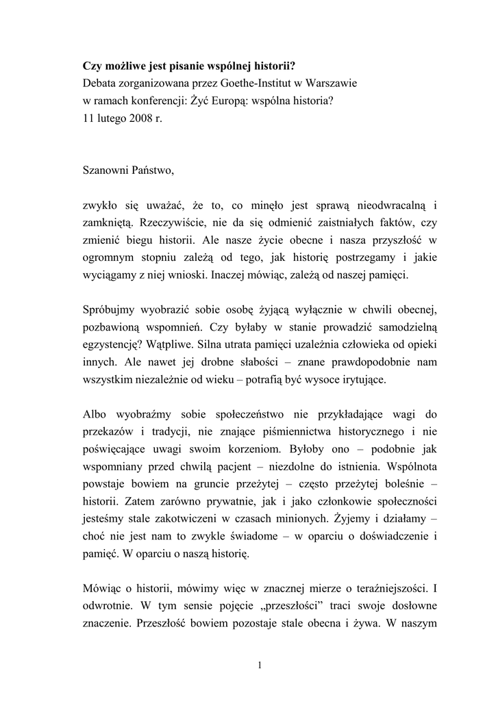 Czy moŜliwe jest pisanie wspólnej historii? Debata zorganizowana przez Goethe-Institut w Warszawie w ramach konferencji: śyć Europą: wspólna historia? 11 lutego 2008 r. Szanowni Państwo, zwykło się uwaŜać, Ŝe to, co minęło jest sprawą nieodwracalną i zamkniętą. Rzeczywiście, nie da się odmienić zaistniałych faktów, czy zmienić biegu historii. Ale nasze Ŝycie obecne i nasza przyszłość w ogromnym stopniu zaleŜą od tego, jak historię postrzegamy i jakie wyciągamy z niej wnioski. Inaczej mówiąc, zaleŜą od naszej pamięci. Spróbujmy wyobrazić sobie osobę Ŝyjącą wyłącznie w chwili obecnej, pozbawioną wspomnień. Czy byłaby w stanie prowadzić samodzielną egzystencję? Wątpliwe. Silna utrata pamięci uzaleŜnia człowieka od opieki innych. Ale nawet jej drobne słabości – znane prawdopodobnie nam wszystkim niezaleŜnie od wieku – potrafią być wysoce irytujące. Albo wyobraźmy sobie społeczeństwo nie przykładające wagi do przekazów i tradycji, nie znające piśmiennictwa historycznego i nie poświęcające uwagi swoim korzeniom. Byłoby ono – podobnie jak wspomniany przed chwilą pacjent – niezdolne do istnienia. Wspólnota powstaje bowiem na gruncie przeŜytej – często przeŜytej boleśnie – historii. Zatem zarówno prywatnie, jak i jako członkowie społeczności jesteśmy stale zakotwiczeni w czasach minionych. śyjemy i działamy – choć nie jest nam to zwykle świadome – w oparciu o doświadczenie i pamięć. W oparciu o naszą historię. Mówiąc o historii, mówimy więc w znacznej mierze o teraźniejszości. I odwrotnie. W tym sensie pojęcie „przeszłości” traci swoje dosłowne znaczenie. Przeszłość bowiem pozostaje stale obecna i Ŝywa. W naszym 1 kulturowym, duchowym i materialnym dziedzictwie,. W naszym języku i w nas samych. Od kiedy rozwój umysłowy i cywilizacyjny umoŜliwia nam przekazywanie doświadczeń, uczymy się o i z historii. Nauka ta ma jednak pewne słabości: po pierwsze, zakłada nie zawsze oczywistą wolę człowieka do wyciągania poŜytecznych wniosków z doświadczeń historycznych. Po drugie, nie uwzględnia naszej skłonności do interpretacji wydarzeń historycznych wedle własnych potrzeb i łatwości, z jaką mogą zostać postawione w słuŜbie róŜnych ideologii. Po trzeci wreszcie, jesteśmy od czasu do czasu konfrontowani z wydarzeniami bezprecedensowymi, w przypadku których niemoŜliwe jest sięgnięcie do doświadczeń minionych pokoleń. Z racji wieku naleŜę do generacji, która na własnej skórze doświadczyła wszystkich tych słabości nauki historycznej. Która w swojej młodości poznała niewyobraŜalne wcześniej oblicza ludzkiej natury, a później była świadkiem planowanego i zamierzonego manipulowania historią. Te doświadczenia nie były na szczęście dane wszystkim obecnym dzisiaj na tej sali. My wszyscy jednak jesteśmy obecnie świadkami i często aktywnymi uczestnikami procesu tworzenia nie tylko nowego rozdziału historii w zjednoczonej Europie, ale teŜ prób nowego spojrzenia na naszą wspólną historię w ogóle. Wykształcenie wspólnej europejskiej pamięci jest zadaniem bardzo trudnym. Nie jestem równieŜ przekonany, czy wyłącznie wspólna pamięć historyczna jest celowa. Z pewnością nie pamięć jednolita. Historia Europy, jako część jej wielokulturowego i wielonarodowego charakteru, pozostanie splotem róŜnych perspektyw i róŜnych wersji. Nie jest równieŜ moŜliwe, aby te same wydarzenia odgrywały analogicznie waŜną rolę w róŜnych zakątkach i dla róŜnych ludzi. WaŜne jest jednak wytworzenie pewnej europejskiej świadomości historycznej, która zawierać będzie elementy wspólne dla wszystkich – tak samo jak niezaleŜnie od przynaleŜności kulturowej czy narodowej istnieje ściśle określony zbiór wartości tworzących podstawę toŜsamości europejskiej. 2 Taki cel przyświeca próbom tworzenia podręczników ukazujących historię w kontekście ogólnoeuropejskim. Istotne jest, aby zbliŜenie postrzegania, przekazywania i rozumienia historii odbywało się zarówno poprzez akcentowanie elementów wspólnych, które nas łączą, jak i uwzględnienie istniejących róŜnic. Poprzez trenowanie rzadkiej umiejętności patrzenia oczami drugiej strony. Dlatego europejska toŜsamość historyczna nie moŜe ograniczać się wyłącznie do eksponowania wzajemnych powiązań kulturowych, okresów prosperity i jedności. Równie waŜna lub wręcz waŜniejsza jest odwaga w poruszaniu tematów określanych jako delikatne. Doświadczenia wojenne i totalitarne są trwałym elementem europejskiej historii i czynnikiem wciąŜ obciąŜającym nasze wzajemne relacje. To przede wszystkim one muszą być punktem wyjścia dla wzajemnego zrozumienia w kontekście zjednoczonej Europy. Kluczową kwestią we wspólnym tematyzowaniu historii powinna być właśnie tzw. europeizacja doświadczeń traumatycznych, to znaczy uczynienie ich przedmiotem dialogu, wymiany poglądów i perspektyw. Takim najbardziej prominentnym przykładem jest oczywiście Oświęcim miejsce, które wbrew swemu uprzedniemu przeznaczeniu słuŜy dzisiaj zbliŜaniu ludzi i budowaniu więzów w obliczu przeŜytej tragedii. WaŜne jest, aby upamiętniania historii nie traktować wyłącznie w kategorii stawiania pomników. Zgodnie ze słowami Roberta Musila nie ma bowiem niczego bardziej niewidocznego, niŜ właśnie pomnik. Miejsca pamięci polegające tylko na – skądinąd słusznym i szlachetnym – oddawaniu hołdu ofiarom, mają tę słabość, Ŝe zwykle stwarzają wraŜenie zamknięcia pewnego rozdziału historii. Zacierają związek z obecnymi problemami. Krótko mówiąc: niosą często niezauwaŜalne niebezpieczeństwo, gdyŜ zdejmują z nas poczucie odpowiedzialności. Zwykle przypisywaną pomnikom rolą jest upamiętnianie historii i niesienie przesłania polegającego na ostrzeganiu. Aby to przesłanie mogło zostać w pełni zrealizowane, koni