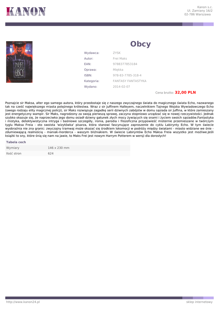 Kanon s.c. Ul. Zamiany 16/2 02-786 Warszawa Obcy Wydawca: ZYSK Autor: Frei Maks EAN: 9788377853184 Oprawa: Miękka ISBN: 978-83-7785-318-4 Kategoria: FANTASY FANTASTYKA Wydano: 2014-02-07 Cena brutto: 32,00 PLN Poznajcie sir Maksa, alter ego samego autora, który przedostaje się z naszego zwyczajnego świata do magicznego świata Echo, nazwanego tak na cześć największego miasta potężnego królestwa. Wraz z sir Juffinem Halleyem, naczelnikiem Tajnego Wojska Wywiadowczego Echo (swego rodzaju elity magicznej policji), sir Maks rozwiązuje zagadkę serii dziwnych zabójstw w domu sąsiada sir Juffina, w które zamieszany jest energetyczny wampir. Sir Maks, nagrodzony za swoją pierwszą sprawę, zaczyna stopniowo urządzać się w nowej rzeczywistości. Jednak szybko okazuje się, że naprzeciwko jego domu osiadł dziwny gatunek złych mocy żywiących się snami i życiem swoich sąsiadów.Fantastyka i mistyka, detektywistyczna intryga i baśniowe szczegóły, ironia, parodia i filozoficzna przypowieść misternie przemieszane w twórczym tyglu Maksa Freia - oto swoista 'wizytówka' pisarza, która stanowi fascynujące zaproszenie do cyklu Labirynty Echo. W tym świecie wyobraźnia nie zna granic: zwyczajny tramwaj może okazać się środkiem lokomocji w podróży między światami - miasto widziane we śnie zdumiewającą realnością - maniak-morderca - waszym bliźniakiem. W świecie Labiryntów Echo Maksa Freia wszystko jest możliwe.Jeśli książki to sny, które śnią się nam na jawie, to Maks Frei jest nowym Harrym Potterem w wersji dla dorosłych! Tabela cech Wymiary 146 x 230 mm Ilość stron 624 http://www.kanon24.pl sklep internetowy