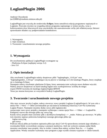 LoglanPlugin 2006 Andrzej Chwedoruk ([email protected]) LoglanPlugin jest wtyczką do srodowiska Eclipse, ktora umożliwia edycję programow napisanych w Loglanie. Pozwala rowniez na wygodną edycje programu napisanego w tymze jezyku, wraz z kolorowaniem slow kluczowych oraz zawieraloby tak zaawansowane cechy jak refaktoryzacja, biezace sprawdzanie skladni czy podpowiadanie kontekstowe. ------------------------------------------------------------------------------------------1. Wymagania. 2. Opis instalacji. 3. Tworzenie i uruchomienie nowego projektu. 1. Wymagania Do uruchomienia aplikacji LoglanPlugin wymagane są: - Platforma Eclipse (najlepiej wersja 3.2) - Java 5.0 2. Opis instalacji Aby uruchomić LoglanPlugin należy skopiowac pliki "loglanplugin_1.0.0.jar" oraz "loglanplugindoc_1.0.0.jar" (znajdujące się na plycie w katalogu src/) do katalogu Plugins, ktory znajduje sie w katalogu Eclipse. Nastepnie nalezy uruchomic platforme Eclipse, ktory automatycznie wykryje nowo dodane wtyczki. Należy jeszcze skopiować na dysk katalog loglan oraz wyeksportowac scieżkę do niego: export PATH=(sciezka do katalogu loglan)/loglan:$PATH Teraz juz mozna korzystac ze wszystkich funkcji LoglanPlugin. 3. Tworzenie i uruchomienie nowego projektu Aby moc uzywac jezyka Loglan, nalezy utworzyc nowy projekt Loglanu (LoglanProject). W tym celu z menu File -->New --> Other (ewentualnie po nacisnieciu kombinacji klawiszy Ctrl+N) wybieramy Loglan Project. Nastepnie musimy dodac nowy plik loglanowski: zaznaczajac nasz nowy projekt a nastepnie wybierajac z menu opcje New --> Other --> LoglanFile. Podajemy nazwe dla nowego pliku np: nowy.log. Kazdy nowy projekt musi zawietac plik z dyrektywa kompilacji --> _make. Nalezy go utworzyc. W pliku tym musimy napisac polecenia kompilacji naszego glownego pliku np: loglan nowy.log gen nowy Podczas edycji pliku po kazdym zapisaniu pliku (po akcji Ctrl+S) sprawdzona zostanie jego skladnia, a ewentualne bledy wyswietlone zostaną w postacji markerow. Jesli nie wykryte zostana zadne bledy mozemy uruchomic nasz projekt. Aby to zrobic z menu Run nalezy wybrac Run As.. --> Loglan Application. Wtedy zostanie wykonany nasz program a jego wyniki zostana wypisane w oknie konsoli.