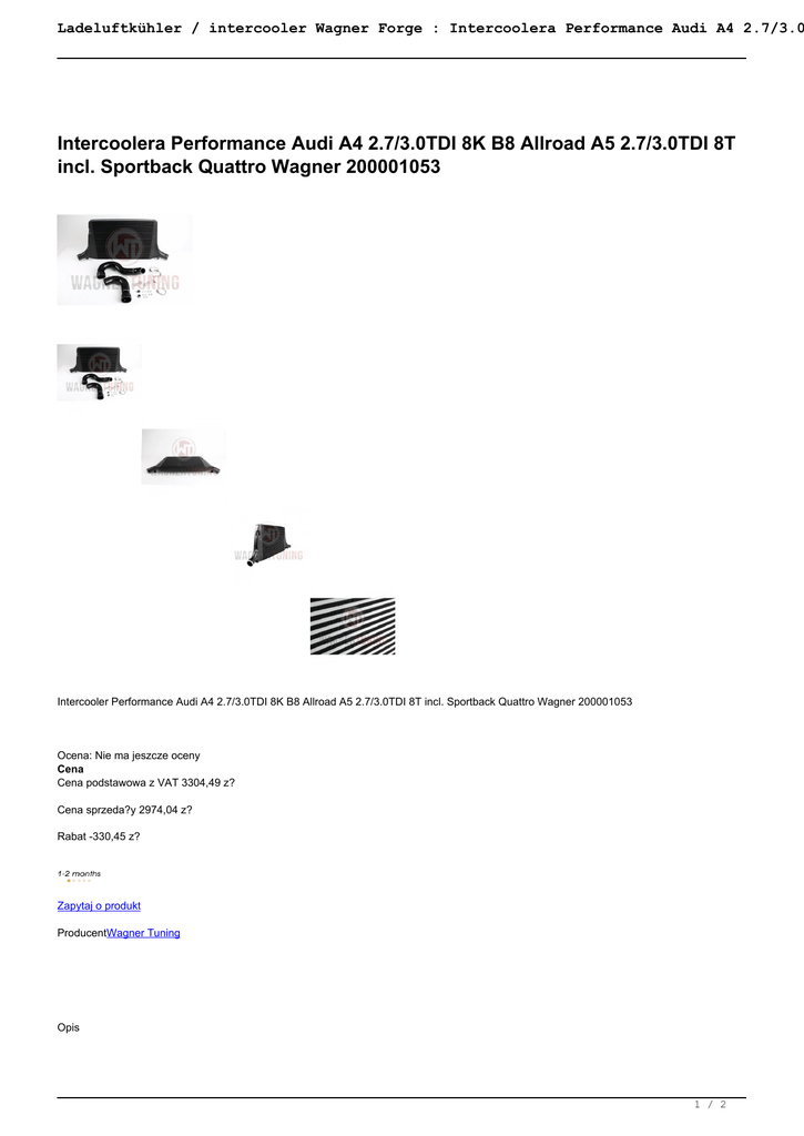 Ladeluftkühler / intercooler Wagner Forge : Intercoolera Performance Audi A4 2.7/3.0 Intercoolera Performance Audi A4 2.7/3.0TDI 8K B8 Allroad A5 2.7/3.0TDI 8T incl. Sportback Quattro Wagner 200001053 Intercooler Performance Audi A4 2.7/3.0TDI 8K B8 Allroad A5 2.7/3.0TDI 8T incl. Sportback Quattro Wagner 200001053 Ocena: Nie ma jeszcze oceny Cena Cena podstawowa z VAT 3304,49 z? Cena sprzeda?y 2974,04 z? Rabat -330,45 z? Zapytaj o produkt ProducentWagner Tuning Opis 1 / 2 Ladeluftkühler / intercooler Wagner Forge : Intercoolera Performance Audi A4 2.7/3.0 he Performance Intercooler-Kit fits to: Audi A4 B8 2,7 TDI (140KW/190PS)* Audi A4 B8 3,0 TDI (176KW/240PS)* Audi A4 B8 3,0 TDI (180KW/245PS)* Audi A4 B8 Allroad 2,7 TDI (140KW/190PS)* Audi A4 B8 Allroad 3,0 TDI (176KW/240PS)* Audi A4 B8 Allroad 3,0 TDI (180KW/245PS)* Audi A5 2,7 TDI (140KW/190PS)* Audi A5 3,0 TDI (176KW/240PS)* Audi A5 3,0 TDI (180KW/245PS)* Audi A5 Sportback 2,7 TDI (140KW/190PS)* Audi A5 Sportback 3,0 TDI (176KW/240PS)* Audi A5 Sportback 3,0 TDI (180KW/245PS)* * didn´t fit directly to vehicles with an additional cooler for the dynamic-steering. Recommendation on the implementation you will find in the installation instruction. Wagner-Tuning "Performance" Core with high cooling performance CAD designed Cast Freeform shaped Endtanks for best possible Internal Airflow more cooling surface and volume less pressure drop Anti Corrosion protective Coating with perfect thermal heat dissapating character optimal cooling with clearly more power kit is ready for installation, 100% perfectfit OEM replacement Package: 1 Charge air cooler 2 Silicone Hoses 4 hose clamps 1 mounting material 1 Installation instructions 2 / 2 Powered by TCPDF (www.tcpdf.org)