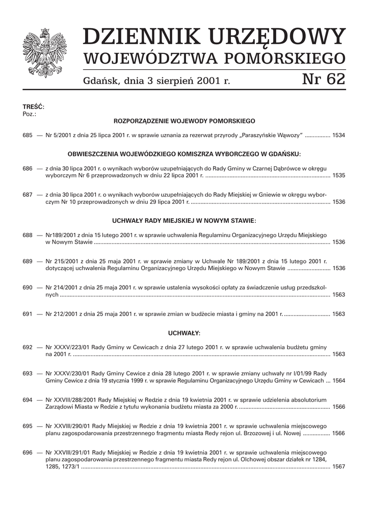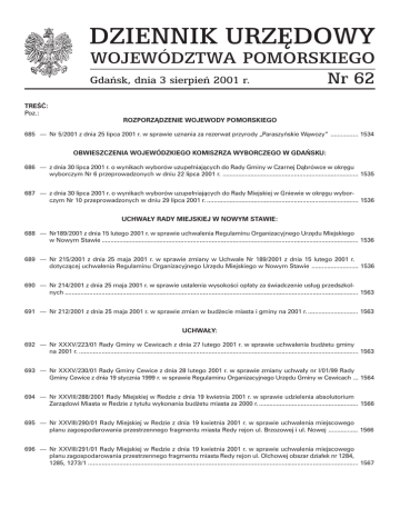 DZIENNIK URZÊDOWY WOJEWÓDZTWA POMORSKIEGO Gdañsk, dnia 3 sierpieñ 2001 r. Nr 62 TREÆ: Poz.: ROZPORZ¥DZENIE WOJEWODY POMORSKIEGO 685 Nr 5/2001 z dnia 25 lipca 2001 r. w sprawie uznania za rezerwat przyrody Paraszyñskie W¹wozy ................ 1534 OBWIESZCZENIA WOJEWÓDZKIEGO KOMISZRZA WYBORCZEGO W GDAÑSKU: 686 z dnia 30 lipca 2001 r. o wynikach wyborów uzupe³niaj¹cych do Rady Gminy w Czarnej D¹brówce w okrêgu wyborczym Nr 6 przeprowadzonych w dniu 22 lipca 2001 r. .............................................................................. 1535 687 z dnia 30 lipca 2001 r. o wynikach wyborów uzupe³niaj¹cych do Rady Miejskiej w Gniewie w okrêgu wyborczym Nr 10 przeprowadzonych w dniu 29 lipca 2001 r. ....................................................................................... 1536 UCHWA£Y RADY MIEJSKIEJ W NOWYM STAWIE: 688 Nr189/2001 z dnia 15 lutego 2001 r. w sprawie uchwalenia Regulaminu Organizacyjnego Urzêdu Miejskiego w Nowym Stawie ................................................................................................................................................... 1536 689 Nr 215/2001 z dnia 25 maja 2001 r. w sprawie zmiany w Uchwale Nr 189/2001 z dnia 15 lutego 2001 r. dotycz¹cej uchwalenia Regulaminu Organizacyjnego Urzêdu Miejskiego w Nowym Stawie ........................... 1536 690 Nr 214/2001 z dnia 25 maja 2001 r. w sprawie ustalenia wysokoci op³aty za wiadczenie us³ug przedszkolnych ........................................................................................................................................................................ 1563 691 Nr 212/2001 z dnia 25 maja 2001 r. w sprawie zmian w bud¿ecie miasta i gminy na 2001 r. ............................. 1563 UCHWA£Y: 692 Nr XXXV/223/01 Rady Gminy w Cewicach z dnia 27 lutego 2001 r. w sprawie uchwalenia bud¿etu gminy na 2001 r. ................................................................................................................................................................ 1563 693 Nr XXXV/230/01 Rady Gminy Cewice z dnia 28 lutego 2001 r. w sprawie zmiany uchwa³y nr I/01/99 Rady Gminy Cewice z dnia 19 stycznia 1999 r. w sprawie Regulaminu Organizacyjnego Urzêdu Gminy w Cewicach ... 1564 694 Nr XXVIII/288/2001 Rady Miejskiej w Redzie z dnia 19 kwietnia 2001 r. w sprawie udzielenia absolutorium Zarz¹dowi Miasta w Redzie z tytu³u wykonania bud¿etu miasta za 2000 r. ......................................................... 1566 695 Nr XXVIII/290/01 Rady Miejskiej w Redzie z dnia 19 kwietnia 2001 r. w sprawie uchwalenia miejscowego planu zagospodarowania przestrzennego fragmentu miasta Redy rejon ul. Brzozowej i ul. Nowej ................. 1566 696 Nr XXVIII/291/01 Rady Miejskiej w Redzie z dnia 19 kwietnia 2001 r. w sprawie uchwalenia miejscowego planu zagospodarowania przestrzennego fragmentu miasta Redy rejon ul. Olchowej obszar dzia³ek nr 1284, 1285, 1273/1 ........................................................................................................................................................... 1567 Dziennik Urzêdowy Województwa Pomorskiego 1534 Poz. 685 697 Nr XXVII/411/01 Rady Miejskiej w Kartuzach z dnia 24 kwietnia 2001 r. w sprawie uchwalenia miejscowego planu zagospodarowania przestrzennego czêci dzia³ek nr 29/2 i 25/1 po³o¿onych w Kartuzach przy ul. Chmieleñskiej .................................................................................................................................................... 1568 POROZUMIENIE 698 Nr 27 z dnia 11 maja 2001 r. Ministra Kultury i Dziedzictwa Narodowego z Urzêdem Miejskim w Gdañsku w sprawie dotacji celowej na zadanie z zakresu administracji rz¹dowej objête mecenatem pañstwa w dziedzinie kultury .......................................................................................................................................................... 1569 UCHWA£Y: 699 Nr 252/XXXII/2001 Rady Gminy Gniewino z dnia 26 czerwca 2001 r. w sprawie op³at za sk³adowanie odpadów na wysypisku odpadów komunalnych, dla obszaru gminy Gniewino ........................................................ 1571 700 Nr 294/XXXV/01 Rady Miasta Malborka z dnia 20 lipca 2001 r. w sprawie utworzenia na terenie miasta Malborka zamkniêtych obwodów g³osowania w wyborach do Sejmu Rzeczypospolitej Polskiej i do Senatu Rzeczypospolitej Polskiej ....................................................................................................................................... 1571 DECYZJE PREZESA URZÊDU REGULACJI ENERGETYKI: 701 Nr OGD-820/325-A/7/2001/II/S.A. z dnia 16 lipca 2001 r. w sprawie zatwierdzenia taryfy dla ciep³a dla Wodoci¹gowo-Ciep³owniczej Sp zoo COWIK z siedzib¹ w Bartoszycach ................................................................. 1571 702 Nr OGD-820/9107-A/10/IA/2001/AP z dnia 23 lipca 2001 r. w sprawie zatwierdzenia w czêci taryfy dla ciep³a dla Gigaterm Inwestment Sp zoo z siedzib¹ w Gdyni .......................................................................................... 1575 INFORMACJE PREZESA URZÊDU REGULACJI ENERGETYKI: 703 Nr WCC/436B/729/W/3/2001/ASA z dnia 9 lipca 2001 r. w sprawie cofniêcia koncesji na wytwarzanie ciep³a przez Cukrowniê PELPLIN S.A z siedzib¹ w Pelplinie ........................................................................................ 1583 704 Nr WCC/22C/337/W/3/2001/MJ oraz PCC/23C/337/W/3/2001/MJ z dnia 16 lipca 2001 r. w sprawie zmiany decyzji udzielenia koncesji na wytwarzanie oraz przesy³anie i dystrybucjê ciep³a dla Miejskiego Zak³adu Energetyki Cieplnej Sp z o.o. z siedzib¹ w Chojnicach .......................................................................... .............. 1583 705 Nr OGD-9/2001 z dnia 18 czerwca 2001 w sprawie zawarcia umowy sprzeda¿y ciep³a pomiêdzy GKH Sp. z o.o. z siedzib¹ w Gdañsku a WAM Oddzia³ Terenowy w Gdañsku ............................................