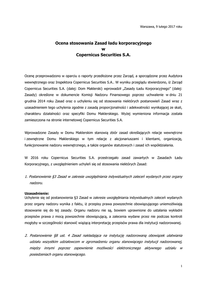 Warszawa, 9 lutego 2017 roku Ocena stosowania Zasad ładu korporacyjnego w Copernicus Securities S.A. Ocenę przeprowadzono w oparciu o raporty przedłożone przez Zarząd, a sporządzone przez Audytora wewnętrznego oraz Inspektora Copernicus Securities S.A.. W wyniku przeglądu stwierdzono, iż Zarząd Copernicus Securities S.A. (dalej: Dom Maklerski) wprowadził „Zasady Ładu Korporacyjnego” (dalej: Zasady) określone w dokumencie Komisji Nadzoru Finansowego poprzez uchwalenie w dniu 21 grudnia 2014 roku Zasad oraz o uchyleniu się od stosowania niektórych postanowień Zasad wraz z uzasadnieniem tego uchylenia zgodnie z zasadą proporcjonalności i adekwatności wynikającej ze skali, charakteru działalności oraz specyfiki Domu Maklerskiego. Wyżej wymieniona informacja została zamieszczona na stronie internetowej Copernicus Securities S.A. Wprowadzone Zasady w Domu Maklerskim stanowią zbiór zasad określających relacje wewnętrzne i zewnętrzne Domu Maklerskiego w tym relacje z akcjonariuszami i klientami, organizację, funkcjonowanie nadzoru wewnętrznego, a także organów statutowych i zasad ich współdziałania. W 2016 roku Copernicus Securities S.A. przestrzegało zasad zawartych w Zasadach Ładu Korporacyjnego, z uwzględnieniem uchyleń się od stosowania niektórych Zasad: 1. Postanowienie §3 Zasad w zakresie uwzględniania indywidualnych zaleceń wydanych przez organy nadzoru. Uzasadnienie: Uchylenie się od postanowienia §3 Zasad w zakresie uwzględniania indywidualnych zaleceń wydanych przez organy nadzoru wynika z faktu, iż przepisy prawa powszechnie obowiązującego uniemożliwiają stosowanie się do tej zasady. Organu nadzoru nie są, bowiem uprawnione do ustalania wykładni przepisów prawa z mocą powszechnie obowiązującą, a zalecenia wydane przez nie podczas kontroli mogłyby w szczególności stanowić wiążącą interpretację przepisów prawa dla instytucji nadzorowanej. 2. Postanowienie §8 ust. 4 Zasad nakładająca na instytucję nadzorowaną obowiązek ułatwiania udziału wszystkim udziałowcom w zgromadzeniu organu stanowiącego instytucji nadzorowanej, między innymi poprzez zapewnienie możliwości elektronicznego aktywnego udziału w posiedzeniach organu stanowiącego. 1 Uzasadnienie: Uchylenie się od postanowienia §8 ust. 4 Zasad wynika z faktu, iż dla Copernicus Securities S.A. byłoby to nadmiernie uciążliwe, gdyż skutkowałoby koniecznością nabycia i utrzymania infrastruktury technicznej umożliwiających elektroniczny udział w posiedzeniach Walnego Zgromadzenia Akcjonariuszy, podczas gdy w posiedzeniach Walnego Zgromadzenia Akcjonariuszy bierze udział zazwyczaj kilku głównych akcjonariuszy, często reprezentowanych przez pełnomocników. Do wyjątków należą sytuacje, gdy w posiedzeniach Walnego Zgromadzenia Akcjonariuszy biorą udział akcjonariusze mniejszościowi, posiadający swe miejsce zamieszkania lub siedzibę w innej miejscowości niż siedziba Copernicus Securities S.A. Należy również zauważyć, iż wydanym przez Komisję Nadzoru Finansowego dokumencie „Pytania i odpowiedzi do Zasad Ładu Korporacyjnego dla instytucji nadzorowanych” w odniesieniu do postanowienia §8 ust. 4 Zasad stwierdzono, iż „Przede wszystkim oczekuje się, że spółki publiczne mające rozproszony akcjonariat wprowadzą tą zasadę”. Odnosząc się do takich oczekiwań Komisji Nadzoru Finansowego należy zauważyć, iż Copernicus Securities S.A. nie jest spółką publiczną, a poza tym, nie istnieje w prawie polskim definicja pojęcia „rozproszony akcjonariat”. 3. Postanowienie §9 ust. 6 Zasad wprowadzające postulat niezwłocznego rozwiązywania powstających konfliktów między udziałowcami. Uzasadnienie: Uchylenie się od postanowienia §9 ust. 6 Zasad jest spowodowane tym, iż brak jest przepisów prawa, które dawałyby skuteczne instrumenty powodujące, że Copernicus Securities S.A. mógłby stosować wyżej wymienioną zasadę. Wskazać również należy na uciążliwość stosowania przedmiotowej z uwagi na fakt, iż Copernicus Securities S.A. jako spółka notowana na rynku NewConnect ma wielu udziałowców (nie jest w stanie chociażby posiadać wiedzy o takich konfliktach). 4. Postanowienie §10 ust. 4 Zasad zakazujące udziałowcom wykorzystywania swojej pozycji do podejmowania decyzji prowadzących do przeniesienia aktywów z instytucji nadzorowanej do innych podmiotów, a także do nabycia lub zbycia albo zawierania innych transakcji powodujących rozporządzenie przez instytucję nadzorowaną jej majątkiem na warunkach innych niż rynkowe, czy też z narażeniem bezpieczeństwa lub interesu instytucji nadzorowanej. Uzasadnienie: Jako przyczynę uchylenie się od postanowienia §10 ust. 4 Zasad należy podać brak posiadania przez Copernicus Securities S.A. instrumentów prawnych, które umożliwiłaby stosowania tego przepisu. Brak jest również podstawy prawnej, która zakazywałaby akcjonariuszom dokonywania powyżej opisanych czynności. 5. Postanowienie §12 ust. 1 Zasad nakładające na udziałowców obowiązek dokapitalizowania instytucji nadzorowanej w sytuacji, gdy jest to niezbędne do utrzymania kapitałów własnych instytucji 2 nadzorowanej na poziomie wymaganym przez przepisy prawa lub regulacje nadzorcze, a także, gdy wymaga tego bezpieczeństwo instytucji nadzorowanej. Uzasadnienie: Przepisy prawa, w szczególności ustawy z dnia 15 września 2000 roku Kodeksu Spółek Handlowych (dalej: Ksh), nie wymieniają, wśród obowiązków akcjonariuszy, takiego właśnie obowiązku. Należy zauważyć, iż obowiązki akcjonariuszy muszą być nałożone jedynie poprzez ustawę, bądź, stosownie do art. 301 §4 Ksh, statut spółki akcyjnej. Zmiany statutu natomiast wymaga kwalifikowanej większości ¾ głosów na Walnym Zgromadzeniu Akcjonariuszy (art. 415 §1 Ksh) i zgody wszystkich akcjonariuszy, których dotyczy zmiana statutu, zwiększająca świadczenia akcjonariuszy (art. 415 §4