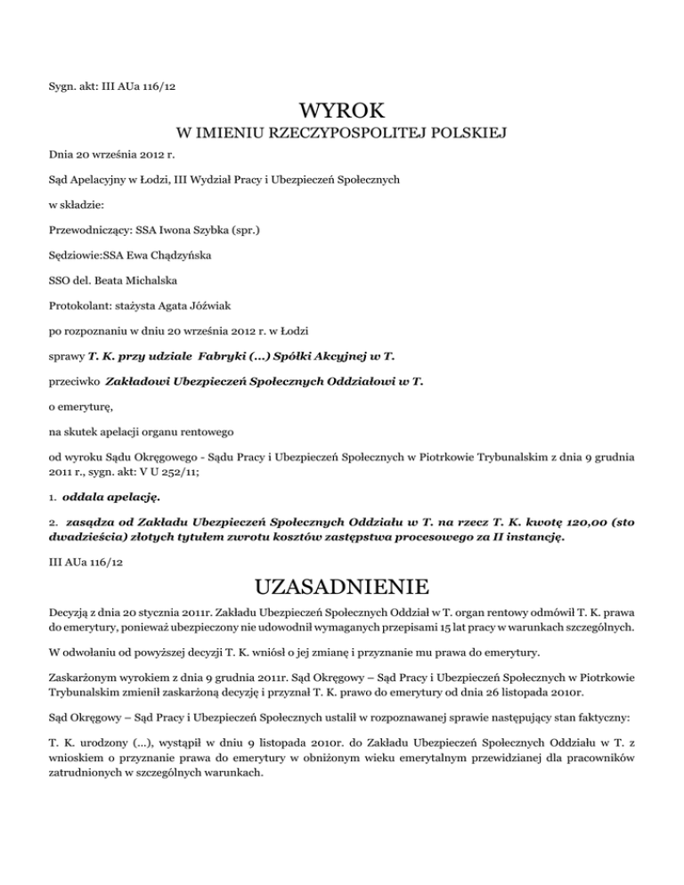 Sygn. akt: III AUa 116/12 WYROK W IMIENIU RZECZYPOSPOLITEJ POLSKIEJ Dnia 20 września 2012 r. Sąd Apelacyjny w Łodzi, III Wydział Pracy i Ubezpieczeń Społecznych w składzie: Przewodniczący: SSA Iwona Szybka (spr.) Sędziowie:SSA Ewa Chądzyńska SSO del. Beata Michalska Protokolant: stażysta Agata Jóźwiak po rozpoznaniu w dniu 20 września 2012 r. w Łodzi sprawy T. K. przy udziale Fabryki (...) Spółki Akcyjnej w T. przeciwko Zakładowi Ubezpieczeń Społecznych Oddziałowi w T. o emeryturę, na skutek apelacji organu rentowego od wyroku Sądu Okręgowego - Sądu Pracy i Ubezpieczeń Społecznych w Piotrkowie Trybunalskim z dnia 9 grudnia 2011 r., sygn. akt: V U 252/11; 1. oddala apelację. 2. zasądza od Zakładu Ubezpieczeń Społecznych Oddziału w T. na rzecz T. K. kwotę 120,00 (sto dwadzieścia) złotych tytułem zwrotu kosztów zastępstwa procesowego za II instancję. III AUa 116/12 UZASADNIENIE Decyzją z dnia 20 stycznia 2011r. Zakładu Ubezpieczeń Społecznych Oddział w T. organ rentowy odmówił T. K. prawa do emerytury, ponieważ ubezpieczony nie udowodnił wymaganych przepisami 15 lat pracy w warunkach szczególnych. W odwołaniu od powyższej decyzji T. K. wniósł o jej zmianę i przyznanie mu prawa do emerytury. Zaskarżonym wyrokiem z dnia 9 grudnia 2011r. Sąd Okręgowy – Sąd Pracy i Ubezpieczeń Społecznych w Piotrkowie Trybunalskim zmienił zaskarżoną decyzję i przyznał T. K. prawo do emerytury od dnia 26 listopada 2010r. Sąd Okręgowy – Sąd Pracy i Ubezpieczeń Społecznych ustalił w rozpoznawanej sprawie następujący stan faktyczny: T. K. urodzony (...), wystąpił w dniu 9 listopada 2010r. do Zakładu Ubezpieczeń Społecznych Oddziału w T. z wnioskiem o przyznanie prawa do emerytury w obniżonym wieku emerytalnym przewidzianej dla pracowników zatrudnionych w szczególnych warunkach. Wnioskodawca legitymuje się na dzień 1 stycznia 1999 roku okresem ubezpieczenia w rozmiarze 30 lat, 4 miesięcy i 11 dni, nie jest członkiem otwartego funduszu emerytalnego i nie pracuje. Organ rentowy uwzględnił wnioskodawcy na 15 lat pracy wykonywanej w szczególnych warunkach 13 lat, 4 miesiące i 16 dni zatrudnienia, to jest: od 1 lutego 1969r. do 23 kwietnia 1970r. i od 5 maja 1972r. do 31 lipca 1978r. w Zakładach (...) Spółce Akcyjnej w T. na stanowisku ślusarza, elektromontera – mechanika samochodowego oraz od 3 lutego 1993r. do 31 grudnia 1998r. w Fabryce (...) ”W.” Spółce Akcyjnej w T.. Do stażu pracy w warunkach szczególnych ZUS nie zaliczył wnioskodawcy okresu zatrudnienia w Fabryce (...) Spółce Akcyjnej w T. od 1 sierpnia 1978 r. do 31 sierpnia 1985r. na stanowisku kierownika magazynu części zamiennych. Ponadto organ rentowy nie zaliczył wnioskodawcy jako pracy w warunkach szczególnych okresu odbywania zasadniczej służby wojskowej od 24 kwietnia 1970r. do 12 kwietnia 1972r. W okresie od 1 sierpnia 1978r. do 31 sierpnia 1985r. T. K. był zatrudniony w Fabryce (...) Spółce Akcyjnej w T.. Po rozwiązaniu stosunku pracy wnioskodawcy wydano w dniu 20 listopada 2000 roku świadectwo pracy, z adnotacją, iż w okresie zatrudnienia zajmował stanowisko kierownika magazynu części zamiennych w pełnym wymiarze czasu pracy. W dniu 18 czerwca 2010r. zostało wydane wnioskodawcy przez Fabrykę (...) w T. świadectwo wykonywania pracy w szczególnych warunkach, w którym podano, że T. K. był zatrudniony od 1 sierpnia 1978r. do 31 sierpnia 1985r. i w tym okresie stale i w pełnym wymiarze czasu pracy wykonywał pracę polegającą na dozorze międzyoperacyjnym, kontroli jakości w produkcji i usług oraz dozorze inżynieryjno – technicznym na działach i wydziałach, w których jako podstawowe wykonywane są prace wymienione w wykazie A dział XIV, poz. 24 stanowiącym załącznik nr 1 do rozporządzenia Rady Ministrów z 7 lutego 1983r. ( Dz. U. Nr 8, poz. 43 ze zm. ) oraz wykazu stanowiącego załącznik nr 1 do zarządzenia Ministra Przemysłu Chemicznego i Lekkiego Nr 7 z 7 lipca 1987r. w sprawie prac wykonywanych w szczególnych warunkach lub w szczególnym charakterze w zakładach przemysłu chemicznego i lekkiego. W okresie od 1 sierpnia 1978r. do 31 sierpnia 1985r. wnioskodawca pracował w powyższym zakładzie na stanowisku kierownika magazynu części zamiennych, inwestycyjnych i paliw stałych. W zakresie swoich obowiązków podlegał bezpośrednio kierownikowi działu zaopatrzenia. Magazyn wnioskodawcy zaopatrywał wydziały produkcyjne – farbiarnię, przędzalnię i wykańczalnię w maszyny, części zamienne, smary, paliwa. W magazynie znajdowały się urządzenia i maszyny służące do produkcji dywanów ( zespoły zgrzeblarskie, przędzarki, przewijarki ) części do tych maszyn oraz składowane w odrębnym budynku – paliwo w postaci etyliny, oleju napędowego, benzyny ekstrakcyjnej, rozpuszczalników, smarów. Wnioskodawca sprawował pieczę nad całym magazynem. Przyjmował do magazynu i wydawał z niego powierzone mu materiały. Jeżeli zakład zamawiał większe części do maszyn albo całe maszyny to bezpośrednio przyjmowane były one na hali produkcyjnej. Przy tych czynnościach musiał być obecny wnioskodawca jako kierownik magazynu, aby przyjąć towar, tzn. sprawdzić pod względem ilościowym, jakościowym, zgodnie ze sporządzoną specyfikacją. Tak było też w latach 1975-1978, kiedy to trwał montaż maszyn przędzalniczych na tworzonej przędzalni. Wnioskodawca zajmował się również wydawaniem części do maszyn, zamawianych wcześniej przez kierowników poszczególnych wydziałów. Zajmował się on ponadto przyjmowaniem i wydawaniem paliwa. Wnioskodawca pracował na równi z podległymi mu magazynierami. W okresie od 24 kwietnia 1970 roku do 12 kwietnia 1972 roku T. K. odbywał służbę wojskową. Od dnia 1 lutego 1969r. do 31 lipca 1978r. wnioskodawca pracował w Zakładach (...) Spółce Akcyjnej w T. na stanowisku ślusarza, konserwatora maszyn i urządzeń oraz mechanika nap