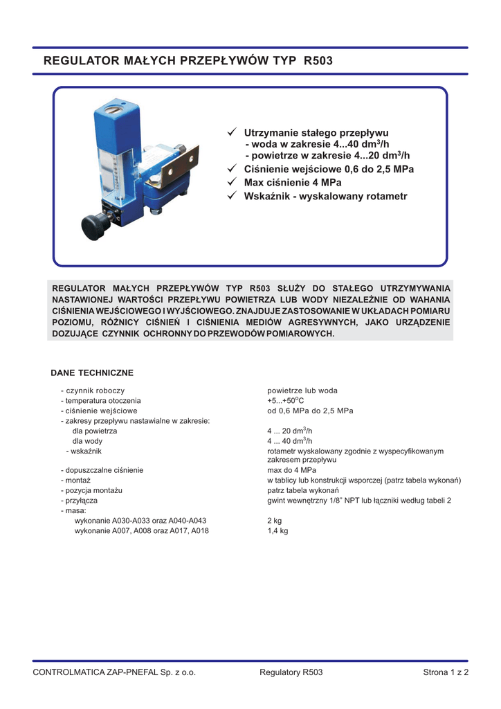 REGULATOR MAŁYCH PRZEPŁYWÓW TYP R503 [ [ [ [ Utrzymanie stałego przepływu - woda w zakresie 4...40 dm3/h - powietrze w zakresie 4...20 dm3/h Ciśnienie wejściowe 0,6 do 2,5 MPa Max ciśnienie 4 MPa Wskaźnik - wyskalowany rotametr REGULATOR MAŁYCH PRZEPŁYWÓW TYP R503 SŁUŻY DO STAŁEGO UTRZYMYWANIA NASTAWIONEJ WARTOŚCI PRZEPŁYWU POWIETRZA LUB WODY NIEZALEŻNIE OD WAHANIA CIŚNIENIA WEJŚCIOWEGO I WYJŚCIOWEGO. ZNAJDUJE ZASTOSOWANIE W UKŁADACH POMIARU POZIOMU, RÓŻNICY CIŚNIEŃ I CIŚNIENIA MEDIÓW AGRESYWNYCH, JAKO URZĄDZENIE DOZUJĄCE CZYNNIK OCHRONNY DO PRZEWODÓW POMIAROWYCH. DANE TECHNICZNE - czynnik roboczy - temperatura otoczenia - ciśnienie wejściowe - zakresy przepływu nastawialne w zakresie: dla powietrza dla wody - wskaźnik - dopuszczalne ciśnienie - montaż - pozycja montażu - przyłącza - masa: wykonanie A030-A033 oraz A040-A043 wykonanie A007, A008 oraz A017, A018 CONTROLMATICA ZAP-PNEFAL Sp. z o.o. powietrze lub woda +5...+50oC od 0,6 MPa do 2,5 MPa 4 ... 20 dm3/h 4 ... 40 dm3/h rotametr wyskalowany zgodnie z wyspecyfikowanym zakresem przepływu max do 4 MPa w tablicy lub konstrukcji wsporczej (patrz tabela wykonań) patrz tabela wykonań gwint wewnętrzny 1/8” NPT lub łączniki według tabeli 2 2 kg 1,4 kg Regulatory R503 Strona 1 z 2 RYSUNKI GABARYTOWE ZASADA DZIAŁANIA Działanie regulatora oparte jest na zasadzie równowagi między sprężyną wywierającą określoną siłę na membranę, a różnicą ciśnień po obu stronach membrany. Utrzymywany jest w ten sposób w stanie równowagi stały spadek ciśnienia na zaworze dławiącym, a tym samym przepływ, którego wartość zależy od stopnia otwarcia zaworu dławiącego. Tabela nr 1 Rodzaj wykonania Ciśnienie wejściowe Czynnik roboczy 2,5 MPa 0,6 MPa Powietrze A030 A031 A040 A041 A007 A008 A032 A033 A042 A043 A017 A018 x x x - Woda x x x Sposób zabudowy Zastosowanie naścienna, pionowa tablicowa, pionowa wskazywanie i regulacja przepływu dowolna regulacja przepływu Tabela nr 2 Rodzaj łącznika Do rurek f 6mm metalowej Oznaczenie R903 SPOSÓB ZAMAWIANIA W zamówieniu prosimy określić: nazwę i typ wyrobu, numer wykonania oraz wymagania specjalne. Przykład zamówienia: Regulator małych przepływów z regulatorem dla pomiaru przepływu powietrza o ciśnieniu wejściowym do 2 MPa, wskazywanie i regulacja przepływu, zabudowa naścienna, przyłącza dla rurki metalowej f 6mm: Regulator małych przepływów typ R503 - A030 / R903 Zastrzega się prawo wprowadzania zmian konstrukcyjnych wyrobu bez pogorszenia parametrów użytkowych. CONTROLMATICA ZAP-PNEFAL Sp. z o.o. Regulatory R503 Strona 2 z 2 Marzec 2011
