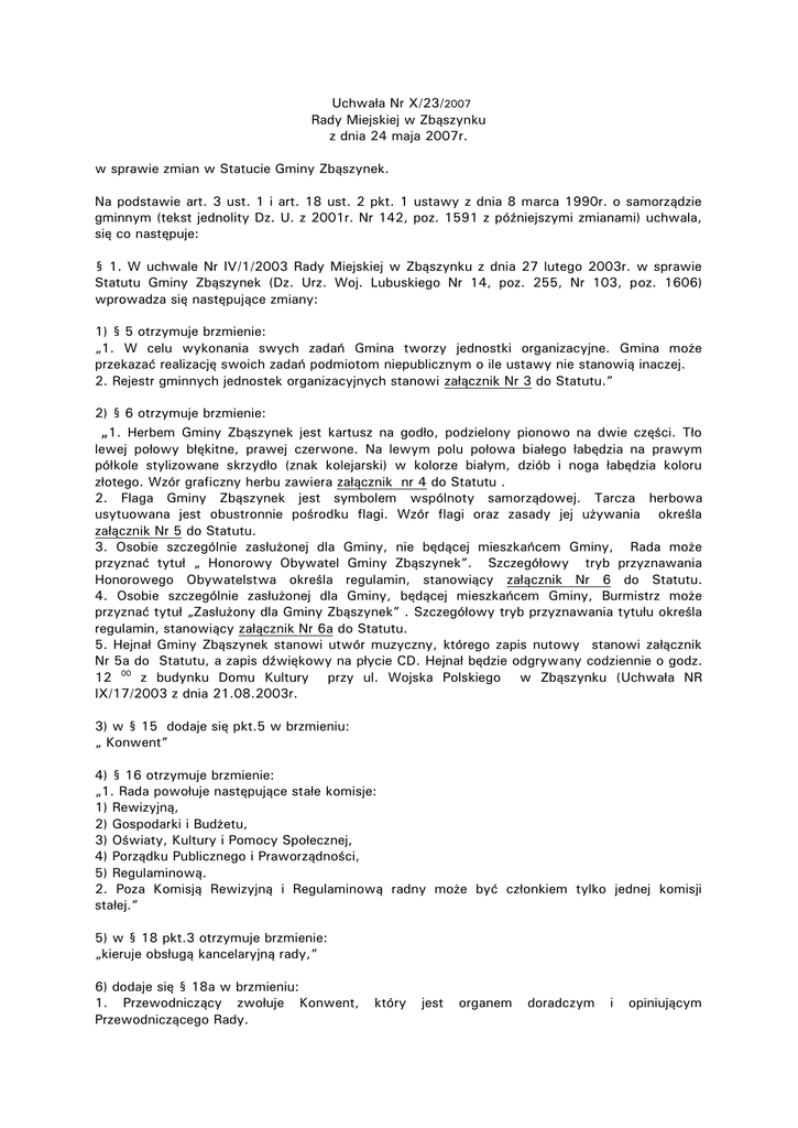 Uchwała Nr X/23/2007 Rady Miejskiej w Zbąszynku z dnia 24 maja 2007r. w sprawie zmian w Statucie Gminy Zbąszynek. Na podstawie art. 3 ust. 1 i art. 18 ust. 2 pkt. 1 ustawy z dnia 8 marca 1990r. o samorządzie gminnym (tekst jednolity Dz. U. z 2001r. Nr 142, poz. 1591 z późniejszymi zmianami) uchwala, się co następuje: § 1. W uchwale Nr IV/1/2003 Rady Miejskiej w Zbąszynku z dnia 27 lutego 2003r. w sprawie Statutu Gminy Zbąszynek (Dz. Urz. Woj. Lubuskiego Nr 14, poz. 255, Nr 103, poz. 1606) wprowadza się następujące zmiany: 1) § 5 otrzymuje brzmienie: „1. W celu wykonania swych zadań Gmina tworzy jednostki organizacyjne. Gmina może przekazać realizację swoich zadań podmiotom niepublicznym o ile ustawy nie stanowią inaczej. 2. Rejestr gminnych jednostek organizacyjnych stanowi załącznik Nr 3 do Statutu.” 2) § 6 otrzymuje brzmienie: „1. Herbem Gminy Zbąszynek jest kartusz na godło, podzielony pionowo na dwie części. Tło lewej połowy błękitne, prawej czerwone. Na lewym polu połowa białego łabędzia na prawym półkole stylizowane skrzydło (znak kolejarski) w kolorze białym, dziób i noga łabędzia koloru złotego. Wzór graficzny herbu zawiera załącznik nr 4 do Statutu . 2. Flaga Gminy Zbąszynek jest symbolem wspólnoty samorządowej. Tarcza herbowa usytuowana jest obustronnie pośrodku flagi. Wzór flagi oraz zasady jej używania określa załącznik Nr 5 do Statutu. 3. Osobie szczególnie zasłużonej dla Gminy, nie będącej mieszkańcem Gminy, Rada może przyznać tytuł „ Honorowy Obywatel Gminy Zbąszynek”. Szczegółowy tryb przyznawania Honorowego Obywatelstwa określa regulamin, stanowiący załącznik Nr 6 do Statutu. 4. Osobie szczególnie zasłużonej dla Gminy, będącej mieszkańcem Gminy, Burmistrz może przyznać tytuł „Zasłużony dla Gminy Zbąszynek” . Szczegółowy tryb przyznawania tytułu określa regulamin, stanowiący załącznik Nr 6a do Statutu. 5. Hejnał Gminy Zbąszynek stanowi utwór muzyczny, którego zapis nutowy stanowi załącznik Nr 5a do Statutu, a zapis dźwiękowy na płycie CD. Hejnał będzie odgrywany codziennie o godz. 12 00 z budynku Domu Kultury przy ul. Wojska Polskiego w Zbąszynku (Uchwała NR IX/17/2003 z dnia 21.08.2003r. 3) w § 15 dodaje się pkt.5 w brzmieniu: „ Konwent” 4) § 16 otrzymuje brzmienie: „1. Rada powołuje następujące stałe komisje: 1) Rewizyjną, 2) Gospodarki i Budżetu, 3) Oświaty, Kultury i Pomocy Społecznej, 4) Porządku Publicznego i Praworządności, 5) Regulaminową. 2. Poza Komisją Rewizyjną i Regulaminową radny może być członkiem tylko jednej komisji stałej.” 5) w § 18 pkt.3 otrzymuje brzmienie: „kieruje obsługą kancelaryjną rady,” 6) dodaje się § 18a w brzmieniu: 1. Przewodniczący zwołuje Konwent, Przewodniczącego Rady. który jest organem doradczym i opiniującym 2. W skład Konwentu wchodzą: Przewodniczący, Wiceprzewodniczący Rady, Przewodniczący lub pod jego nieobecność Wiceprzewodniczący komisji rady, Przewodniczący lub pod jego nieobecność przedstawiciel klubu radnych i inne osoby zaproszone. 3. Do zadań Konwentu należy w szczególności: 1) przygotowanie wstępnych propozycji porządku obrad, 2) opracowywanie kierunków, programów i planów pracy Rady, 3) zapewnienie przepływu informacji wewnątrz Rady, 4) opiniowanie spraw zgłoszonych przez Przewodniczącego i członków Konwentu, 5) inne sprawy związane z działalnością Rady. 4. Zasady pracy Konwentu określa Przewodniczący na pierwszym posiedzeniu. 5. Ze spotkań Konwentu pracownik biura rady sporządza protokół.” 7) § 28 ust. 2 otrzymuje brzmienie: „ W sesjach rady uczestniczą – z głosem doradczym – Burmistrz, Zastępca Burmistrza, oraz Sekretarz i Skarbnik Gminy.” 8) § 52 ust. 2 otrzymuje brzmienie: „Protokół z sesji powinien w szczególności zawierać: 1) numer, datę i miejsce odbywania sesji, godzinę jej rozpoczęcia i zakończenia oraz wskazywać numery uchwał, imię i nazwisko przewodniczącego obrad, protokolanta, 2) stwierdzenie prawomocności posiedzenia, 3) imiona i nazwiska nieobecnych członków Rady z ewentualnym podaniem przyczyny nieobecności, 4) odnotowanie przyjęcia protokołu z poprzedniej sesji, 5) ustalony porządek obrad, 6) przebieg obrad, a w szczególności treść wystąpień albo ich streszczenie, teksty zgłoszonych, jak również uchwalonych, wniosków, a nadto odnotowanie faktów zgłoszenia pisemnych wystąpień, 7) przebieg głosowania z wyszczególnieniem liczby głosów : „za”, „przeciw” i „wstrzymujących się” oraz głosów nieważnych, 8) w sytuacji głosowania imiennego, listę radnych z podpisem głosowania „za”, „ przeciw” i „wstrzymujących się”, 9) wskazanie wniesienia przez radnego zdania odrębnego do treści uchwały, 10) podpis przewodniczącego obrad, sekretarza obrad i osoby sporządzającej protokół.” 9) dodaje się § 63a w brzmieniu: „1. Głosowanie imienne przeprowadza się w przypadkach określonych w ustawie. W pozostałych głosowanie imienne przeprowadza się na wniosek radnego. 2. Głosowanie imienne odbywa się w sposób następujący: Przewodniczący Rady odczytuje kolejno nazwiska radnych z listy obecności, a każdy z wyczytanych radnych wypowiada słowo: „za” lub „przeciw” albo „wstrzymuję się” i składa podpis przy swoim nazwisku na odpowiednio przygotowanej liście imiennej. 3. Liczenie głosów należy do sekretarza obrad. 4. Wynik głosowania jawnego imiennego ogłasza Przewodniczący i nakazuje odnotowanie wyników głosowania w protokole sesji.” 10) § 72 otrzymuje brzmienie: „Pracami komisji kieruje Przewodniczący komisji lub Wiceprzewodniczący wybrany przez Radę.” 11) w § 77 ust. 2 otrzymuje brzmienie: „Przewodniczący Rady lub Wiceprzewodniczący oraz stosownie do potrzeb radny, sprawuje dwa razy w miesiącu dyżur w urzędzie miejskim. Informację o dyżurze podaje się do publicznej wiadomości w spos