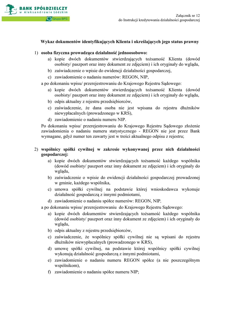 Załącznik nr 12 do Instrukcji kredytowania działalności gospodarczej Wykaz dokumentów identyfikujących Klienta i określających jego status prawny 1) osoba fizyczna prowadząca działalność jednoosobowo: a) kopie dwóch dokumentów stwierdzających tożsamość Klienta (dowód osobisty/ paszport oraz inny dokument ze zdjęciem) i ich oryginały do wglądu, b) zaświadczenie o wpisie do ewidencji działalności gospodarczej, c) zawiadomienie o nadaniu numerów: REGON, NIP, a po dokonaniu wpisu/ przerejestrowaniu do Krajowego Rejestru Sądowego: a) kopie dwóch dokumentów stwierdzających tożsamość Klienta (dowód osobisty/ paszport oraz inny dokument ze zdjęciem) i ich oryginały do wglądu, b) odpis aktualny z rejestru przedsiębiorców, c) zaświadczenie, że dana osoba nie jest wpisana do rejestru dłużników niewypłacalnych (prowadzonego w KRS), d) zawiadomienie o nadaniu numeru NIP. Po dokonaniu wpisu/ przerejestrowaniu do Krajowego Rejestru Sądowego złożenie zawiadomienia o nadaniu numeru statystycznego - REGON nie jest przez Bank wymagane, gdyż numer ten zawarty jest w treści aktualnego odpisu z rejestru; 2) wspólnicy spółki cywilnej w zakresie wykonywanej przez nich działalności gospodarczej: a) kopie dwóch dokumentów stwierdzających tożsamość każdego wspólnika (dowód osobisty/ paszport oraz inny dokument ze zdjęciem) i ich oryginały do wglądu, b) zaświadczenie o wpisie do ewidencji działalności gospodarczej prowadzonej w gminie, każdego wspólnika, c) umowa spółki cywilnej na podstawie której wnioskodawca wykonuje działalność gospodarczą z innymi podmiotami, d) zawiadomienie o nadaniu spółce numerów: REGON, NIP, a po dokonaniu wpisu/ przerejestrowaniu do Krajowego Rejestru Sądowego: a) kopie dwóch dokumentów stwierdzających tożsamość każdego wspólnika (dowód osobisty/ paszport oraz inny dokument ze zdjęciem) i ich oryginały do wglądu, b) odpis aktualny z rejestru przedsiębiorców, c) zaświadczenie, że wspólnicy spółki cywilnej nie są wpisani do rejestru dłużników niewypłacalnych (prowadzonego w KRS), d) umowę spółki cywilnej, na podstawie której wspólnicy spółki cywilnej wykonują działalność gospodarczą z innymi podmiotami, e) zawiadomienie o nadaniu numeru REGON spółce (a nie poszczególnym wspólnikom), f) zawiadomienie o nadaniu spółce numeru NIP; 3) spółka jawna, komandytowa, komandytowo-akcyjna: a) - umowa spółki w przypadku spółki jawnej, - umowa spółki w formie aktu notarialnego w przypadku spółki komandytowej, - statut w formie aktu notarialnego w przypadku spółki komandytowo-akcyjnej, b) aktualny wyciąg z rejestru handlowego, c) zawiadomienie o nadaniu numerów: REGON, NIP, a po dokonaniu wpisu/ przerejestrowaniu do Krajowego Rejestru Sądowego: a) umowa spółki w przypadku spółki jawnej, - umowa spółki w formie aktu notarialnego w przypadku spółki komandytowej, - statut w formie aktu notarialnego w przypadku spółki komandytowoakcyjnej, b) odpis aktualny z rejestru przedsiębiorców, c) zaświadczenie, że dany podmiot nie jest wpisany do rejestru dłużników niewypłacalnych (prowadzonego w KRS), d) zawiadomienie o nadaniu NIP; 4) spółka partnerska: a) umowa spółki w formie aktu notarialnego, b) postanowienie o wpisie do rejestru przedsiębiorców, c) odpis aktualny z rejestru przedsiębiorców, d) zaświadczenie, że dany podmiot nie jest wpisany do rejestru dłużników niewypłacalnych (prowadzonego w KRS), e) zawiadomienie o nadaniu numerów: REGON, NIP; 5) spółka z ograniczoną odpowiedzialnością w organizacji: a) umowa spółki lub akt założycielski (przy spółkach jednoosobowych) w formie aktu notarialnego, b) potwierdzenie złożenia wniosku o wpis do rejestru przedsiębiorców, c) uchwała o powołaniu zarządu, bądź powołaniu pełnomocnika (w jednoosobowych spółkach z ograniczona odpowiedzialnością w organizacji jedyny wspólnik nie ma prawa reprezentowania spółki); 6) spółka z ograniczoną odpowiedzialnością: a) umowa spółki lub akt założycielski (przy spółkach jednoosobowych) w formie aktu notarialnego, b) postanowienie o wpisie do rejestru handlowego, c) aktualny wyciąg z rejestru handlowego, d) zawiadomienie o nadaniu numerów: REGON, NIP, a po dokonaniu wpisu/ przerejestrowaniu do Krajowego Rejestru Sądowego: a) umowa spółki lub akt założycielski (przy spółkach jednoosobowych) w formie aktu notarialnego, b) odpis aktualny z rejestru przedsiębiorców, 2 c) zaświadczenie, że dany podmiot nie jest wpisany do rejestru dłużników niewypłacalnych (prowadzonego w KRS), d) zawiadomienie o nadaniu numeru NIP; 7) spółka akcyjna w organizacji: a) statut w formie aktu notarialnego, b) potwierdzenie złożenia wniosku o wpis do rejestru przedsiębiorców, c) uchwała o powołaniu zarządu bądź powołaniu pełnomocnika chyba, że spółka jest reprezentowana przez wszystkich założycieli działających łącznie; 8) spółka akcyjna: a) statut w formie aktu notarialnego, b) aktualny wyciąg z rejestru handlowego, c) zawiadomienie o nadaniu numerów: REGON, NIP, a po dokonaniu wpisu/ przerejestrowaniu do Krajowego Rejestru Sądowego: a) statut w formie aktu notarialnego, b) odpis aktualny z rejestru przedsiębiorców, c) zaświadczenie, że dany podmiot nie jest wpisany do rejestru dłużników niewypłacalnych (prowadzonego w KRS), d) zawiadomienie o nadaniu numeru NIP; 9) spółdzielnia: a) statut w formie aktu notarialnego, b) aktualny odpis z rejestru sądowego spółdzielni, c) uchwała walnego zgromadzenia/ zebrania przedstawicieli spółdzielni o maksymalnej sumie zobowiązań, d) zawiadomienie o nadaniu numerów: REGON, NIP, a po dokonaniu wpisu/ przerejestrowaniu do Krajowego Rejestru Sądowego: a) statut w formie aktu notarialnego, b) odpis aktualny z rejestru przedsiębiorców, c) zaświadczenie, że dany podmiot nie jest wpisany do rejestru dłużników niewypłacalnych (prowadzonego w KRS), d) uc