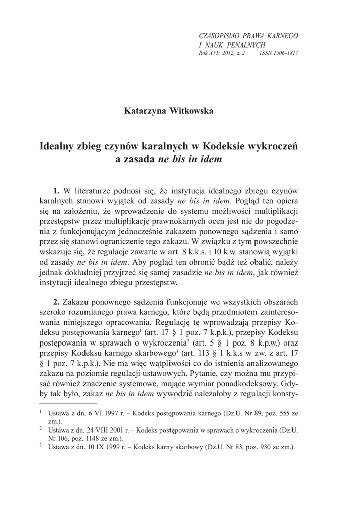 czasopismo Prawa karnego i nauk penalnych Rok XVI: 2012, z. 2 ISSN 1506-1817 Katarzyna Witkowska Idealny zbieg czynów karalnych w Kodeksie wykroczeń a zasada ne bis in idem 1. W literaturze podnosi się, że instytucja idealnego zbiegu czynów karalnych stanowi wyjątek od zasady ne bis in idem. Pogląd ten opiera się na założeniu, że wprowadzenie do systemu możliwości multiplikacji przestępstw przez multiplikację prawnokarnych ocen jest nie do pogodzenia z funkcjonującym jednocześnie zakazem ponownego sądzenia i samo przez się stanowi ograniczenie tego zakazu. W związku z tym powszechnie wskazuje się, że regulacje zawarte w art. 8 k.k.s. i 10 k.w. stanowią wyjątki od zasady ne bis in idem. Aby pogląd ten obronić bądź też obalić, należy jednak dokładniej przyjrzeć się samej zasadzie ne bis in idem, jak również instytucji idealnego zbiegu przestępstw. 2. Zakazu ponownego sądzenia funkcjonuje we wszystkich obszarach szeroko rozumianego prawa karnego, które będą przedmiotem zainteresowania niniejszego opracowania. Regulację tę wprowadzają przepisy Kodeksu postępowania karnego1 (art. 17 § 1 poz. 7 k.p.k.), przepisy Kodeksu postępowania w sprawach o wykroczenia2 (art. 5 § 1 poz. 8 k.p.w.) oraz przepisy Kodeksu karnego skarbowego3 (art. 113 § 1 k.k.s w zw. z art. 17 § 1 poz. 7 k.p.k.). Nie ma więc wątpliwości co do istnienia analizowanego zakazu na poziomie regulacji ustawowych. Pytanie, czy można mu przypisać również znaczenie systemowe, mające wymiar ponadkodeksowy. Gdyby tak było, zakaz ne bis in idem wywodzić należałoby z regulacji konsty1 Ustawa z dn. 6 VI 1997 r. – Kodeks postępowania karnego (Dz.U. Nr 89, poz. 555 ze zm.). 2 Ustawa z dn. 24 VIII 2001 r. – Kodeks postępowania w sprawach o wykroczenia (Dz.U. Nr 106, poz. 1148 ze zm.). 3 Ustawa z dn. 10 IX 1999 r. – Kodeks karny skarbowy (Dz.U. Nr 83, poz. 930 ze zm.). 110 Katarzyna Witkowska tucyjnej, względnie z odpowiednich umów międzynarodowych mających pierwszeństwo nad ustawą krajową. W polskiej ustawie zasadniczej jednak, w przeciwieństwie do konstytucji niemieckiej czy amerykańskiej4, nie ma przepisu wyrażającego wprost zasadę ne bis in idem. Ażeby więc zasadnie mówić o konstytucyjnym umocowaniu zakazu ponownego sądzenia, należy podjąć próbę wyprowadzenia go z innych regulacji Konstytucji5. W orzecznictwie Trybunału Konstytucyjnego (TK) zwrócono uwagę, że jako fundamentalna zasada prawa karnego zasada ne bis in idem jest elementem zasady państwa prawnego6. Składa się ona również na prawo do sądu ujęte w art. 45 ust. 1 Konstytucji7 czy też prawo do obrony wyrażone w art. 42 ust. 2 Konstytucji8. Z tych trzech norm wywodzone jest konstytucyjne umocowanie dla zasady ne bis in idem9. Pozostaje natomiast kwestią dyskusyjną, czy zasada ne bis in idem ma swoje podstawy w art. 30 Konstytucji. Trybunał Konstytucyjny w orzeczeniach z 5 marca 2003 r. i 20 marca 2006 r.10 podkreślił, że łączenie każdego prawa i wolności z naruszeniem godności człowieka nadmiernie upraszczałoby sens gwarancji z art. 30 4 Zob. art. 103 niemieckiej konstytucji i Piąta Poprawkę do konstytucji Stanów Zjednoczonych. 5 Rozważania na temat rozumienia konstytucyjnej zasady ne bis in idem zawarłam w tekście zatytułowanym Interpretacja konstytucyjnych praw i wolności w świetle unormowań międzynarodowych na przykładzie zasady ne bis in idem, w: Konstytucja RP a stosunki międzynarodowe, red. E. Grzęda, Ł, Zbyszyński, Kraków 2011, s. 109 i n. Z uwagi na konieczność zachowania klarowności wywodu prezentowanego w niniejszym artykule, zostały one w znacznym stopniu powtórzone. 6 Zob. wyrok TK z 3 XI 2004 r. (K 18/03, OTK-A ZU 2004, nr 10, poz. 103; LEX 133746). Zob. także wyroki TK z 29 IV 1998 r. (K 17/97, OTK ZU 1998, nr 3, poz. 30; LEX 32905) oraz z 4 IX 2007 r. (P 43/06, OTK-A ZU 2007, nr 8, poz. 95; LEX 316027). 7 Zob. wyrok TK z 15 IV 2008 r. (P 26/06, OTK-A ZU 2008, nr 3, poz. 42; LEX 364447). 8 W piśmiennictwie podkreśla się bowiem, że w przypadku ponownego postępowania oskarżony nie mógłby bronić się używając wcześniej przytoczonych argumentów, przez co realność obrony zostałaby zminimalizowana, a w najbardziej skrajnych przypadkach niemalże zupełnie wyłączona. Zwraca się uwagę również na aspekt formalny prawa do obrony. Z posiadaniem profesjonalnego pełnomocnika wiążą się często niemałe wydatki. Gdyby nie zakaz ponownego sądzenia, niejednokroć osoba uniewinniona w poprzednim procesie nie byłaby w stanie po raz kolejny ponieść kosztów ustanowienia obrońcy z wyboru, wskutek czego prawo do obrony znów doznałoby uszczerbku (zob. A. S a k o w i c z, Zasada ne bis in idem w prawie karnym w ujęciu paneuropejskim, Białystok 2011, s. 39 i n.). 9 Pogląd ten jest dość powszechnie prezentowany zarówno w literaturze, jak i w orzecznictwie TK (ibid., s. 57 i n. oraz przytaczane tam orzecznictwo i literatura). 10 Zob. wyroki TK z 5 III 2003 r. (K 7/01, OTK-A ZU 2003, nr 3, poz. 19; LEX 76816) oraz z 20 III 2006 r. (K 17/05, OTK-A ZU 2006, nr 3, poz. 30; LEX 182494). Idealny zbieg czynów karalnych w Kodeksie wykroczeń a zasada ne bis in idem 111 Konstytucji, pozbawiając ją tym samym samodzielnego pola zastosowania. Pojęcie godności „obejmuje […] bowiem najważniejsze wartości, które nie korzystają z innych, samodzielnych gwarancji na gruncie konstytucyjnym, a które dotykają istoty pozycji jednostki w społeczeństwie, jej relacji do innych osób oraz do władzy publicznej”. Skoro jednak żaden przepis ustawy zasadniczej nie zawiera regulacji dotyczącej zakazu ne bis in idem, a jego aksjologiczne umocowanie niewątpliwie daje się odnaleźć w godności ludzkiej, można wskazać na pewne powiązania zakazu z art. 30 Konstytucji niezależnie od tego, że stanowi ona element innych konstytucyjnych praw: zasady państwa prawnego (art. 2 Konstytucji), prawa do obrony (art. 42 ust. 2 Konstytu