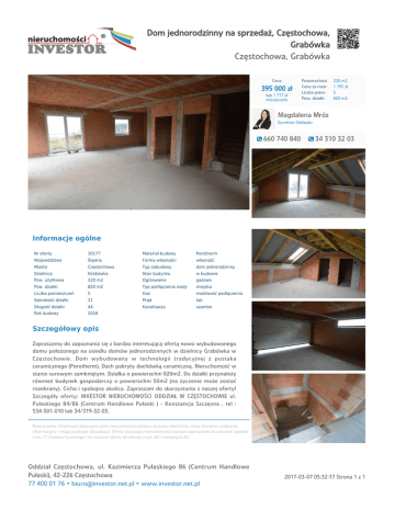 Dom jednorodzinny na sprzedaż, Częstochowa, Grabówka Częstochowa, Grabówka Cena 395 000 zł lub 1 717 zł miesięcznie Powierzchnia Cena za metr Liczba pokoi Pow. działki 220 m2 1 795 zł 5 820 m2 Magdalena Mróz Dyrektor Oddziału 660 740 840 34 310 32 03 Informacje ogólne Nr oferty 30177 Materiał budowy Porotherm Województwo Śląskie Forma własności własność Miasto Częstochowa Typ zabudowy dom jednorodzinny Dzielnica Grabówka Stan budynku w budowie Pow. użytkowa 220 m2 Ogrzewanie gazowe Pow. działki 820 m2 Typ podłączenia wody miejska Liczba pomieszczeń 5 Gaz możliwość podłączenia Szerokość działki 21 Prąd tak Długość działki 44 Kanalizacja szambo Rok budowy 2016 Szczegółowy opis Zapraszamy do zapoznania się z bardzo interesującą ofertą nowo wybudowanego domu położonego na osiedlu domów jednorodzinnych w dzielnicy Grabówka w Częstochowie. Dom wybudowany w technologii tradycyjnej z pustaka ceramicznego (Porotherm). Dach pokryty dachówką ceramiczną. Nieruchomość w stanie surowym zamkniętym. Działka o powierzchni 820m2. Do działki przynależy również budynek gospodarczy o powierzchni 50m2 (na życzenie może zostać rozebrany). Cicha i spokojna okolica. Zapraszam do skorzystania z naszej oferty! Szczegóły oferty: INVESTOR NIERUCHOMOŚCI ODDZIAŁ W CZĘSTOCHOWIE ul. Pułaskiego 84/86 (Centrum Handlowe Pułaski ) - Konstancja Szczęsna , tel : 534-501-010 lub 34/319-32-03. Nota prawna: Informacje dotyczące opisu nieruchomości podane są przez właściciela, mają charakter wyłącznie informacyjny i mogą podlegać aktualizacji. Oferta dotycząca nieruchomości stanowi zaproszenie do rokowań zgodnie z art. 71 Kodeksu Cywilnego i nie stanowi oferty określonej w art. 66 i następnych KC. Oddział Częstochowa, ul. Kazimierza Pułaskiego 86 (Centrum Handlowe Pułaski), 42-226 Częstochowa 77 400 01 76 • [email protected] • www.investor.net.pl 2017-03-07 05:32:17 Strona 1 z 1