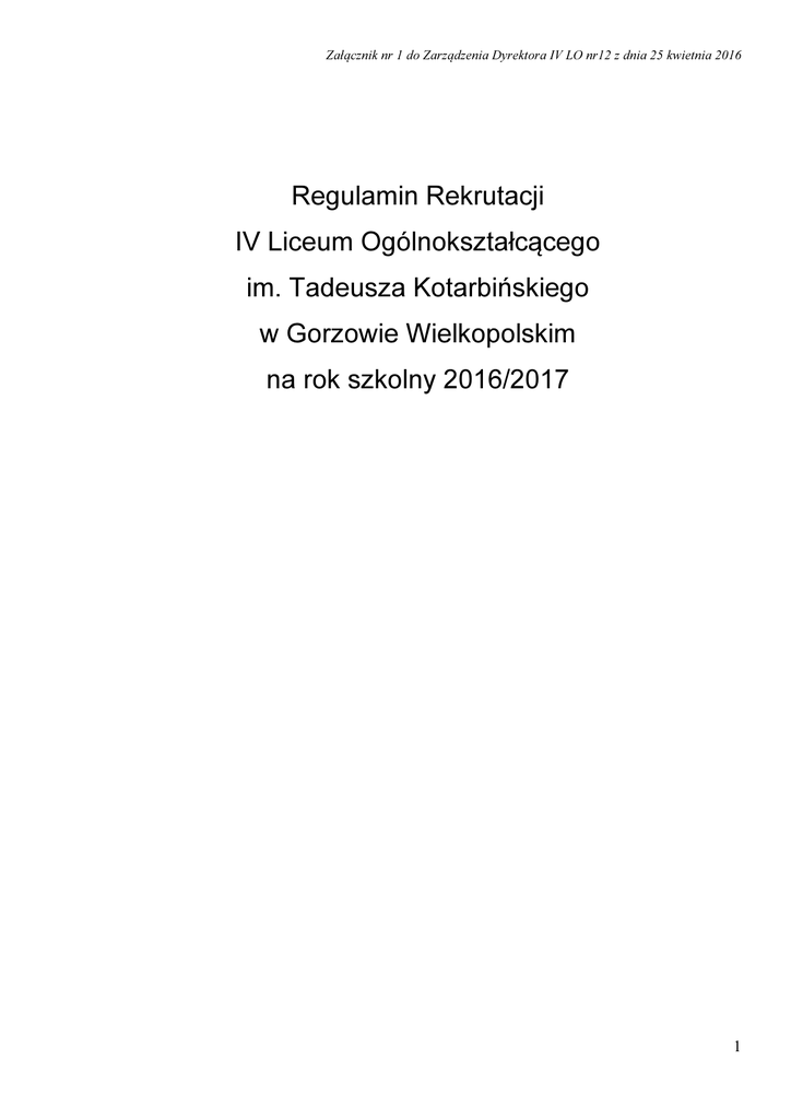 Załącznik nr 1 do Zarządzenia Dyrektora IV LO nr12 z dnia 25 kwietnia 2016 Regulamin Rekrutacji IV Liceum Ogólnokształcącego im. Tadeusza Kotarbińskiego w Gorzowie Wielkopolskim na rok szkolny 2016/2017 1 Ogólne zasady rekrutacji w roku szkolnym 2016/2017 § 1. Podstawa prawna: 1. Ustawa o systemie oświaty z dnia 07 września 1991r. (Dz.U.z 2015r. poz.21556 oraz z 2016r., poz. 35, 64, 195 i 665) 2. Rozporządzenie Ministra Edukacji Narodowej z dnia 2 listopada 2015r. w sprawie sposobu przeliczania na punkty poszczególnych kryteriów uwzględnianych w postępowaniu rekrutacyjnym, składu i szczegółowych zadań komisji rekrutacyjnej, szczegółowego trybu i terminów przeprowadzania postępowania rekrutacyjnego oraz postępowania uzupełniającego (Dz.U. z dnia 24 listopada 2015r.): 3. Zarządzenie nr 10/2016 Lubuskiego Kuratora Oświaty z dnia 29 stycznia 2016 r. w sprawie ustalenia harmonogramu czynności w postępowaniu rekrutacyjnym oraz w postępowaniu uzupełniającym do gimnazjów, szkół ponadgimnazjalnych i szkół dla dorosłych na rok szkolny 2016/2017. 4. Zarządzenie nr 19/2016 Lubuskiego Kuratora Oświaty z dnia 29 lutego 2016r. w sprawie wykazu zawodów wiedzy, artystycznych i sportowych, organizowanych przez kuratoria oświaty lub inne podmioty działające na terenie szkoły, które mogą być wymienione na świadectwie ukończenia szkoły podstawowej i gimnazjum, oraz miejsc uznanych za wysokie w tych zawodach, uwzględnianych w postępowaniu rekrutacyjnym na rok szkolny 2016/2017. § 2. Postanowienia ogólne. 1. O przyjęcie do IV Liceum Ogólnokształcącego im. Tadeusza Kotarbińskiego w Gorzowie Wlkp. mogą ubiegać się wszyscy absolwenci gimnazjum. 2. Rekrutacja do szkoły prowadzona jest z wykorzystaniem systemu elektronicznego. 3. Uczniowie przyjęci do klas pierwszych IV Liceum Ogólnokształcącego mają obowiązek uczestniczenia w zajęciach integracyjnych, które odbędą się pierwszym tygodniu września. Szczegółowe informacje zostaną podane w późniejszym terminie i będą dostępne na stronie internetowej szkoły. 2 § 3. Wymagane dokumenty i procedury rekrutacji. 1. Kandydat do klasy pierwszej składa następujące dokumenty wymagane przy ubieganiu się o przyjęcie w sekretariacie IV Liceum Ogólnokształcącego im. Tadeusza Kotarbińskiego w Gorzowie Wlkp. - podanie o przyjęcie do szkoły (wydrukowane z systemu elektronicznego www.edu.gorzow.pl - kserokopia świadectwa ukończenia gimnazjum potwierdzona przez dyrektora gimnazjum. - kserokopia Zaświadczenia Okręgowej Komisji Egzaminacyjnej, o szczegółowych wynikach egzaminu gimnazjalnego potwierdzonego przez dyrektora gimnazjum. 2. Procedury rekrutacji na rok szkolny 2016/2017. a) Podanie o przyjęcie do szkoły - od 09 maja 2016r. do 10 czerwca 2016r. do godz. 15.00 b) Kserokopia świadectwo ukończenia gimnazjum, kserokopia Zaświadczenia Okręgowej Komisji Egzaminacyjnej, o szczegółowych wynikach egzaminu gimnazjalnego potwierdzone przez dyrektora gimnazjum - 24 czerwca 2016r. do 28 czerwca 2016r. do godz. 15:00 c) Ogłoszenie listy kandydatów zakwalifikowanych i kandydatów niezakwalifikowanych -do IV LO - 5 lipca 2016r. o godz. 12:00, d) Odwołania związane z dostrzeżonymi błędami proceduralnymi (np. w obliczeniu sumy punktów) należy składać do dyrektora szkoły - do dnia 08 lipca 2016.r. do godz. 12.00 w sekretariacie szkoły. e) Potwierdzenie przez rodzica kandydata woli podjęcia nauki (tzn. złożenie oryginału świadectwa ukończenia gimnazjum oraz oryginał zaświadczenia o wynikach testów) - do 12 lipca 2016r.. do godz. 15:00. Wraz z potwierdzeniem woli uczeń składa: - deklarację wyboru języków obcych, - wstępną deklarację wyboru przedmiotów rozszerzonych od klasy II, - kartę zdrowia, - dwa podpisane zdjęcia f) Ostateczne ogłoszenie listy kandydatów przyjętych do szkoły oraz listy kandydatów nieprzyjętych: - 15 lipca 2016r. godz. 12:00. 3 § 4. Zasady punktacji. 1. O przyjęciu do klasy pierwszej IV Liceum Ogólnokształcącego im. Tadeusza Kotarbińskiego w Gorzowie Wlkp. decyduje liczba punktów zdobytych przez kandydata w procesie rekrutacji: - wynik łączny egzaminów gimnazjalnych (max 100 pkt.), - ocena z języka polskiego (max 20 pkt.), - oceny z trzech zajęć edukacyjnych (max 60 pkt.) tj.: język obcy nowożytny, matematyka oraz najwyższa ocena spośród wymienionych przedmiotów: historia, biologia, geografia, fizyka, chemia, wiedza o społeczeństwie - za osiągnięcia kandydata, w tym za szczególne osiągnięcia kandydata wymienione na - świadectwie ukończenia gimnazjum – maksymalnie 20 punktów, w tym: - za ukończenie gimnazjum z wyróżnieniem: 5 punktów, - aktywność społeczną na rzecz środowiska szkolnego, w formie wolontariatu - 2 punkty - szczególne osiągnięcia wymienione na świadectwie - maksymalnie 13 punktów: uzyskane w zawodach wiedzy będących konkursem o zasięgu: Ponadwojewódzkim organizowanym przez kuratorów oświaty : a) tytułu finalisty konkursu przedmiotowego –10 punktów, b) tytułu laureata konkursu tematycznego lub interdyscyplinarnego –7 punktów, c) tytułu finalisty konkursu tematycznego lub interdyscyplinarnego –5 punktów; Międzynarodowym lub ogólnopolskim albo turniejem o zasięgu ogólnopolskim (artystycznym) a) tytułu finalisty konkursu z przedmiotu lub przedmiotów artystycznych objętych ramowym planem nauczania szkoły artystycznej –10 punktów, b) tytułu laureata turnieju z przedmiotu lub przedmiotów artystycznych nieobjętych ramowym planem nauczania szkoły artystycznej – 4 punkty, c) tytułu finalisty turnieju z przedmiotu lub przedmiotów artystycznych nieobjętych ramowym planem nauczania szkoły artystycznej – 3 punkty; Wojewódzkim organizowanym przez kuratora oświaty: a) dwóch lub więcej tytułów finalisty konkursu przedmiotowego –10 punktów, b) dwóch lub więcej tytułów laureata konkursu tematycznego lub interdyscyplinarnego –7 punktów, 